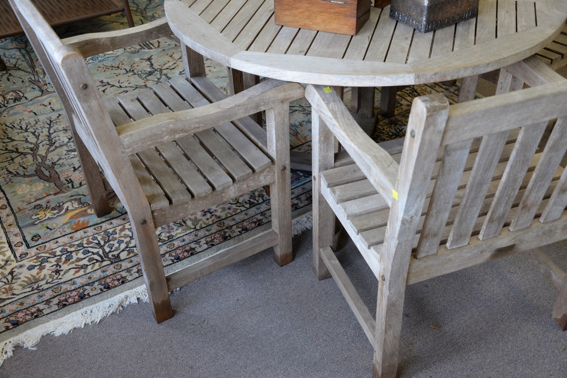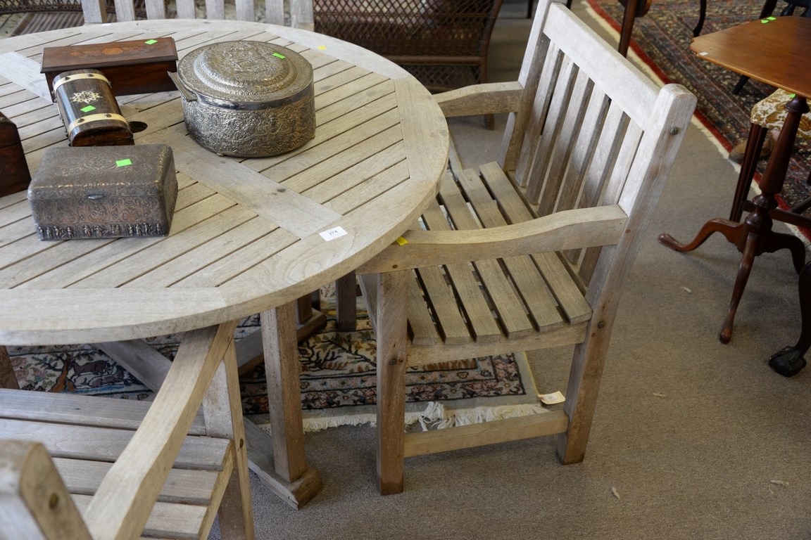 Lot 274: Hamptons teak five piece teak outdoor set including four armchairs and round table, ht. 29 in. dia. 47 in.