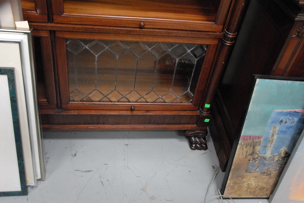 Lot 274: Mahogany barrister bookcase with six double leaded glass doors all on claw feet. ht. 48 1/2in. wd. 49in.