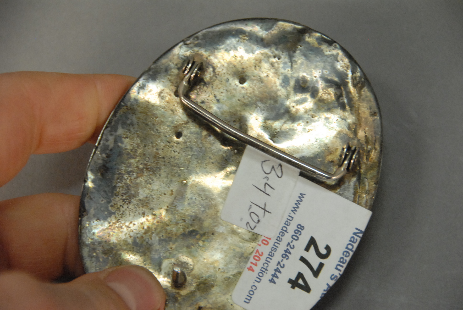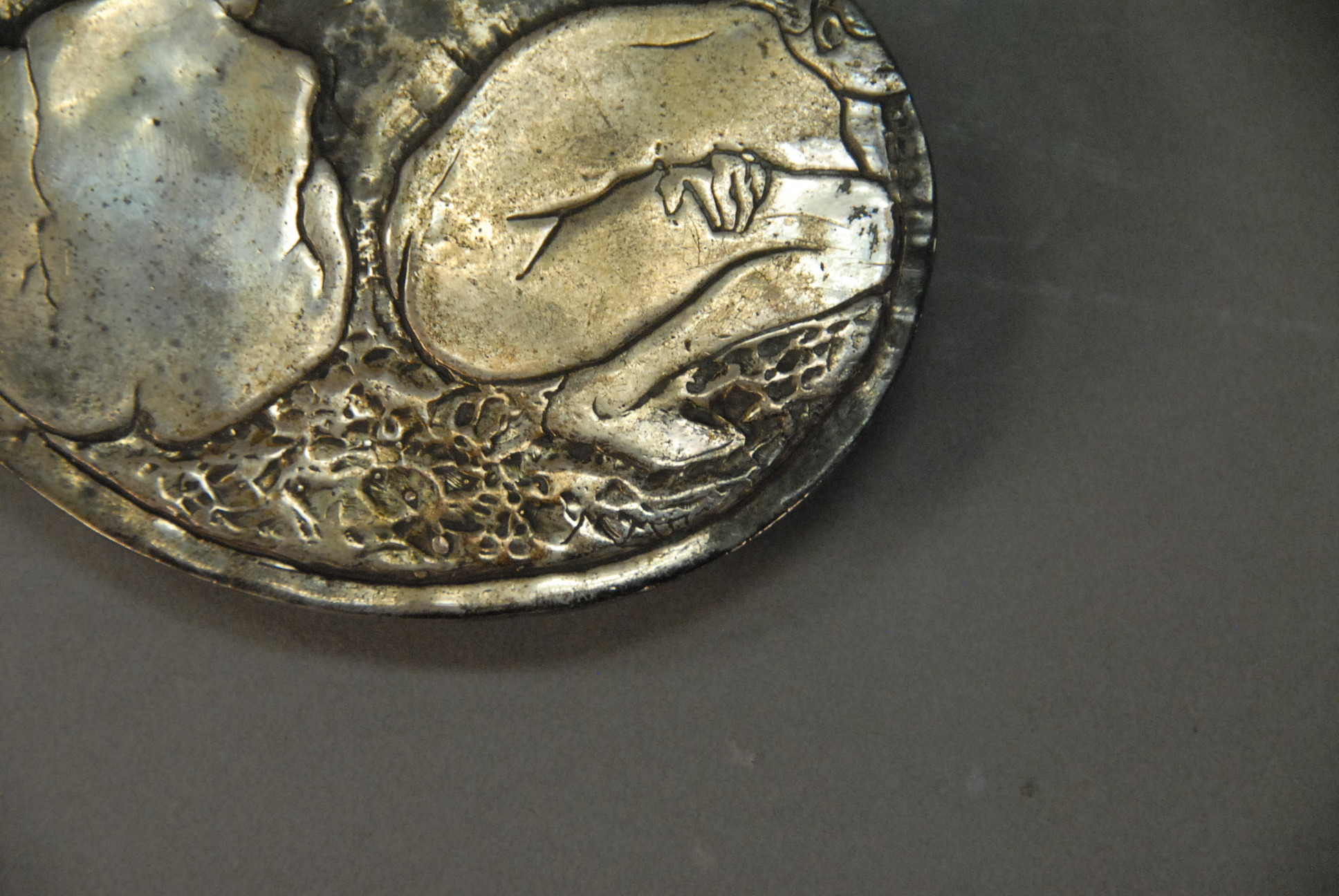 Lot 274: Silver American Indian belt buckle signed lower right having two nudes, one with turquoise earring, 3.4 t oz.