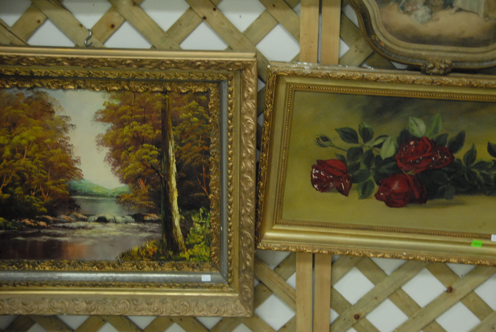 Six framed pieces to include a pair of Victorian framed engravings signed Will Henderson, pair of Victorian framed prints, oil on canvas landscape signed Blake, and oil on board still life of roses signed Lovie.