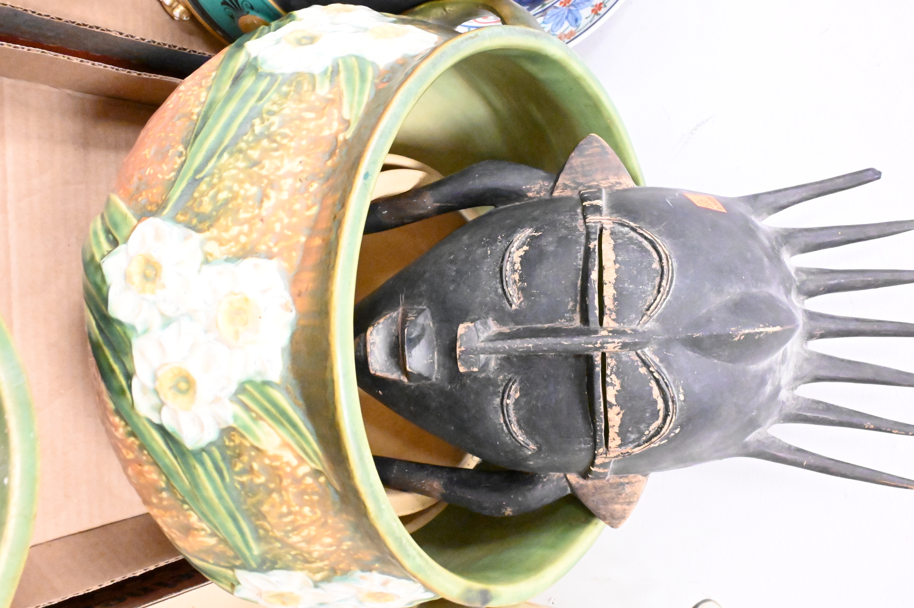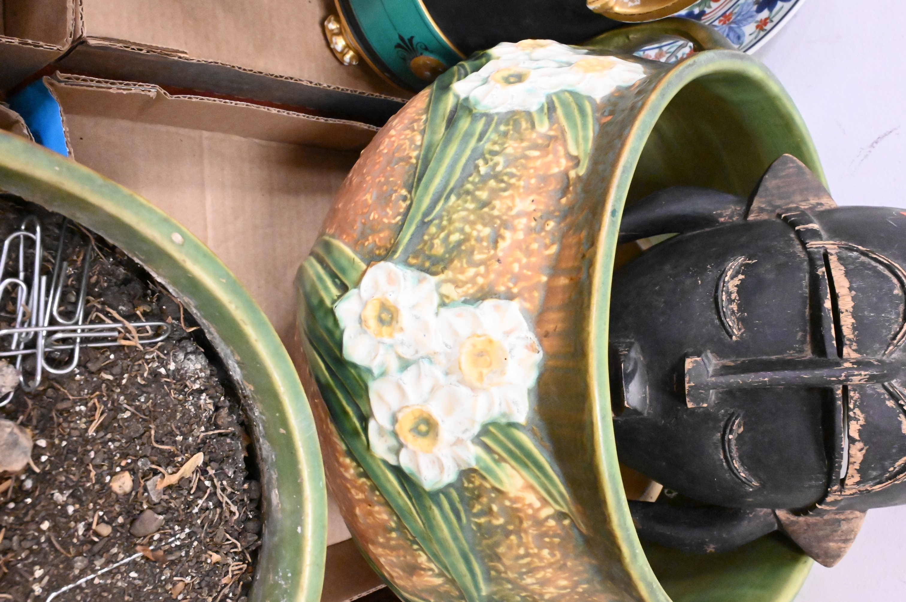 to include three Roseville pottery ceramic vases, two “Jonquil” jardinieres, both planters having double handles with raised floral motif