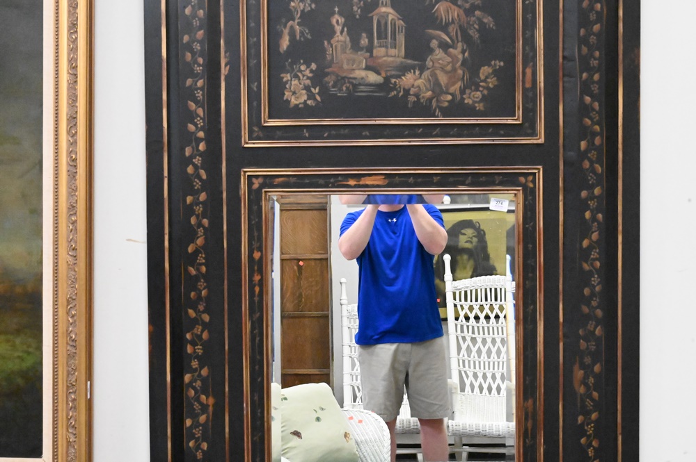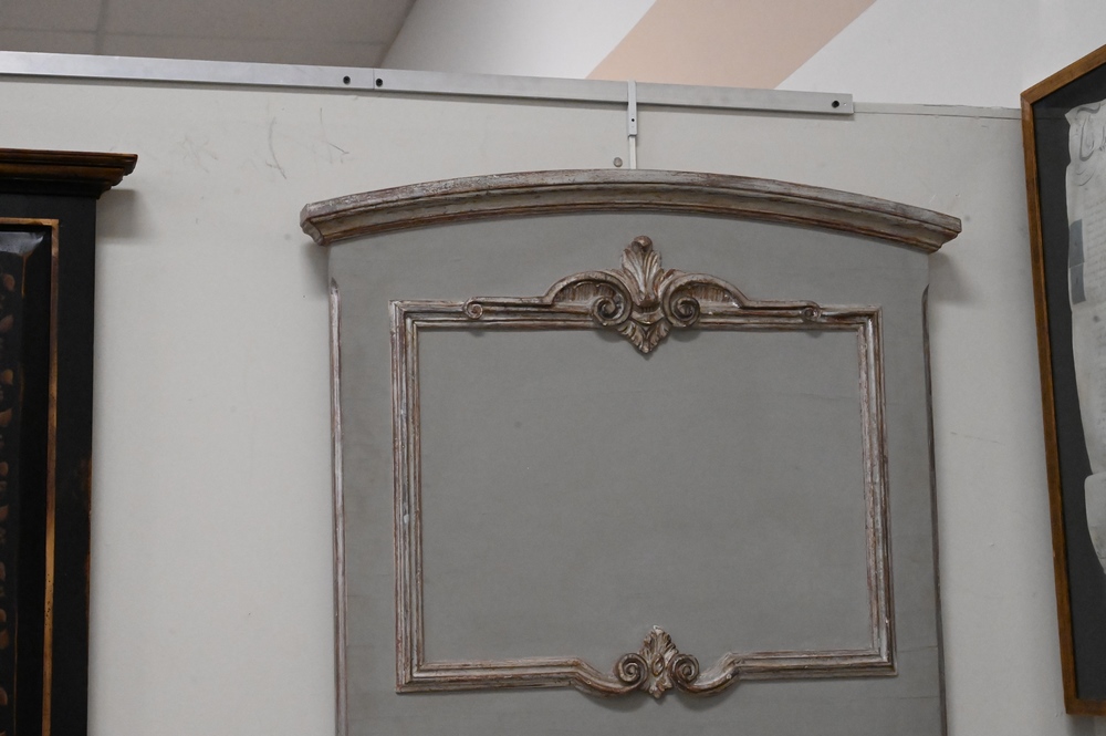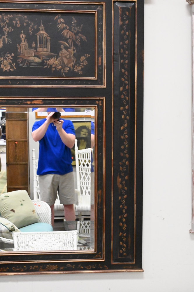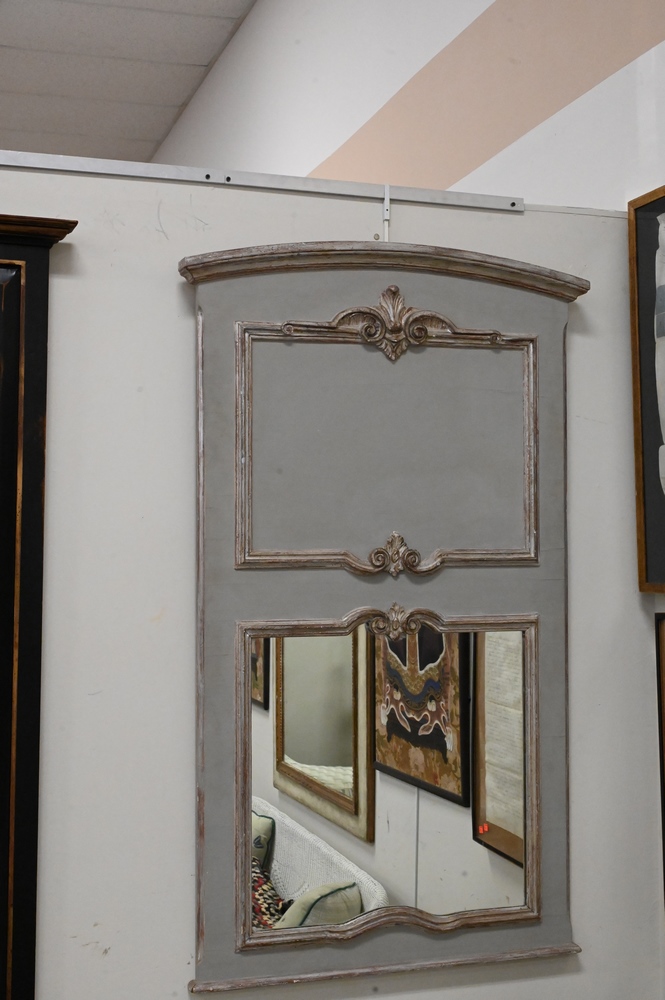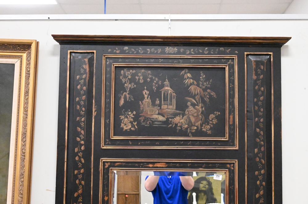 Two Contemporary Trumeau Mirrors, one having chinoiserie motif, 62″ x 45″; the other French style, 54″ x 32″.