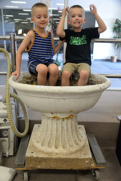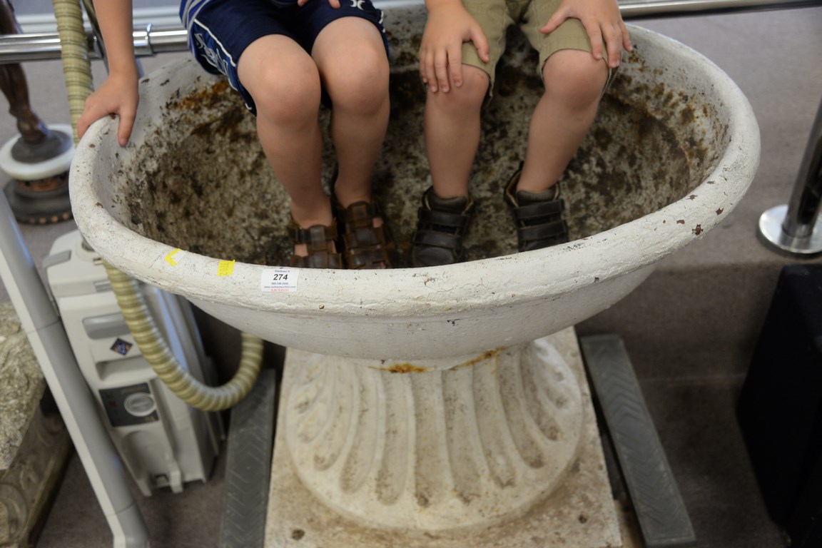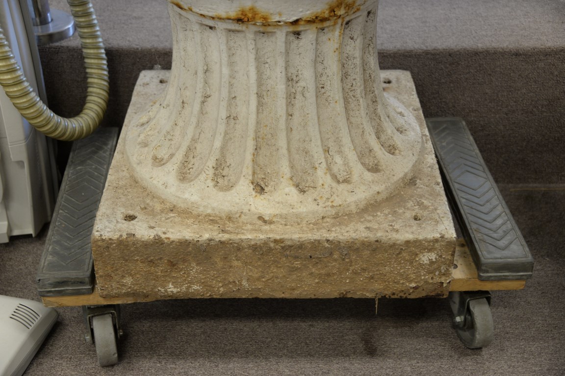 Victorian iron urn, oval form on square base. ht. 29 in. top: 25 x 33