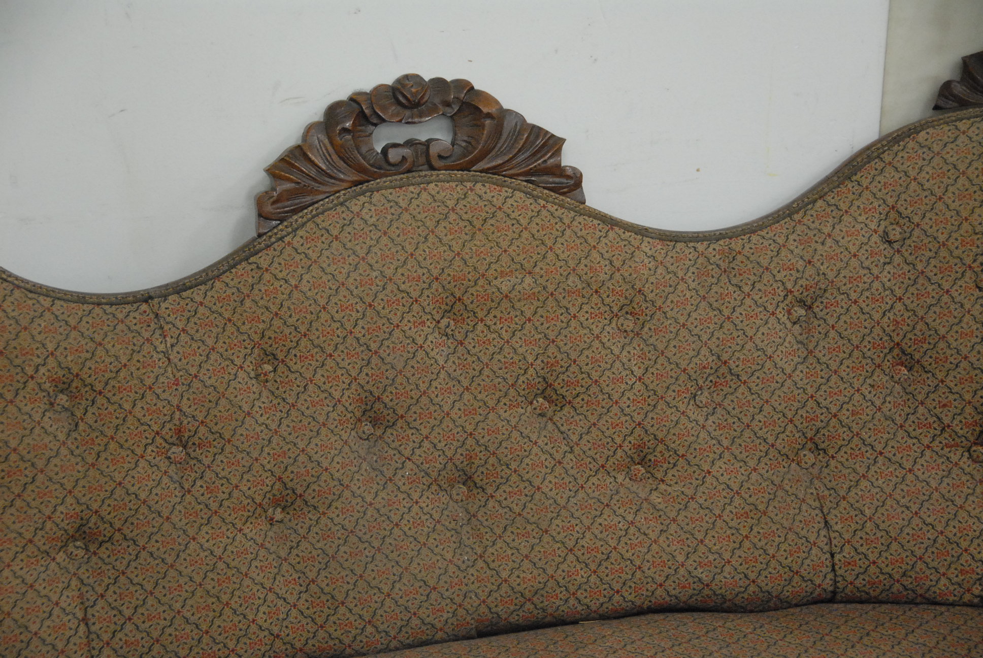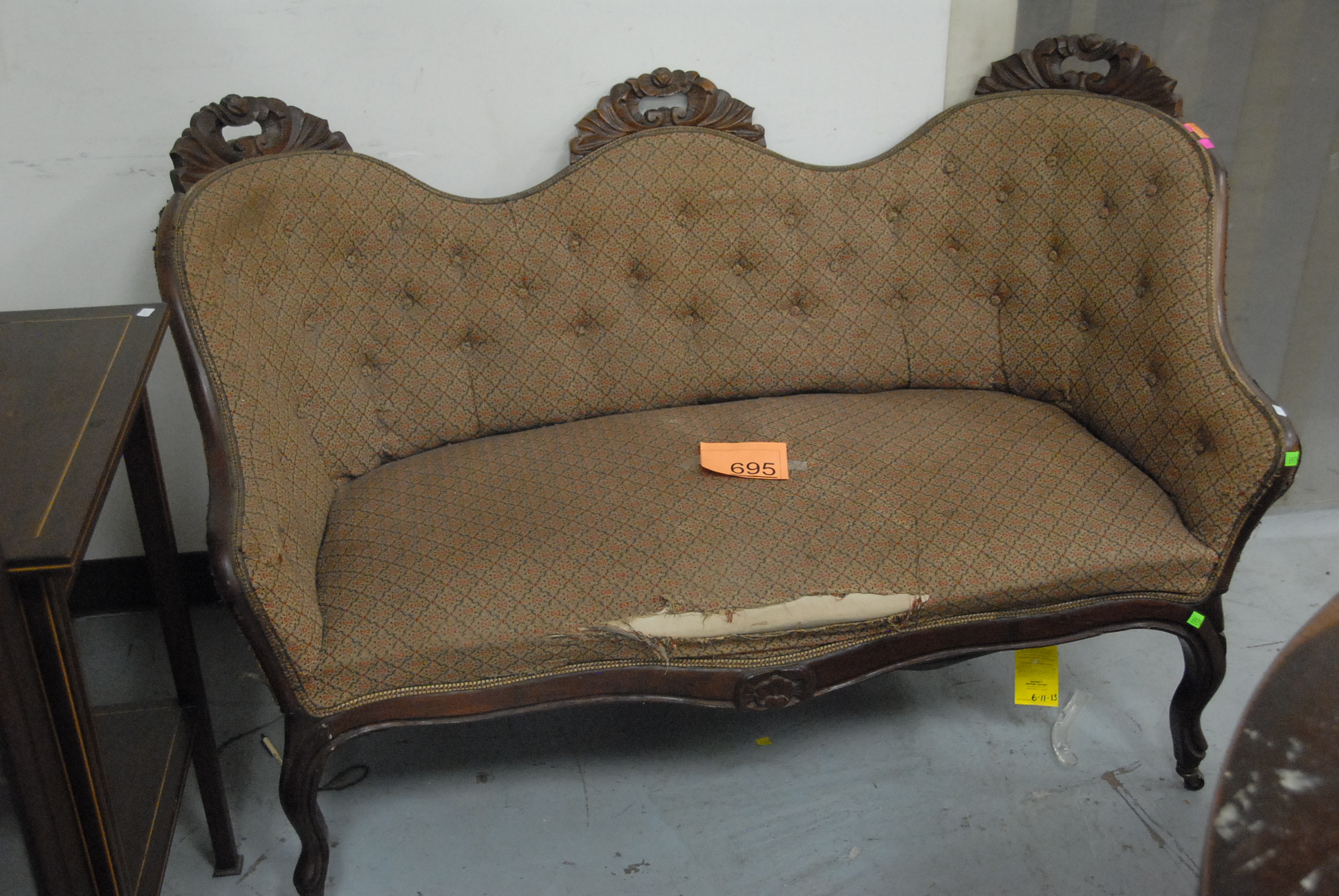 Six piece lot to include dovetail walnut lift top box, ladies chair, pine chest, one drawer stand, inlaid three tier stand missing foot, and Victorian loveseat.