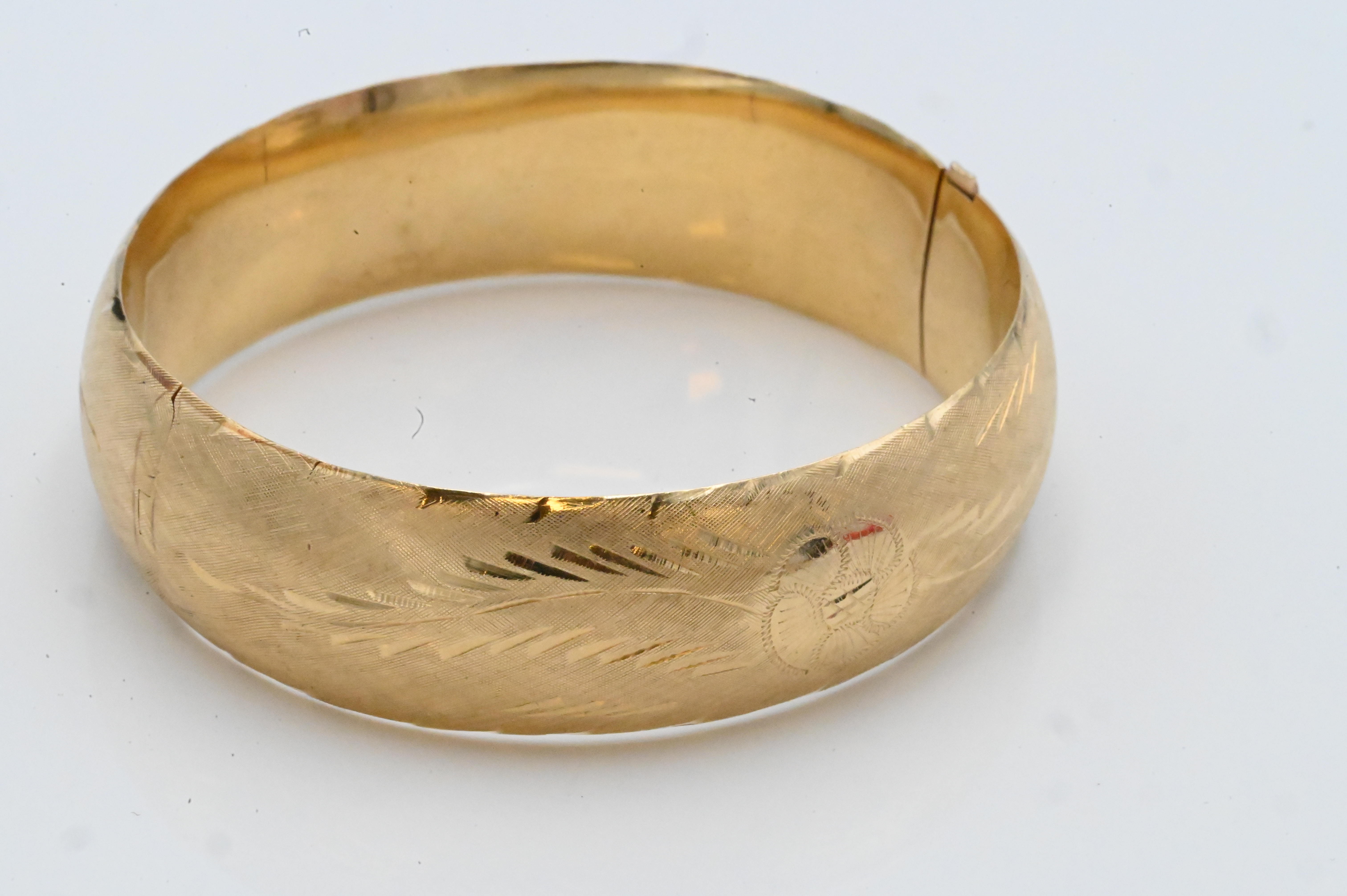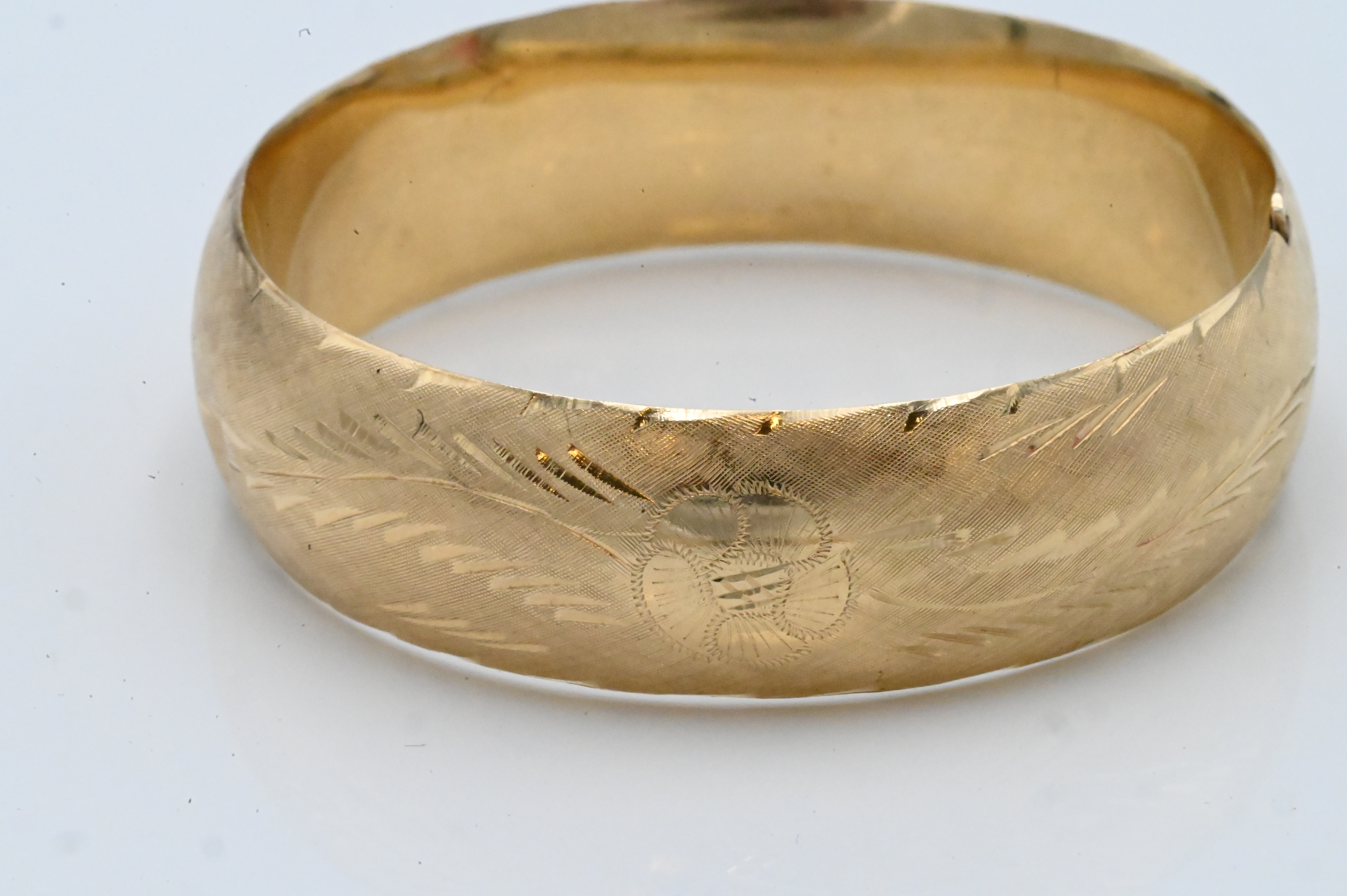 14 Karat Yellow Gold Bangle Bracelet having etched floral motif approximately 7 inches, 23 grams Provenance: An Estate from Redding, Connecticut.