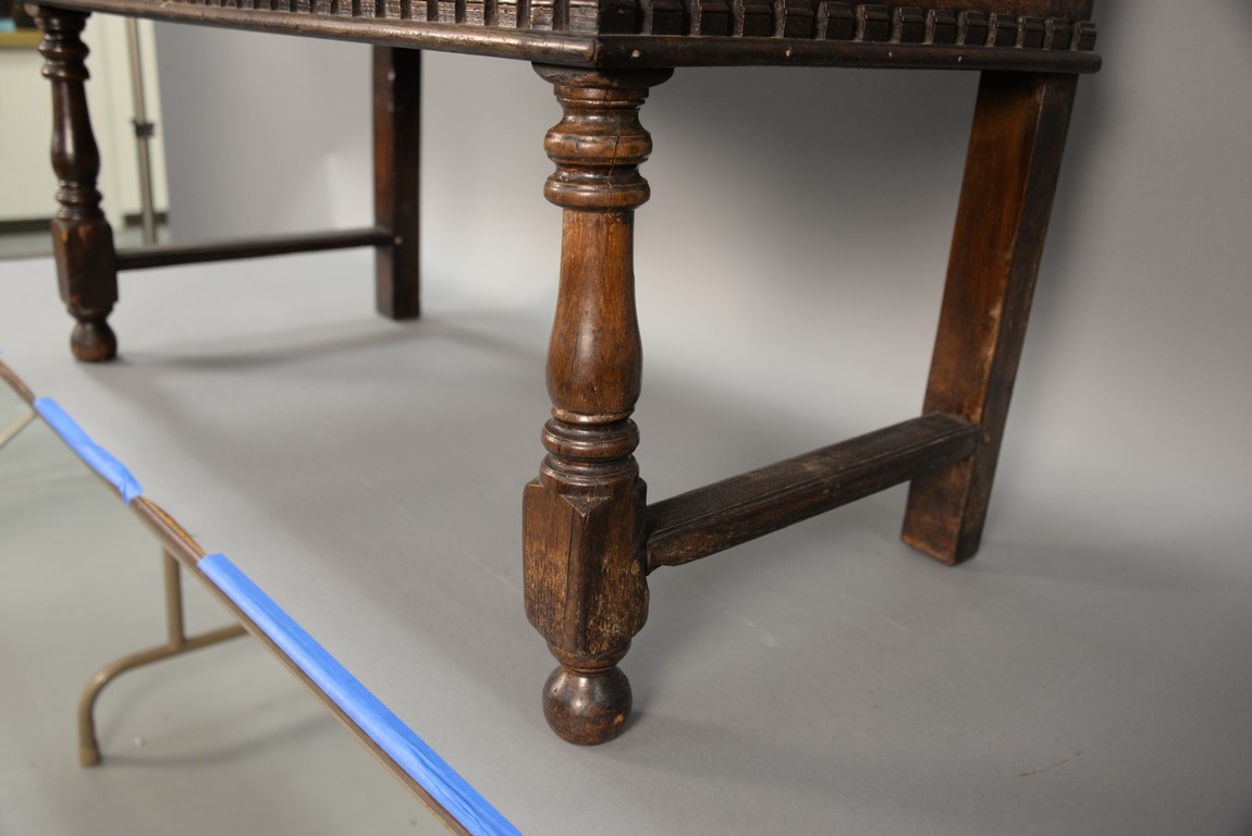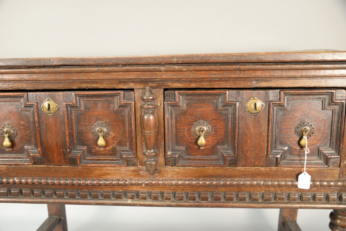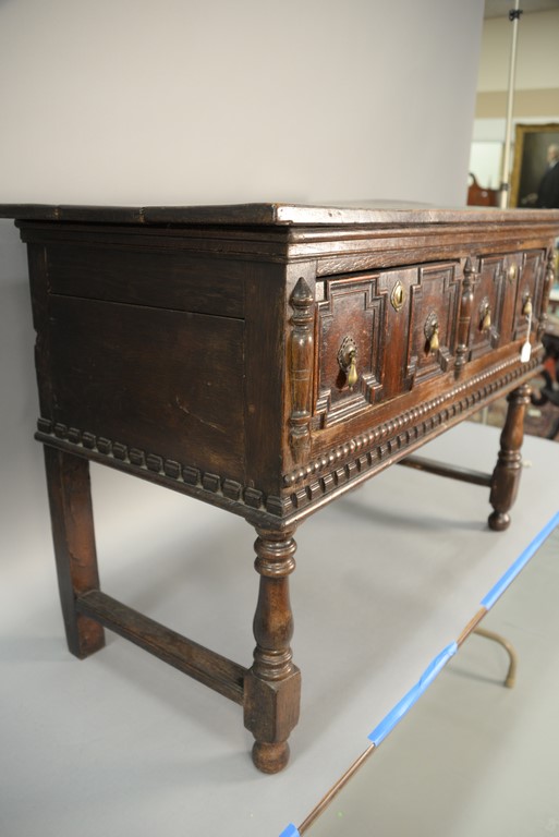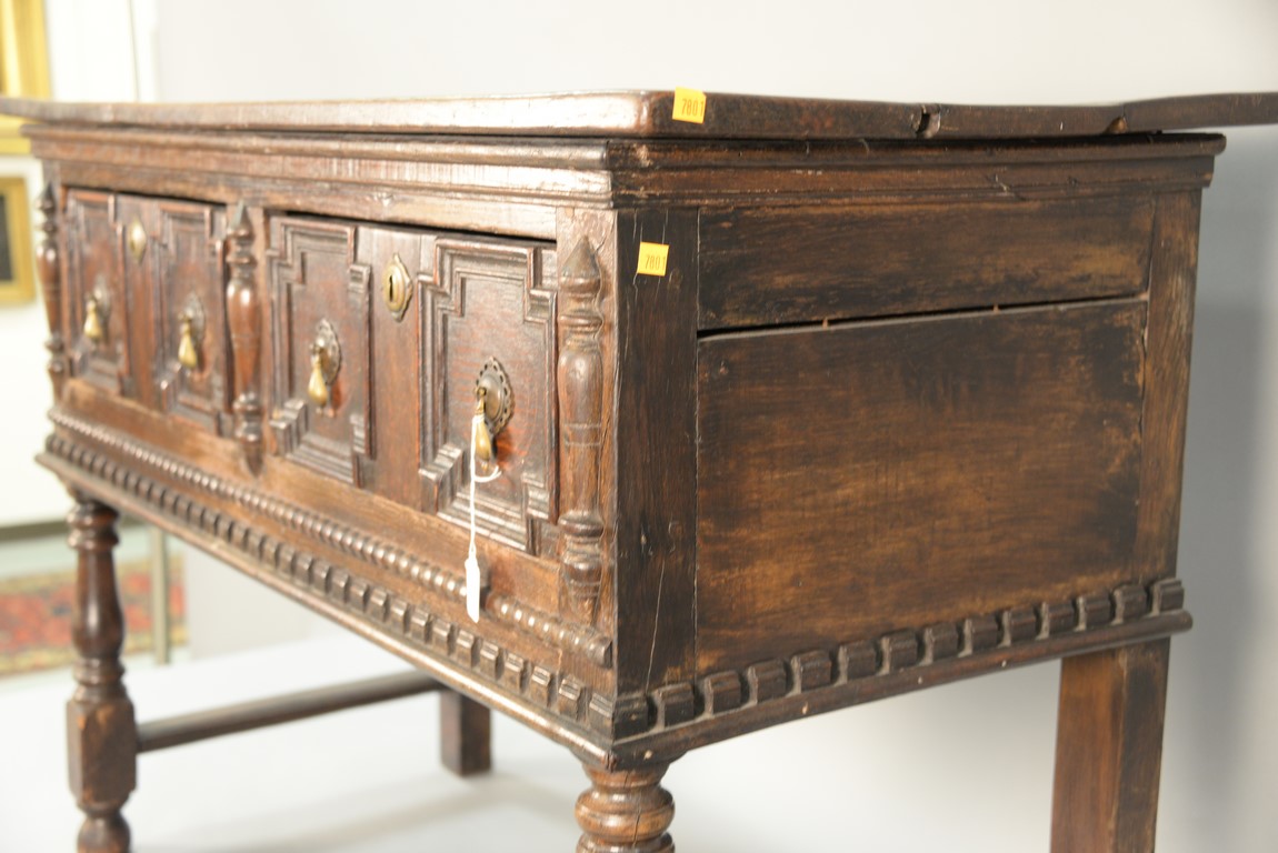 Lot 275: 17th/18th Century Jacobean Welsh two drawer oak sideboard server, having rectangular top above a pair of geometric paneled drawers o…