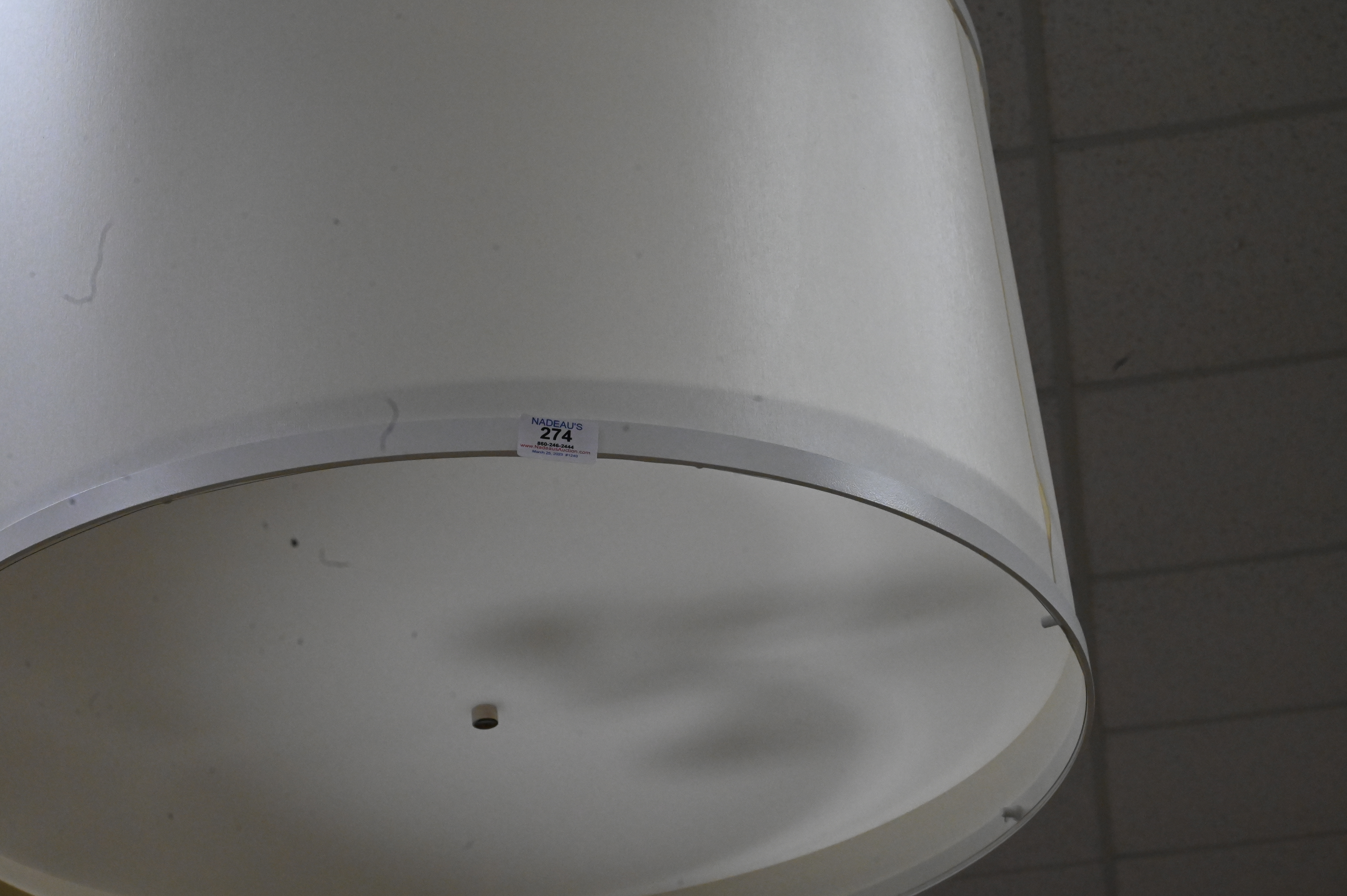 Archetype Pendant Hanging Light, having drum shade and polished nickel stem, height 36 inches, diameter 28 inches.