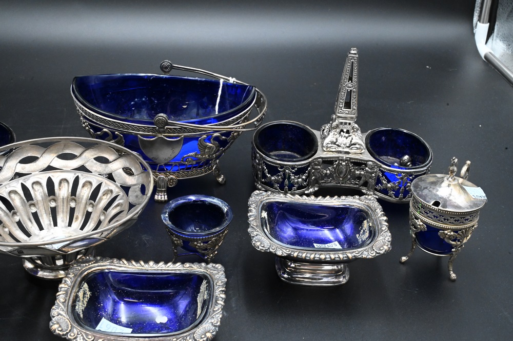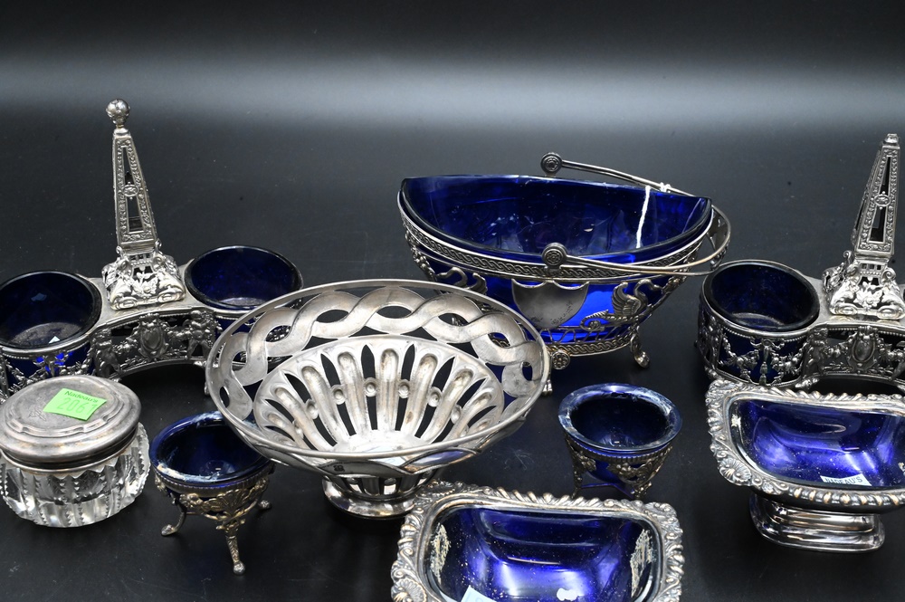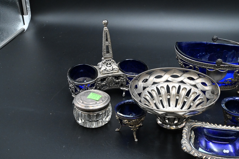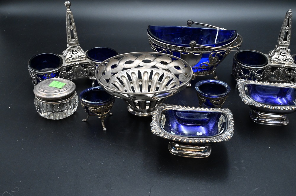 Lot 275: Cobalt Lined Lot, to include a pair of Sheffield silver plated salts, silver sugar with swing handle, along with a pair of double salts, etc.