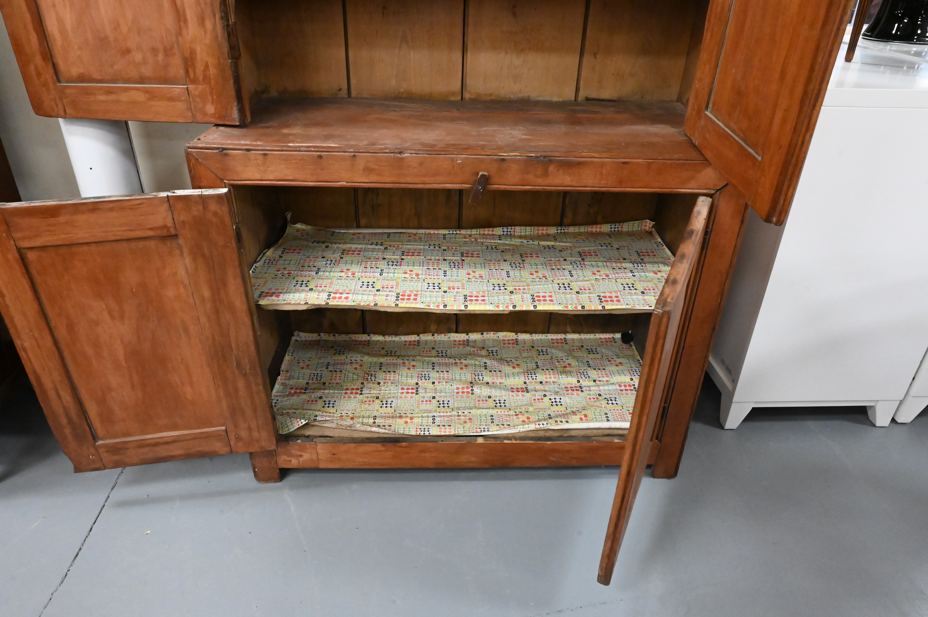 having two top doors and three shelves, lower section having two doors and one shelf
