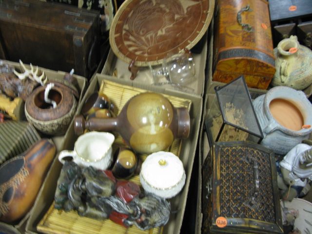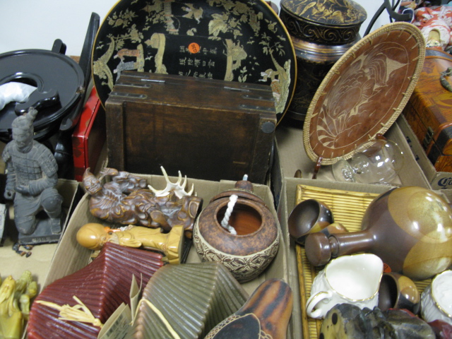 Eight box lots to include Oriental soapstone figures, ceramic figures, Oriental style charger, decorative knickknack and accessories.