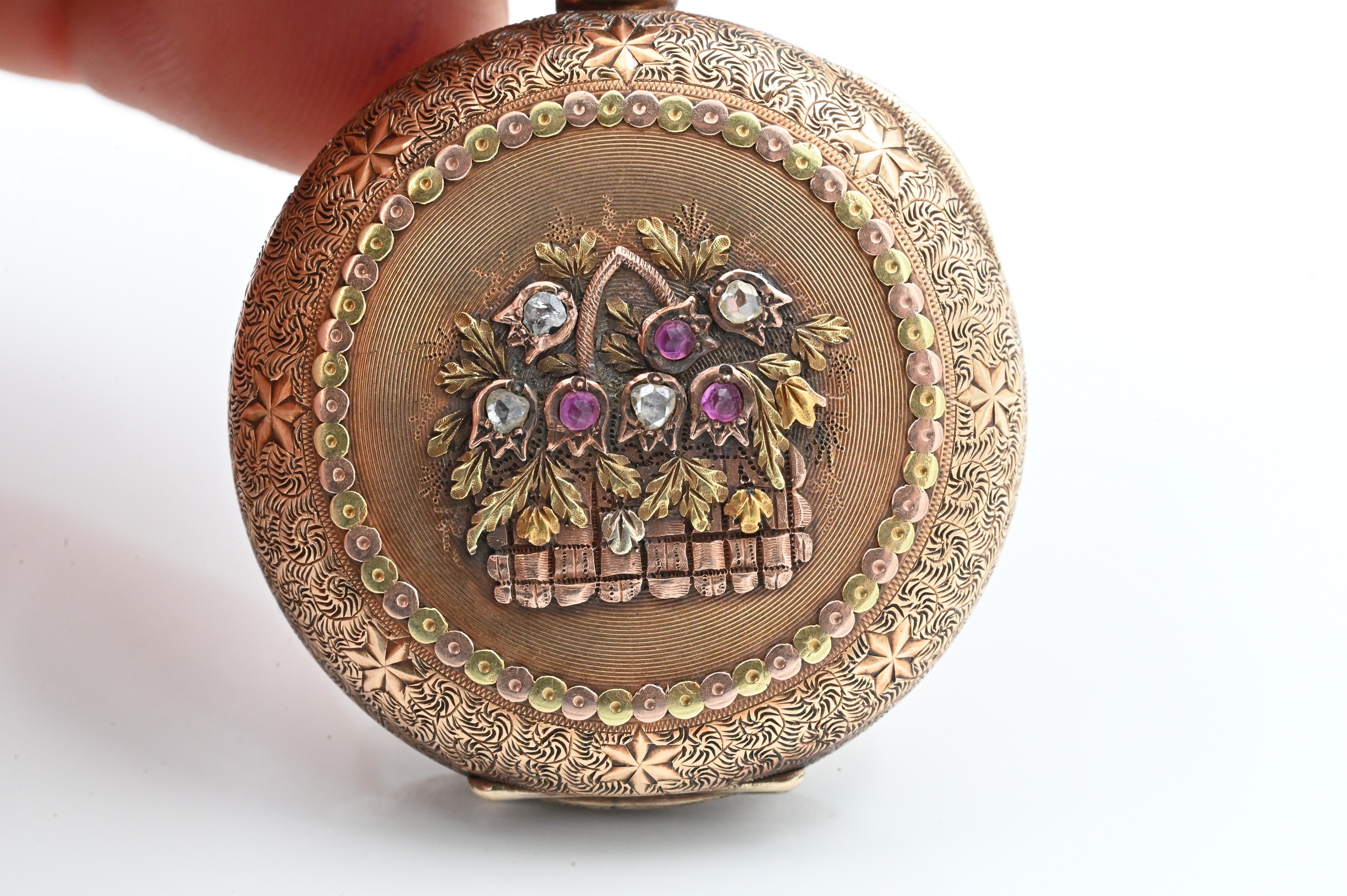 having back cover with basket of flowers, diamonds and rubies of multi color, gold with shield on front cover, 39.7mm, total weight 63.9 grams