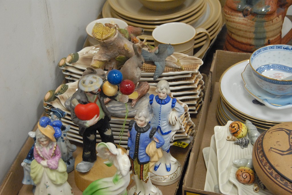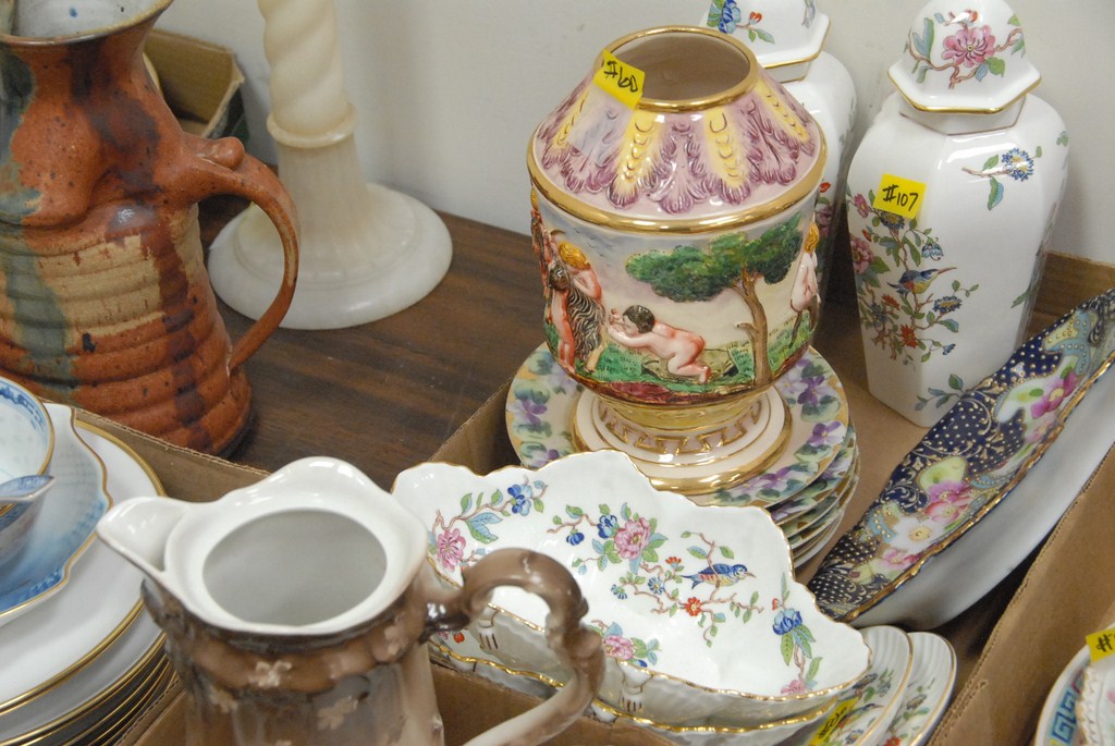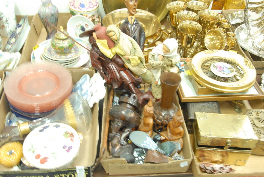 Five box lots pair of covered jars, china, glassware, figures, alabaster candlestick, etc.