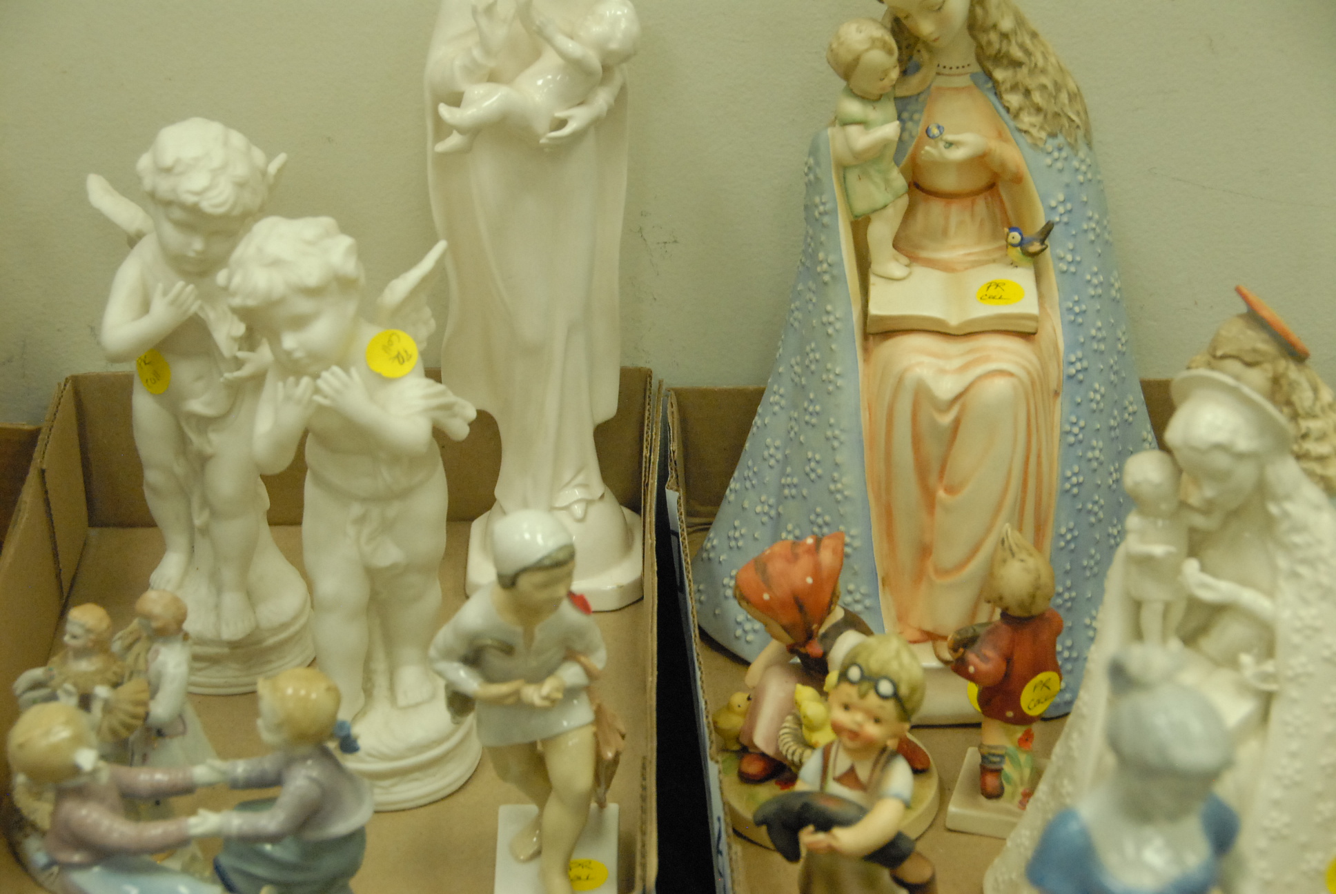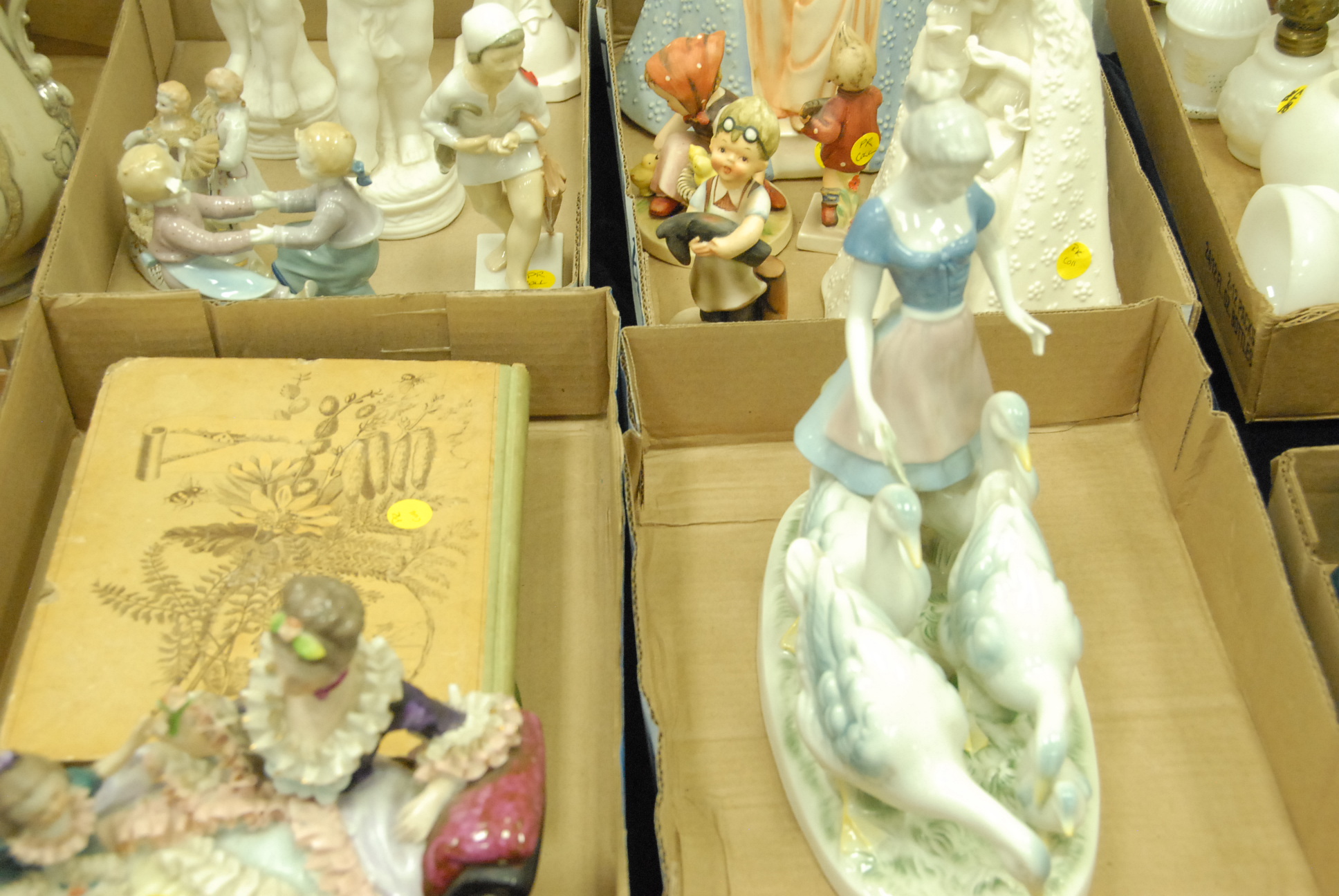 Four box lots including porcelain figures, bisque figures, six Hummel figures.