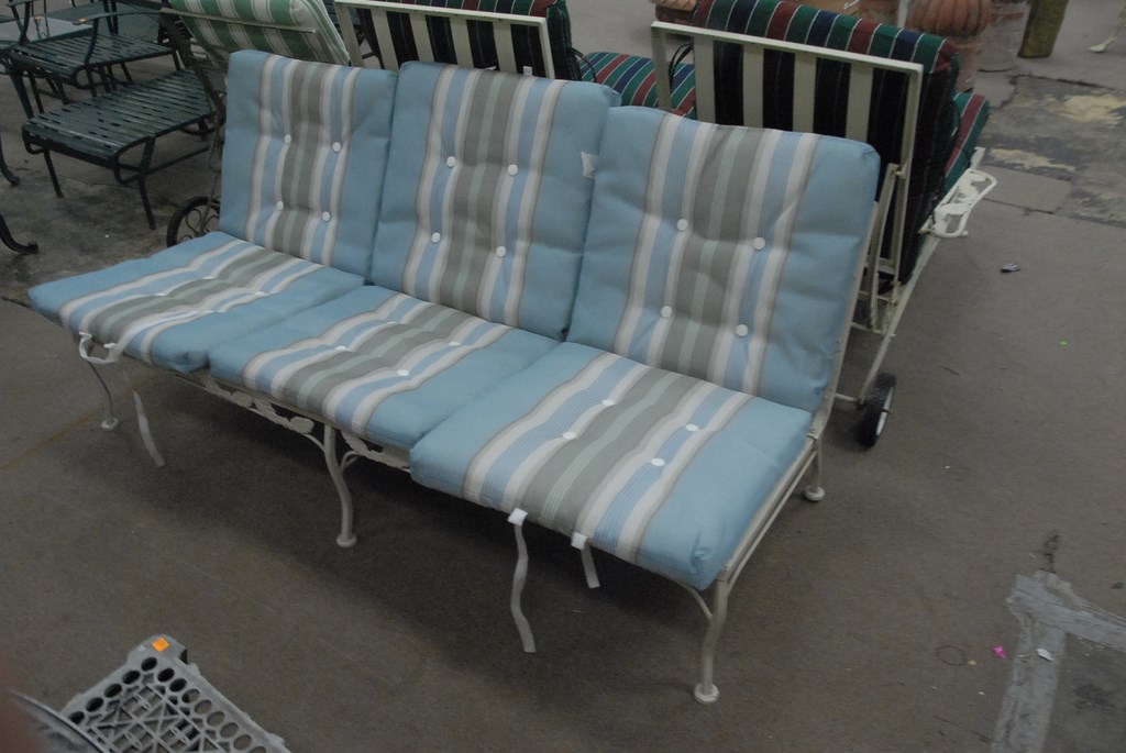 Four piece lot: three outdoor iron lounges with cushions and sofa.
