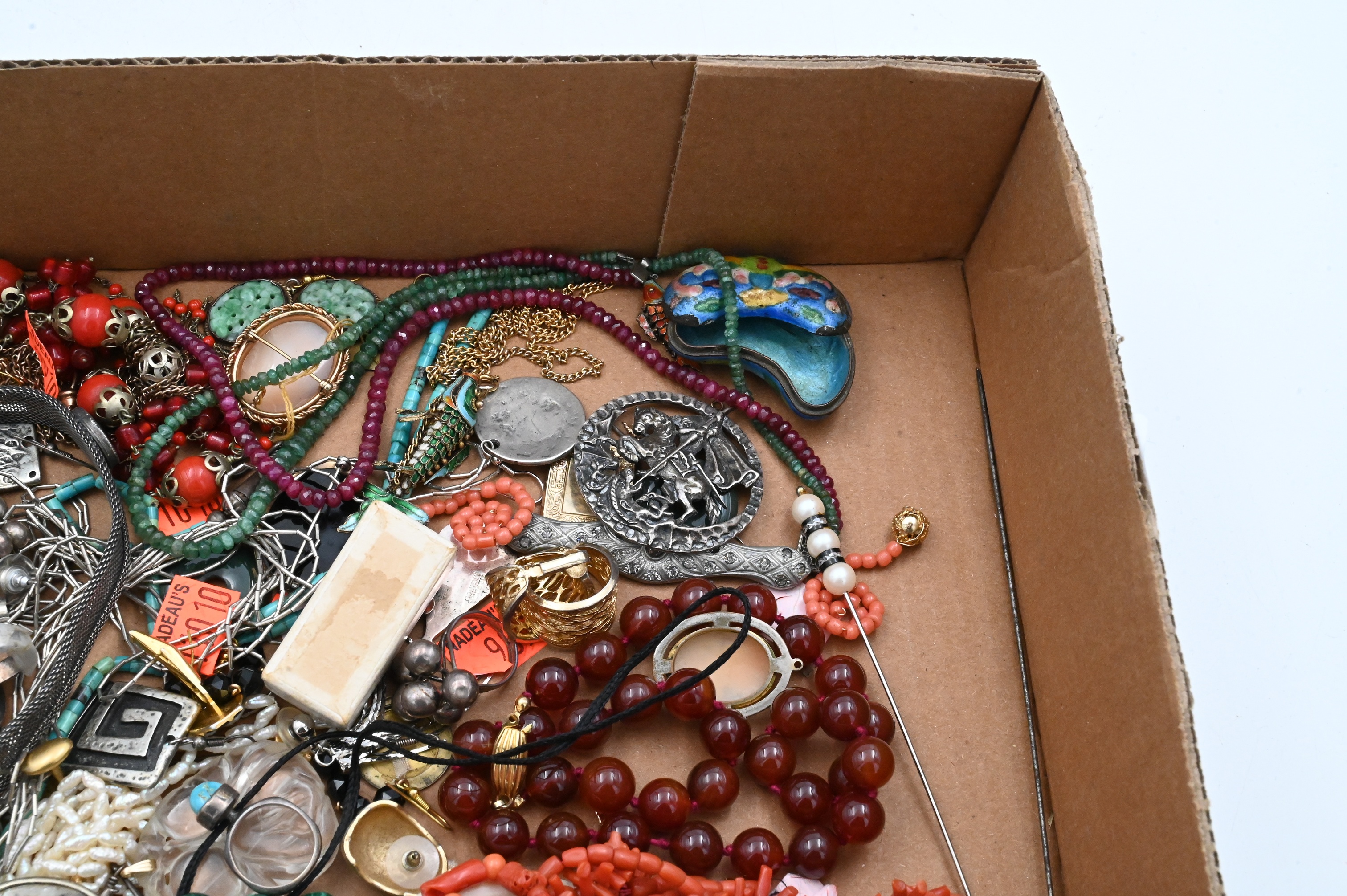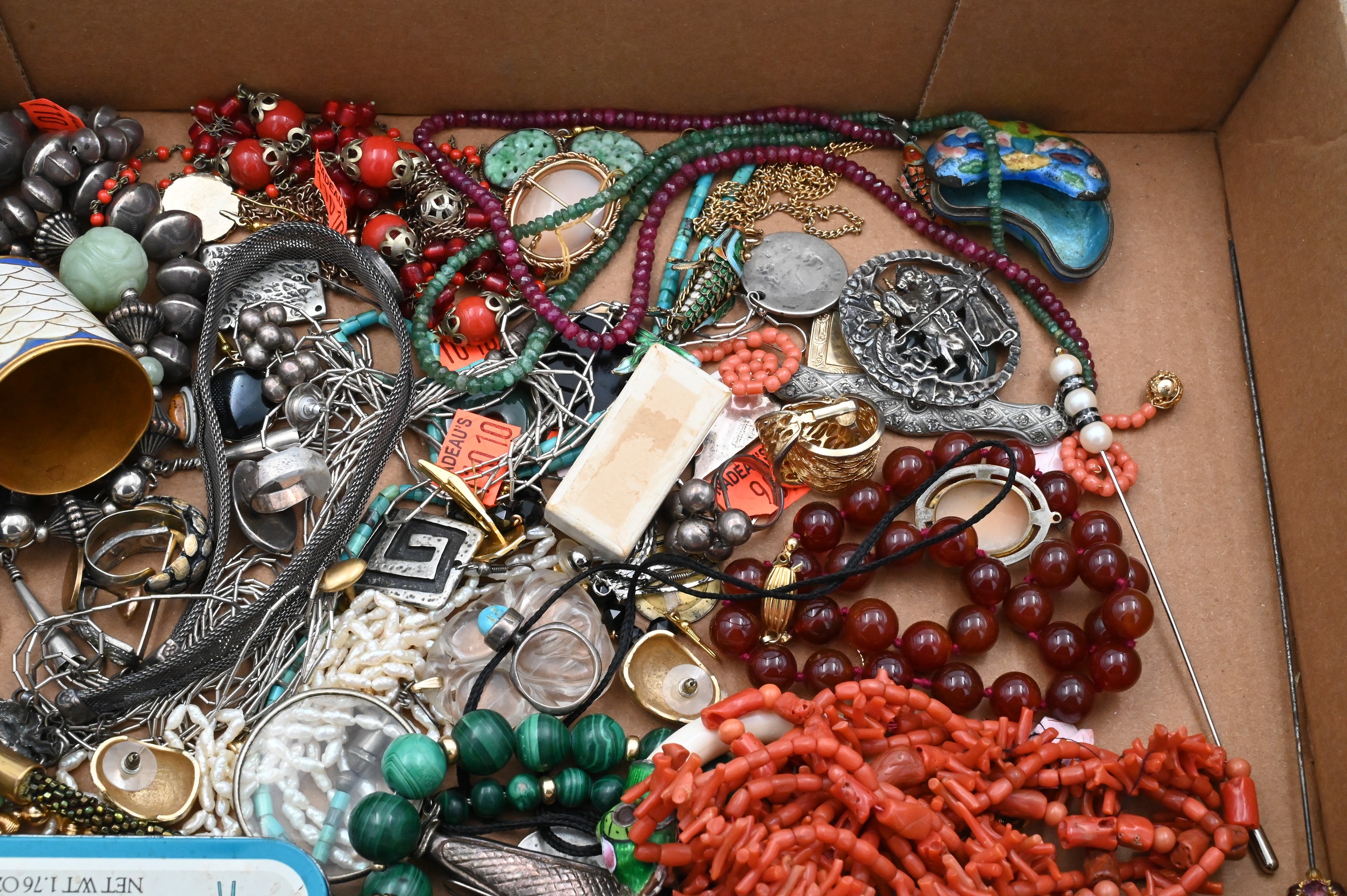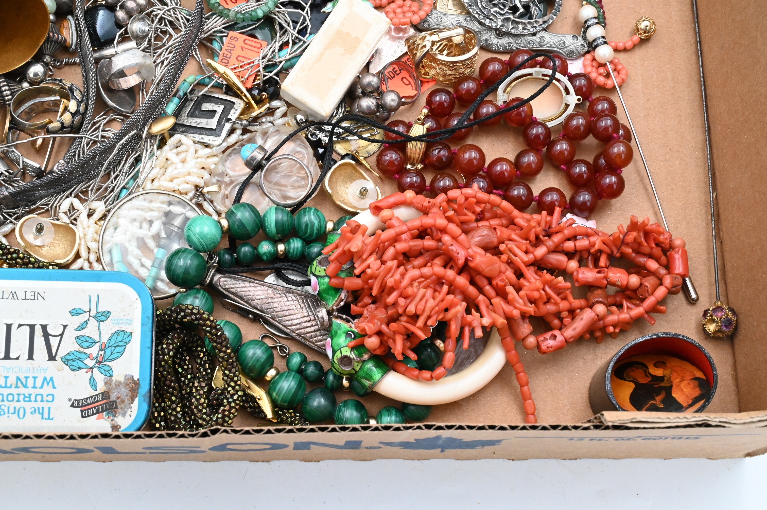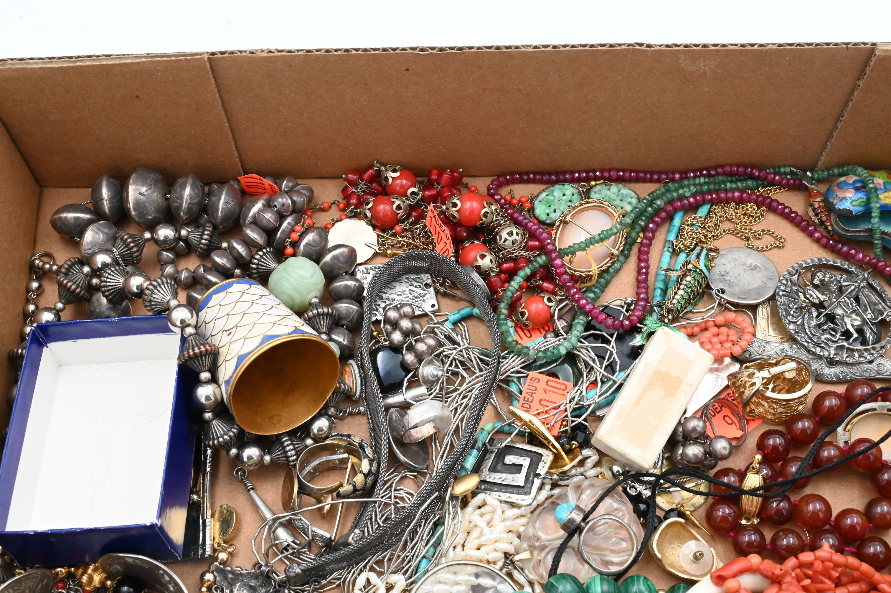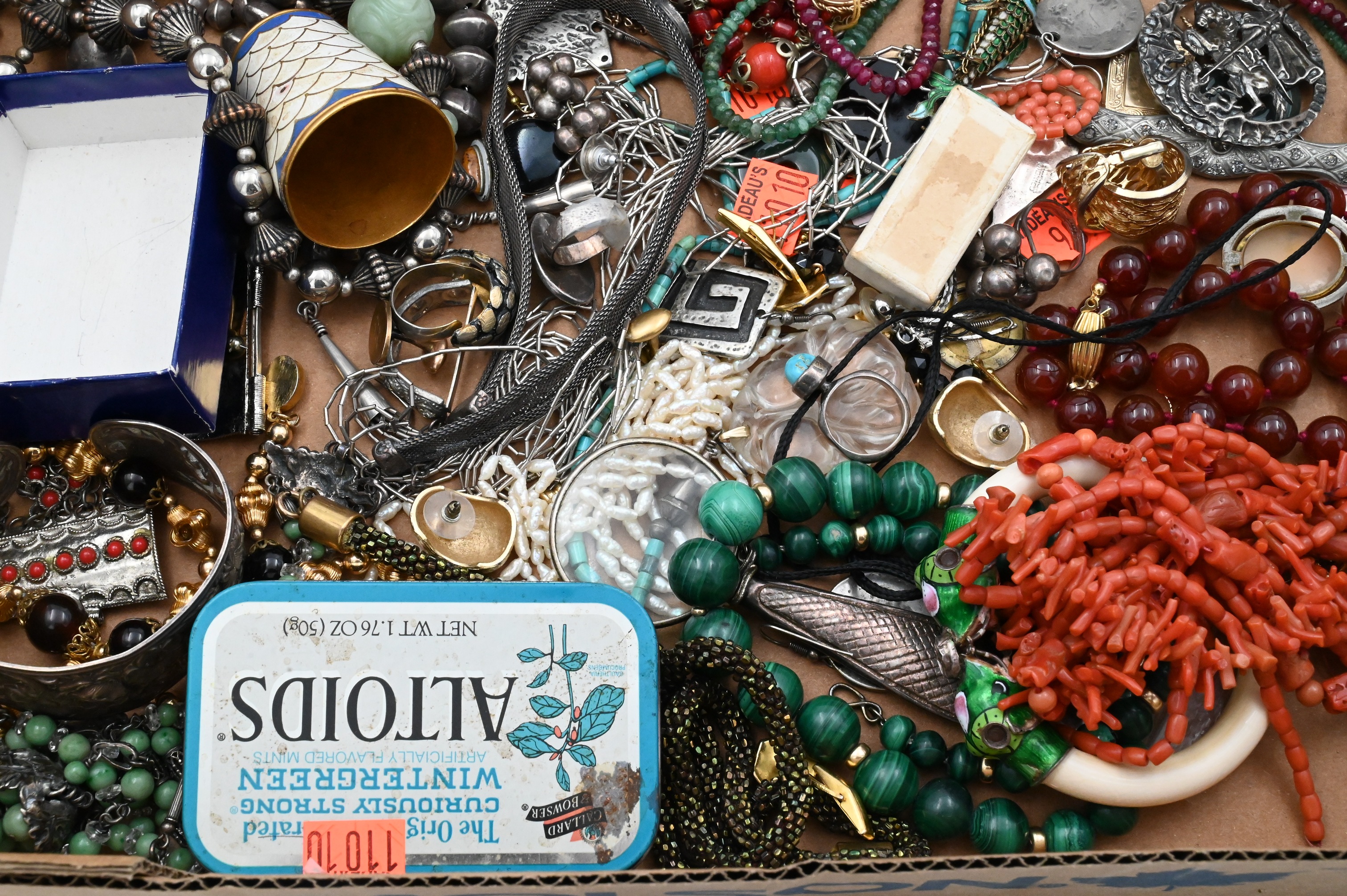 to include Native American silver, Victorian carol, and bend necklaces, earrings, articulated enamel fish, stone beads, etc., coral lapis, harstone and enamel pieces