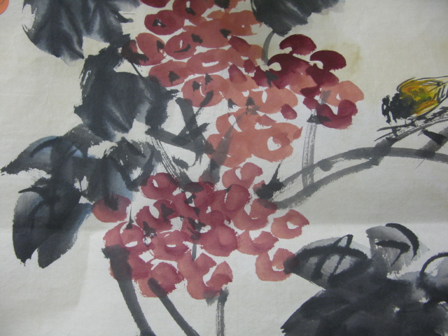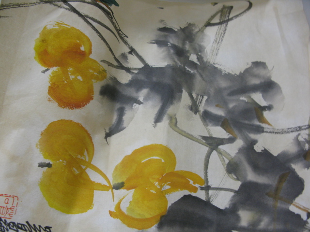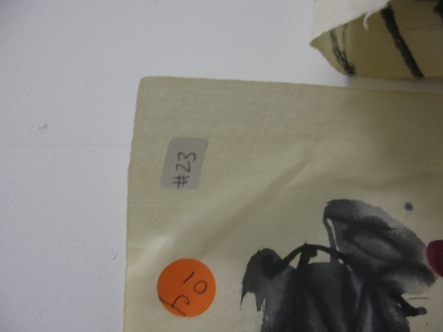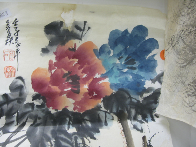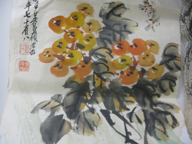 Group of five Oriental paintings on tissue small all with blossoming trees.