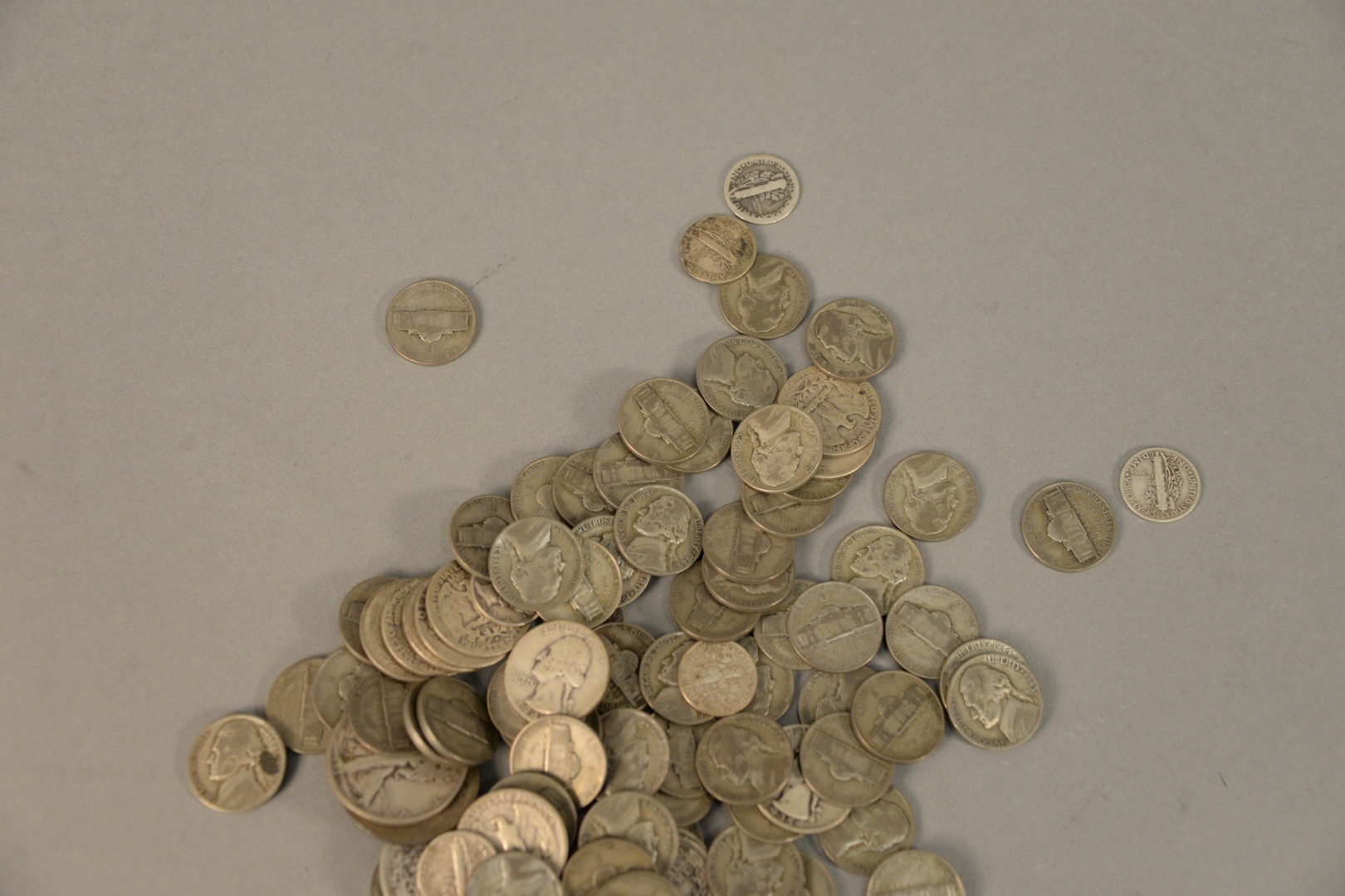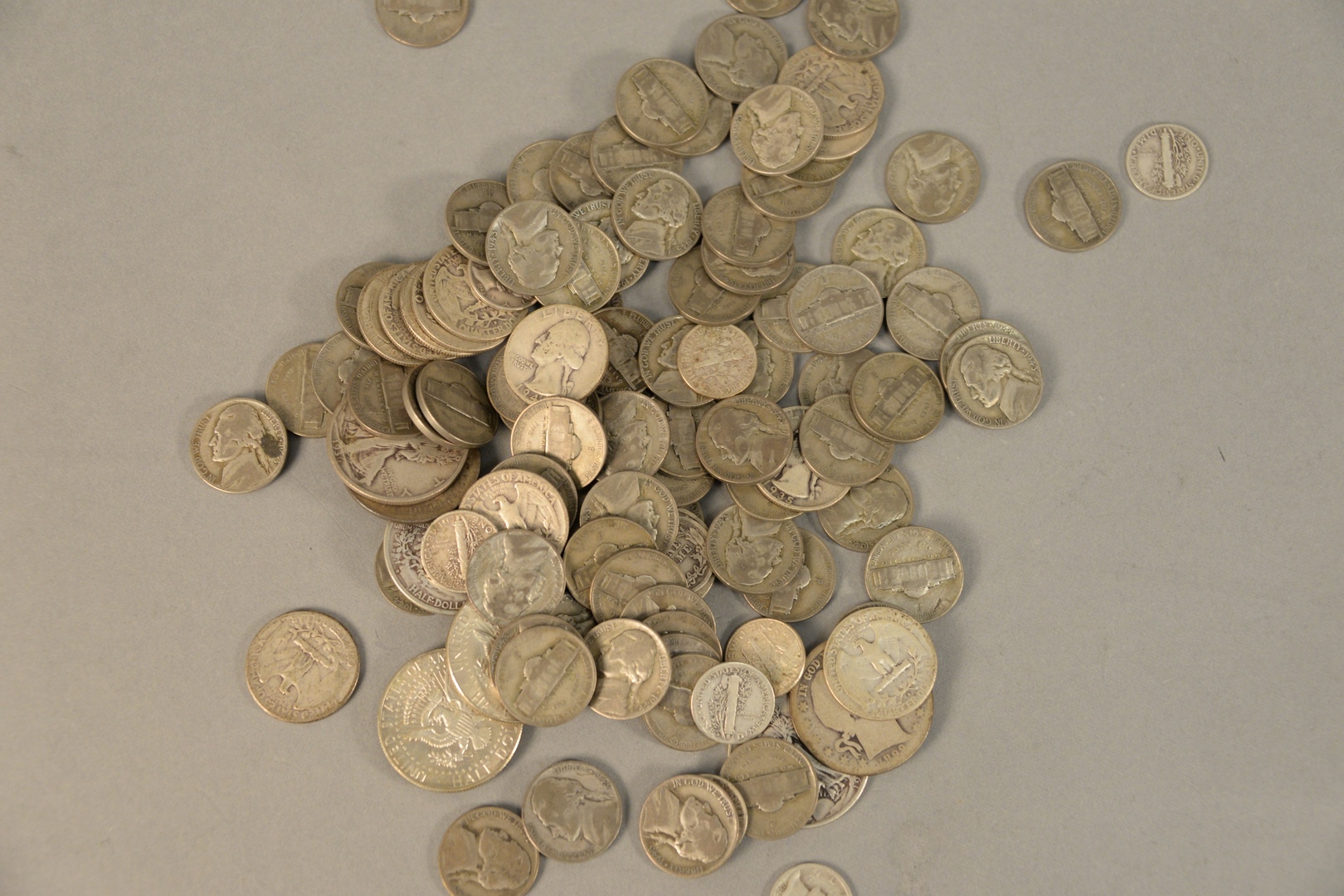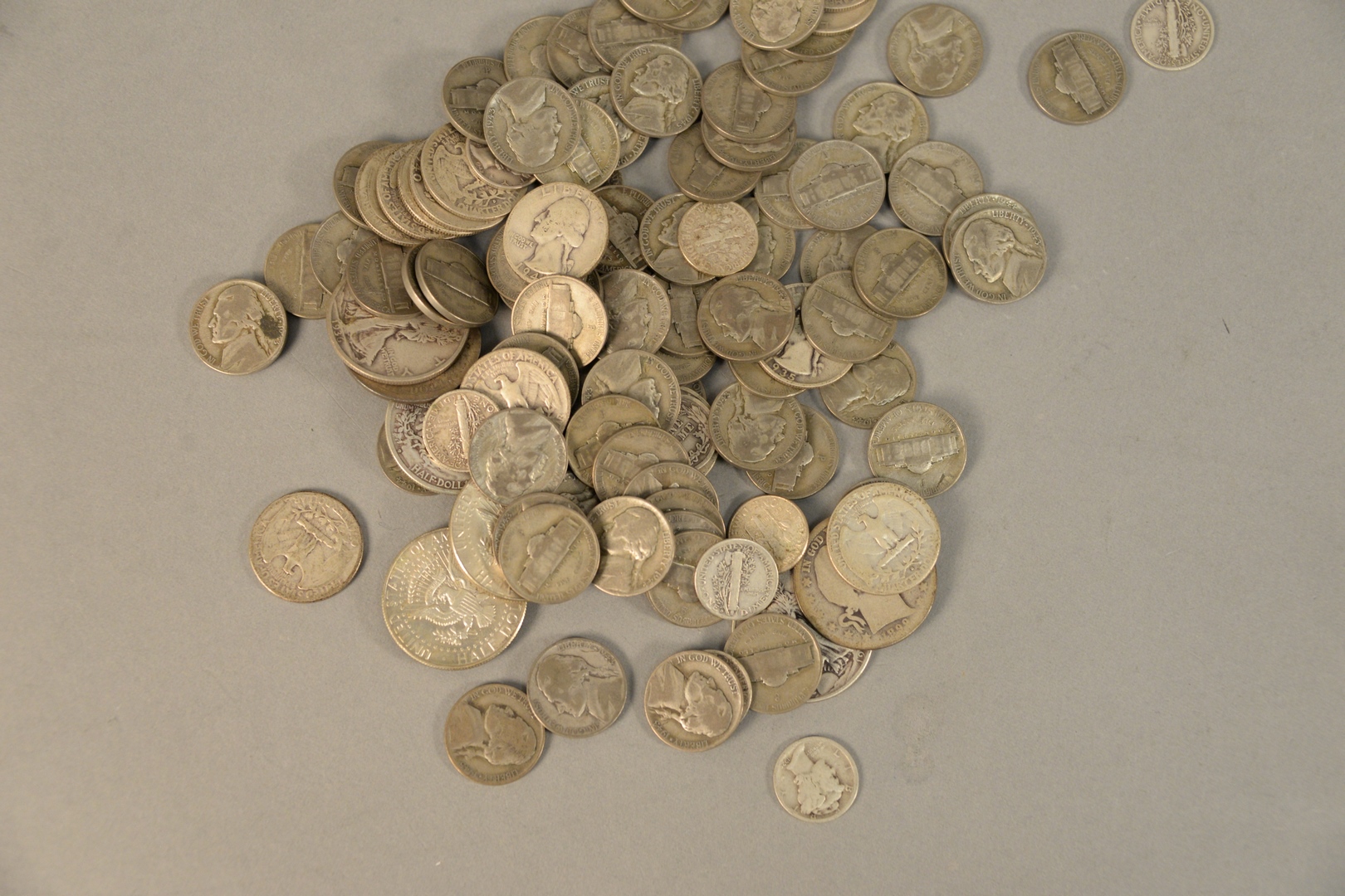 Lot 275: Mixed lot of silver coin to include 80 war nickels and 7.20 face 90% U.S. coin plus 1.00, 40%.