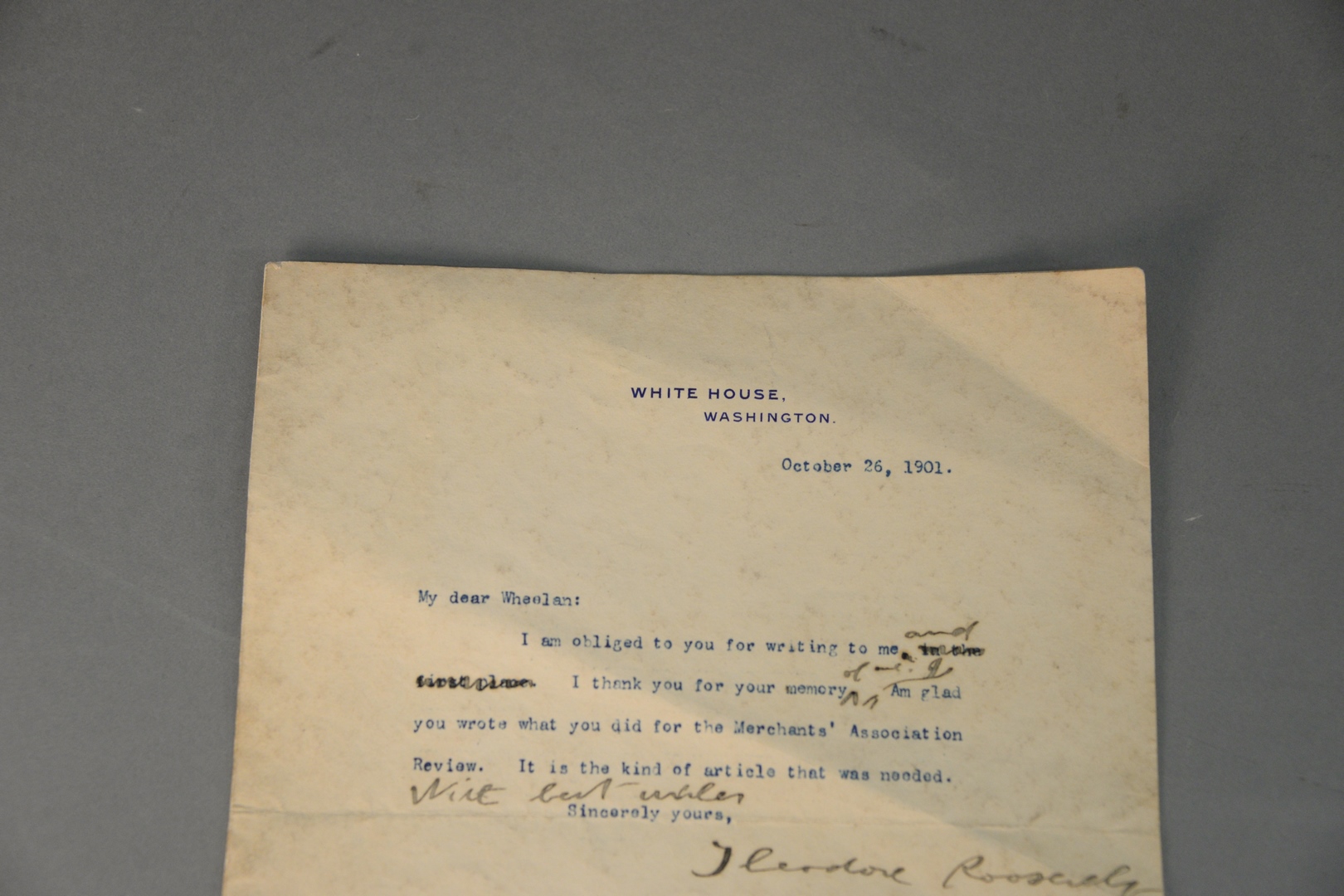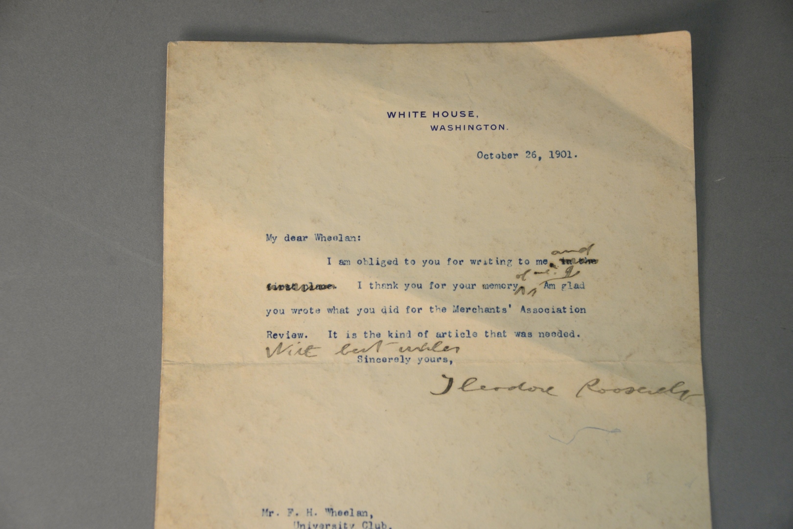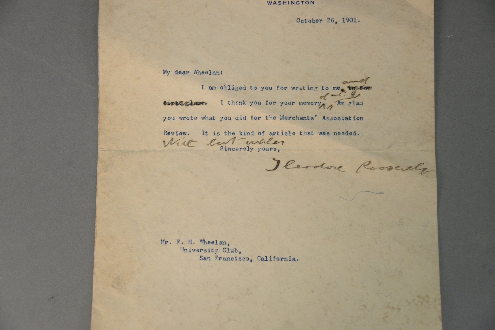 addressed to Wheelan, signed by Theodore Roosevelt and corrected by Roosevelt