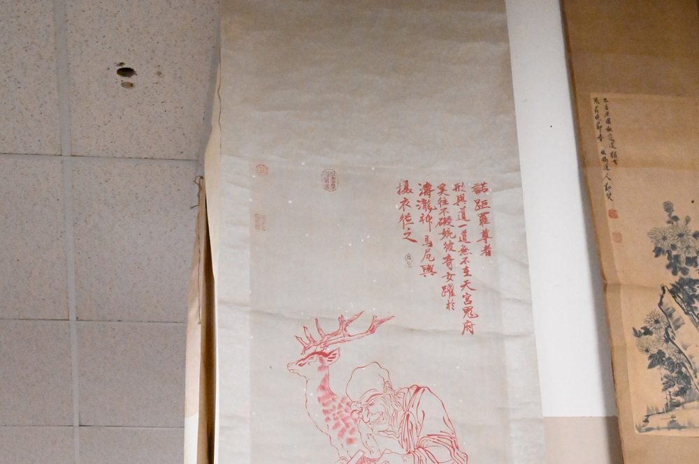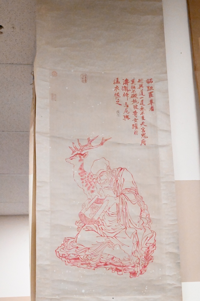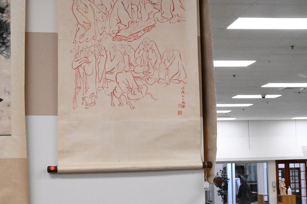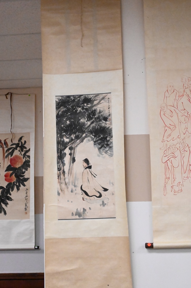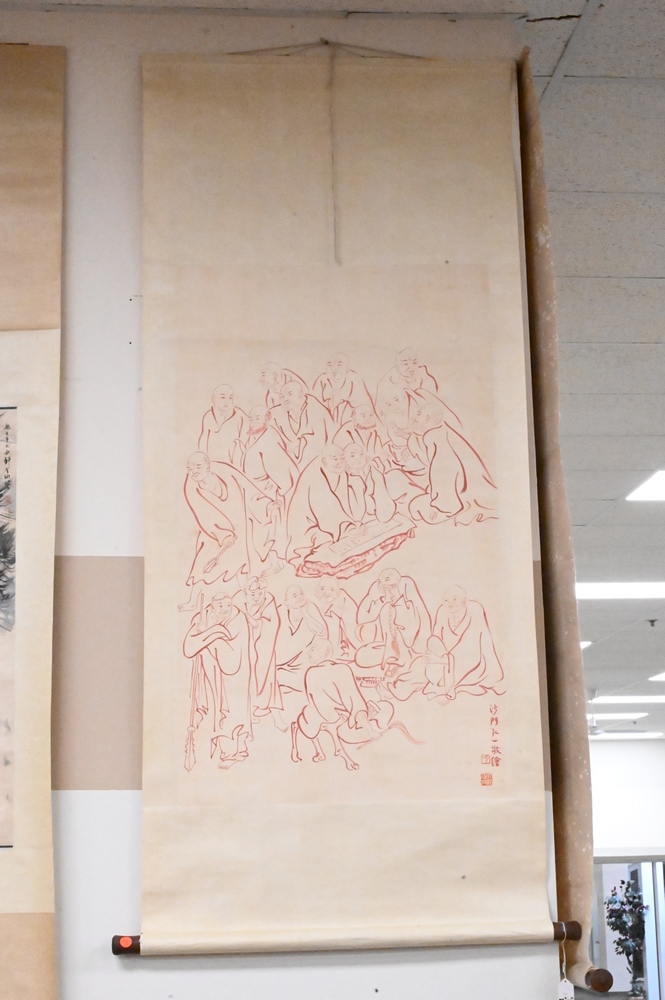 Lot 275: Three Chinese Scrolls, watercolors, to include one of scholars, image size 37″ x 12″; one of figures kneeling at a tree, 30″ x 13″; along with scholar and deer; all with characters and seals.