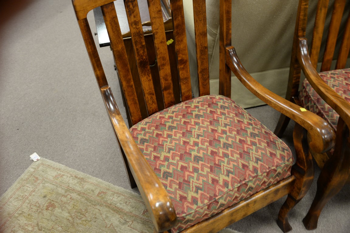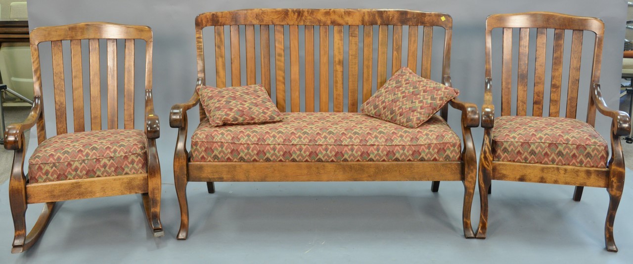 Lot 275: Three piece flamed birch set with settee, rocker, and armchair. settee lg. 54in.