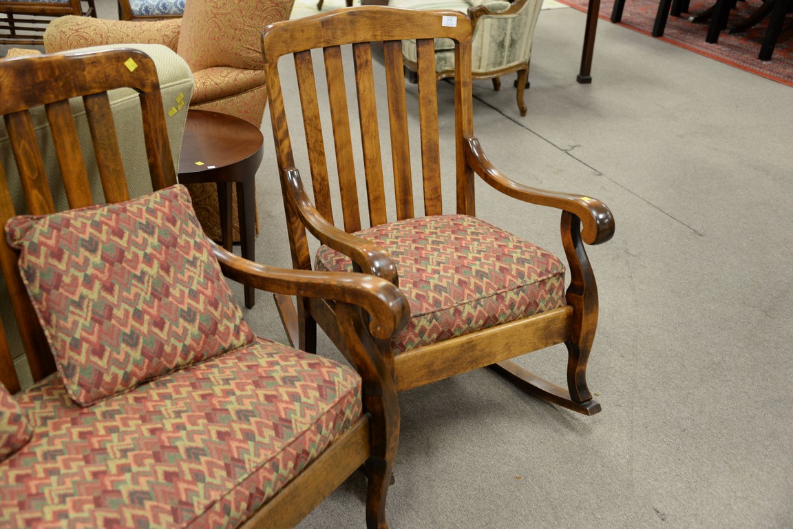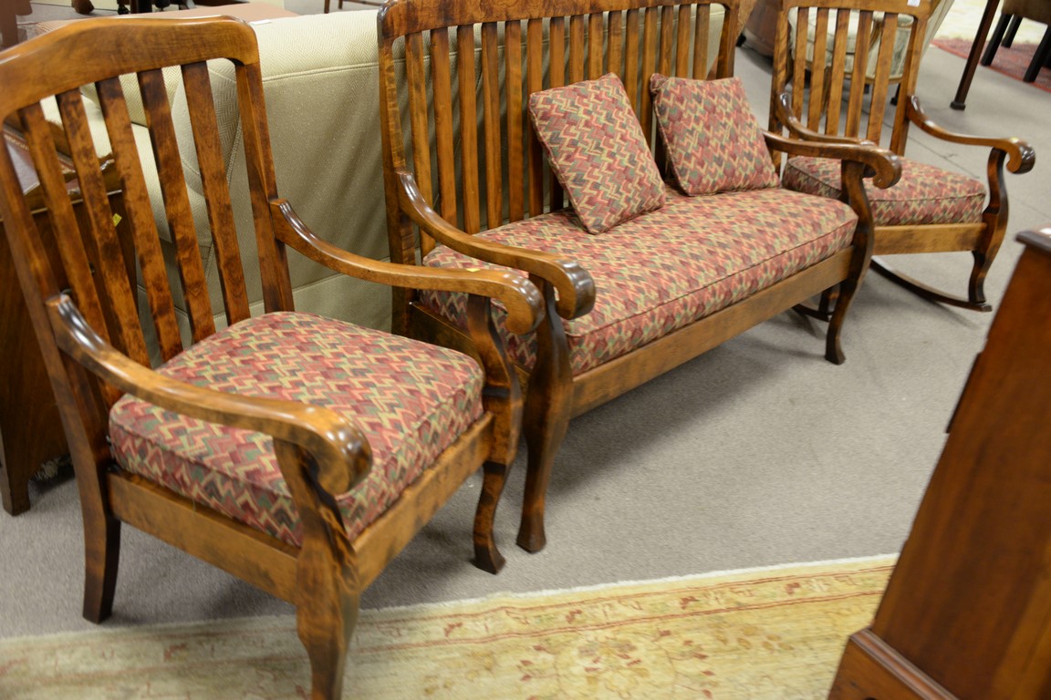 Three piece flamed birch set with settee, rocker, and armchair. settee lg. 54in.