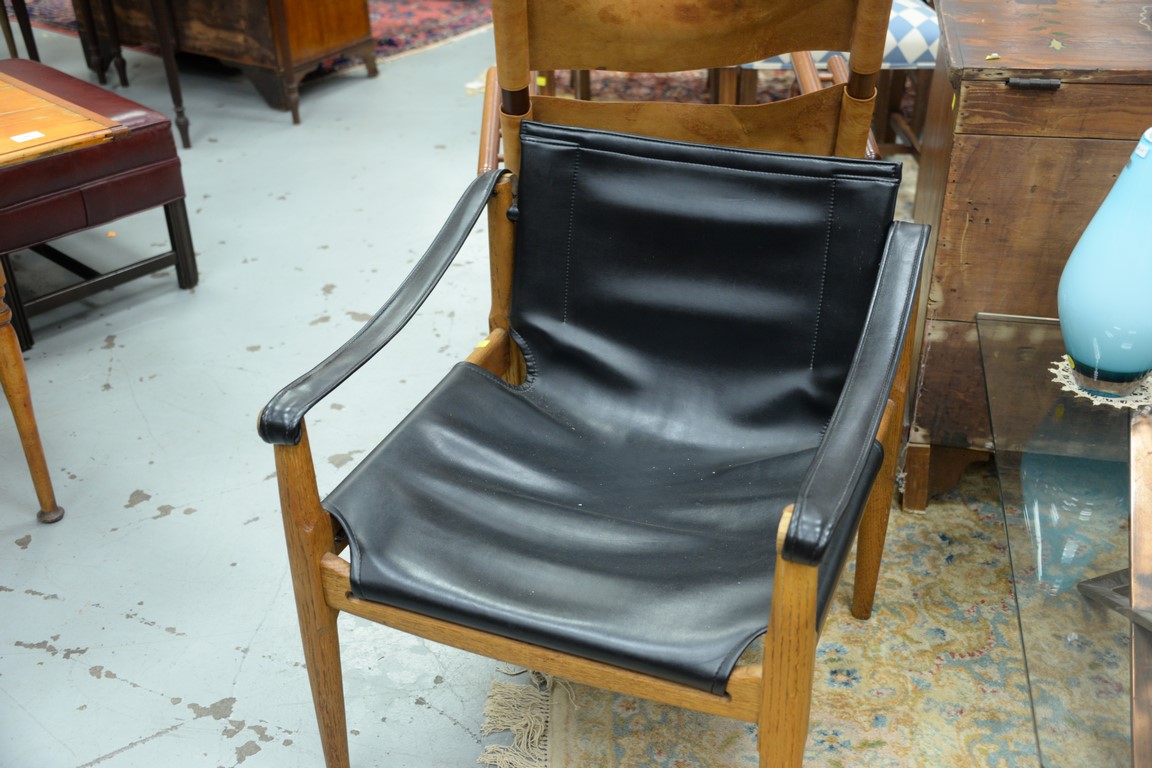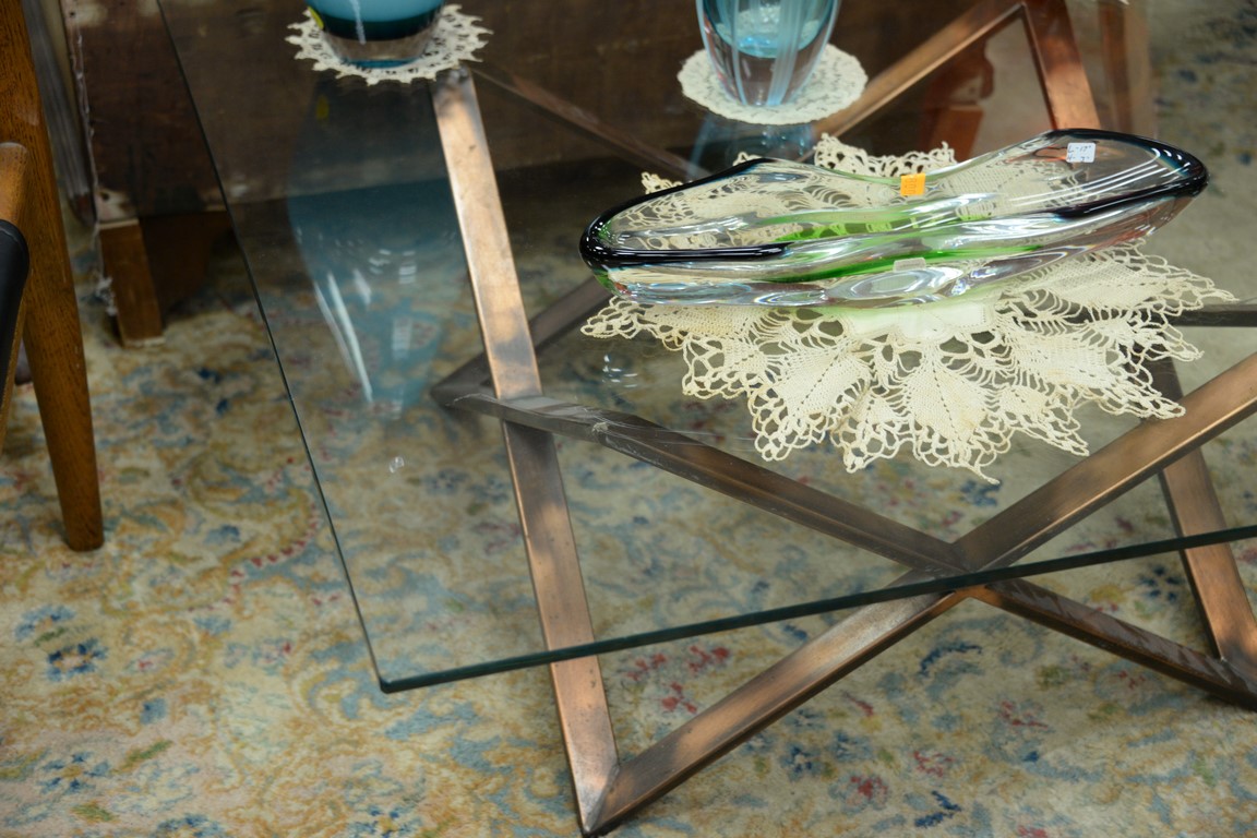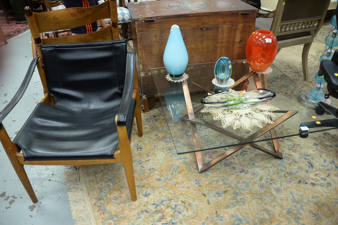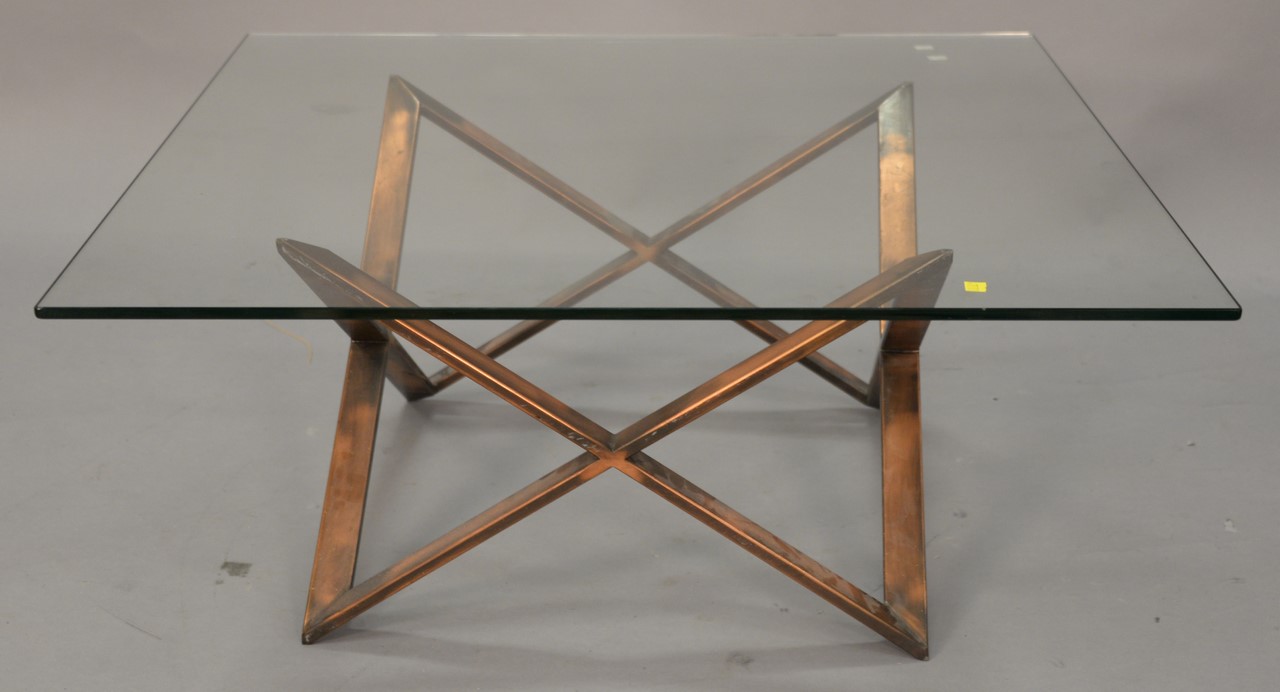 Lot 275: Two piece lot to include a glass top coffee table with copper colored base and a sling style chair. ht. 15 in. top: 36 x 36