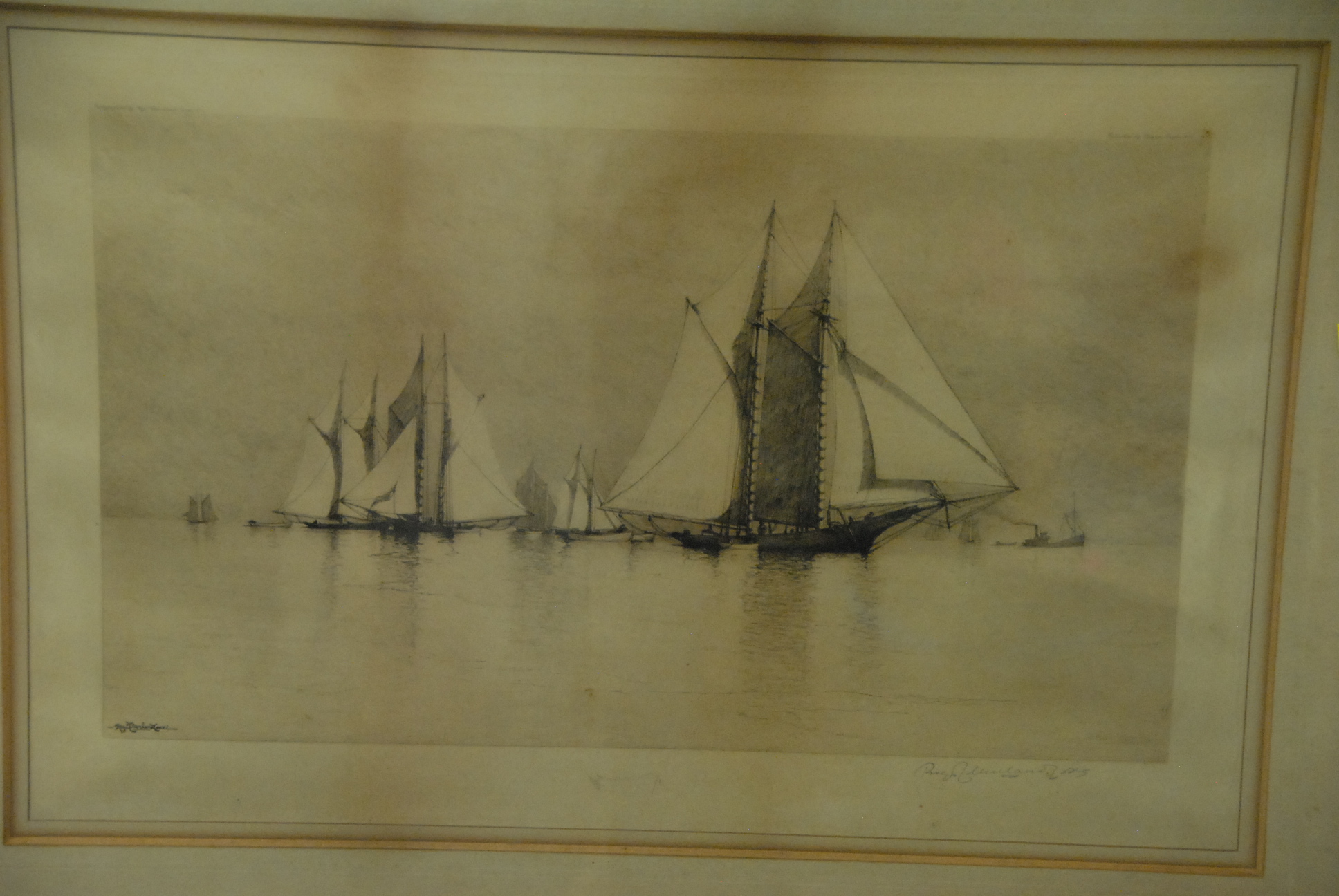 Two piece lot to include Edward Loyal Field 1856-1914 river’s edge drypoint etching signed in etching E. L. Field 7 1/2 x 22 and Reginald Cleveland Coxe 1855-1920 etching of sailing vessels 12 1/2 x 21 1/2.