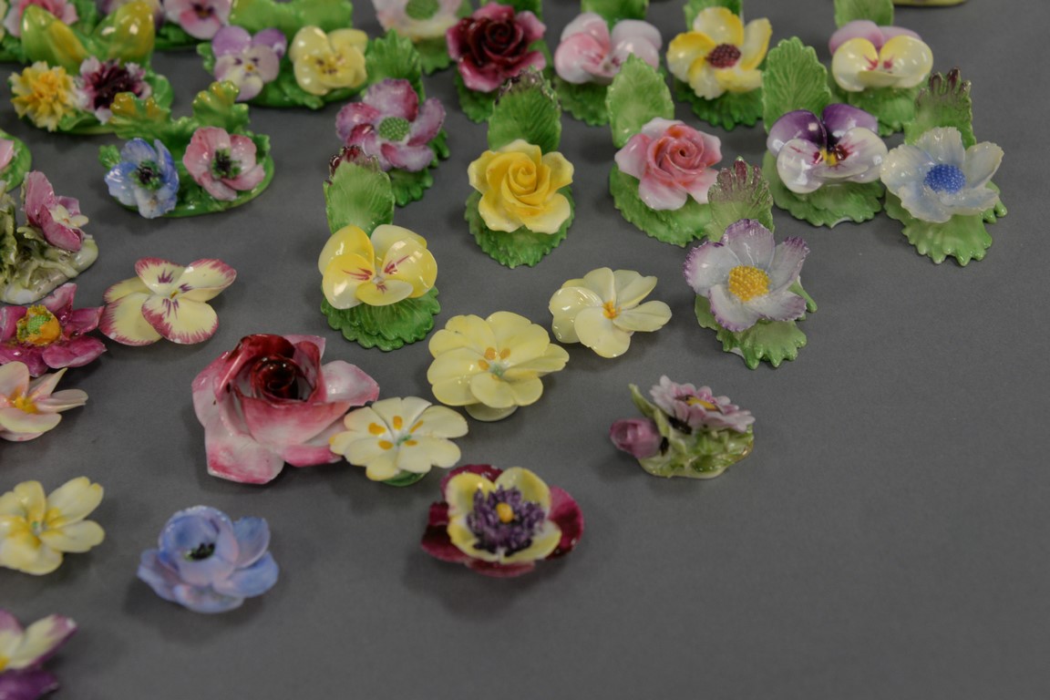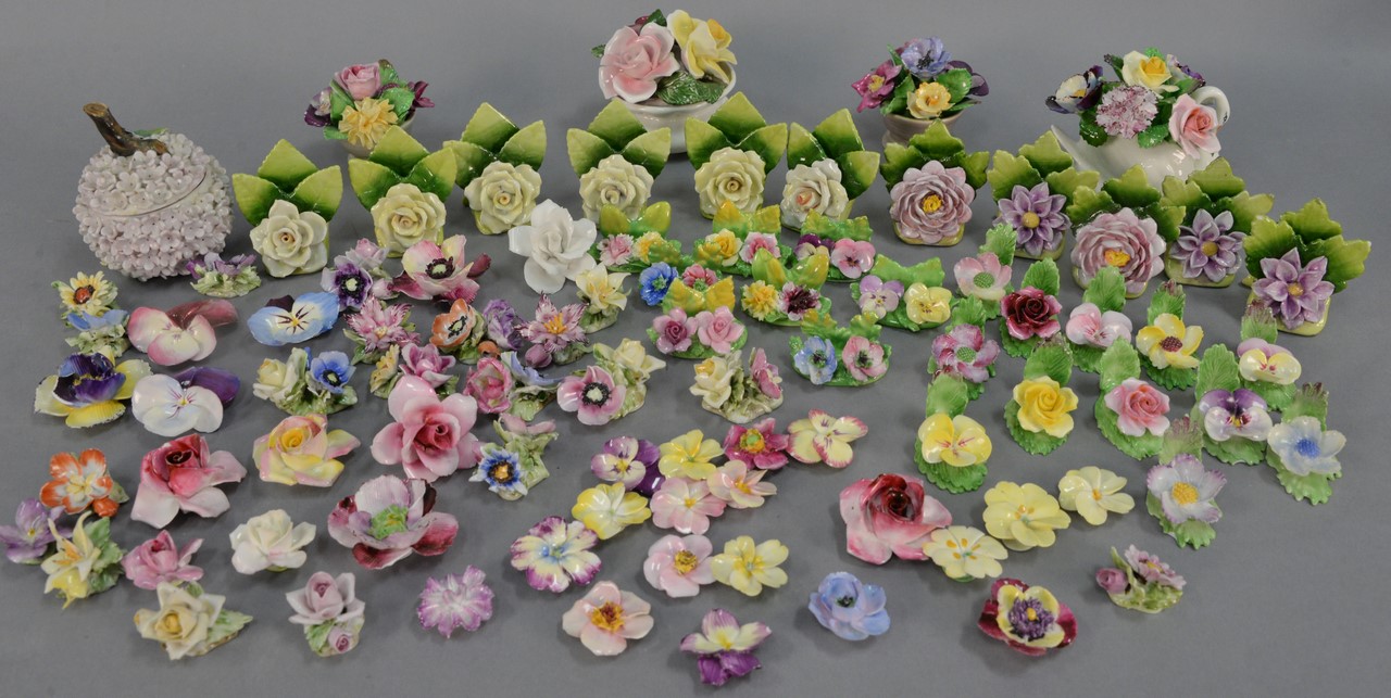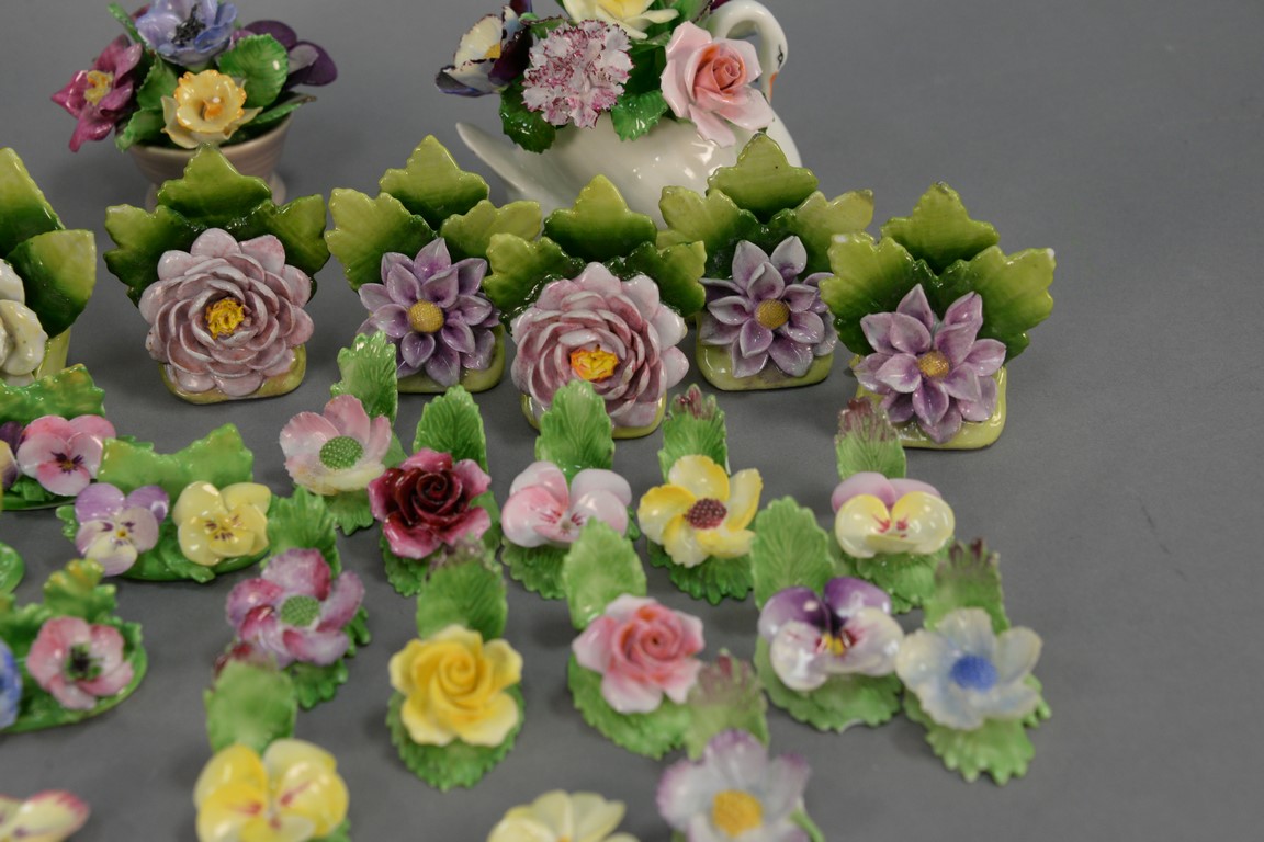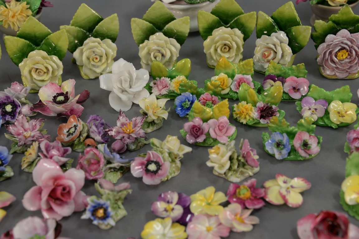 Lot 275: Two tray lots with Capodimonte, Denton, Coalport, china flower place card holders, paper weights, etc.