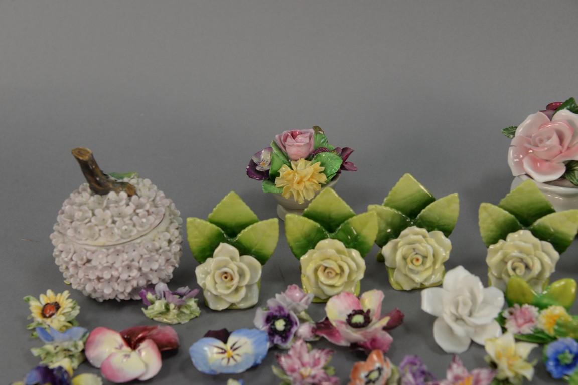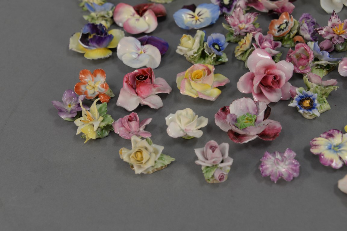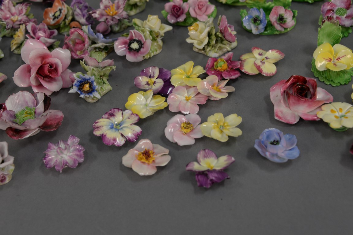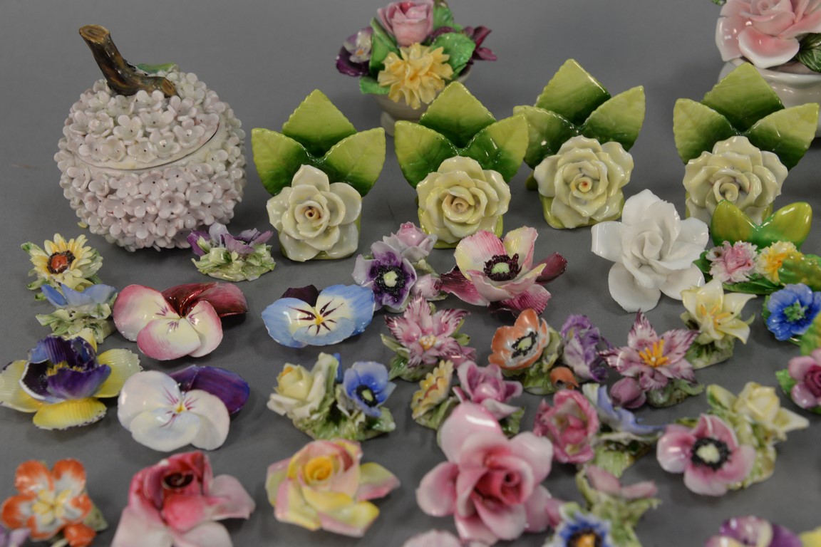 Lot 275: Two tray lots with Capodimonte, Denton, Coalport, china flower place card holders, paper weights, etc.