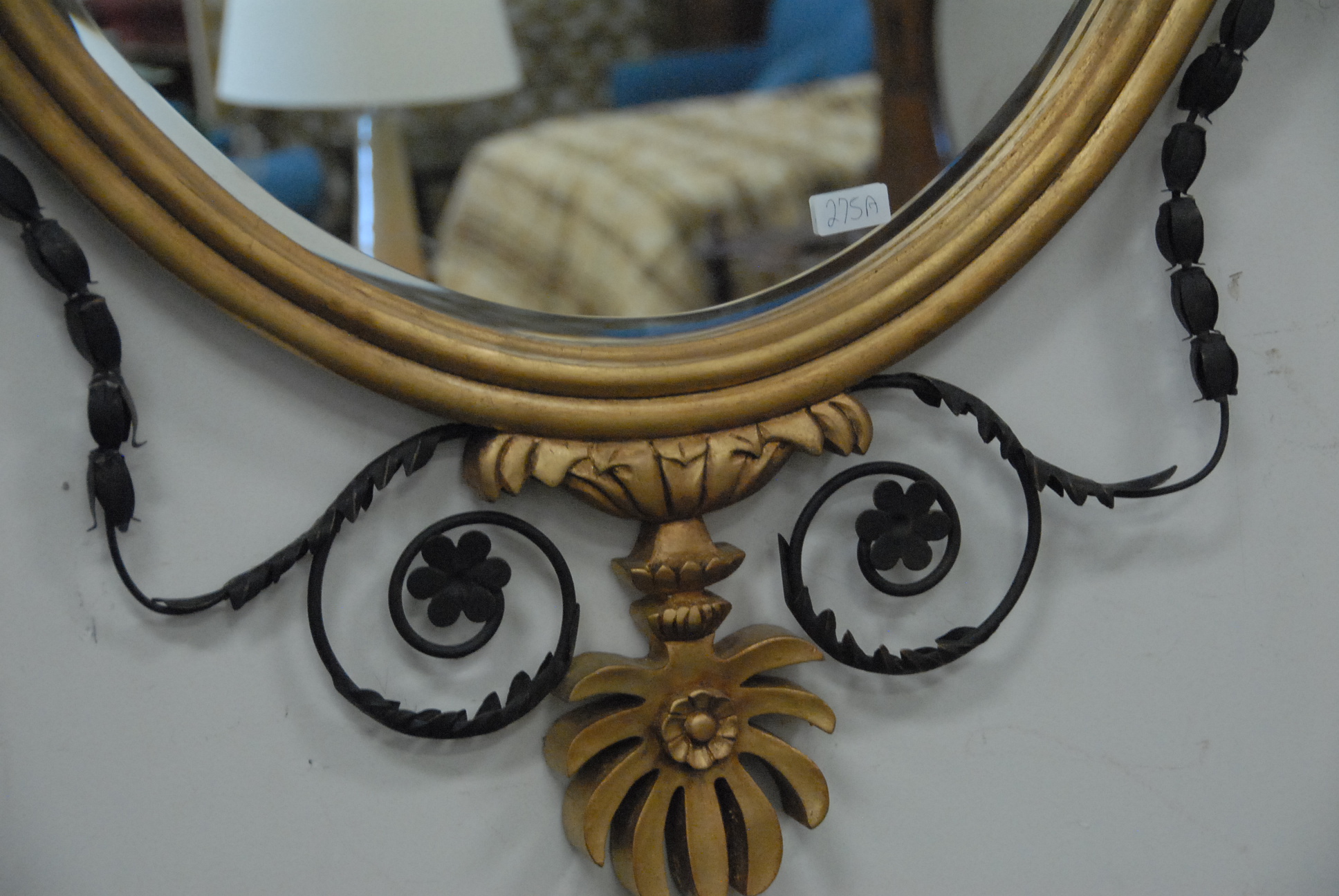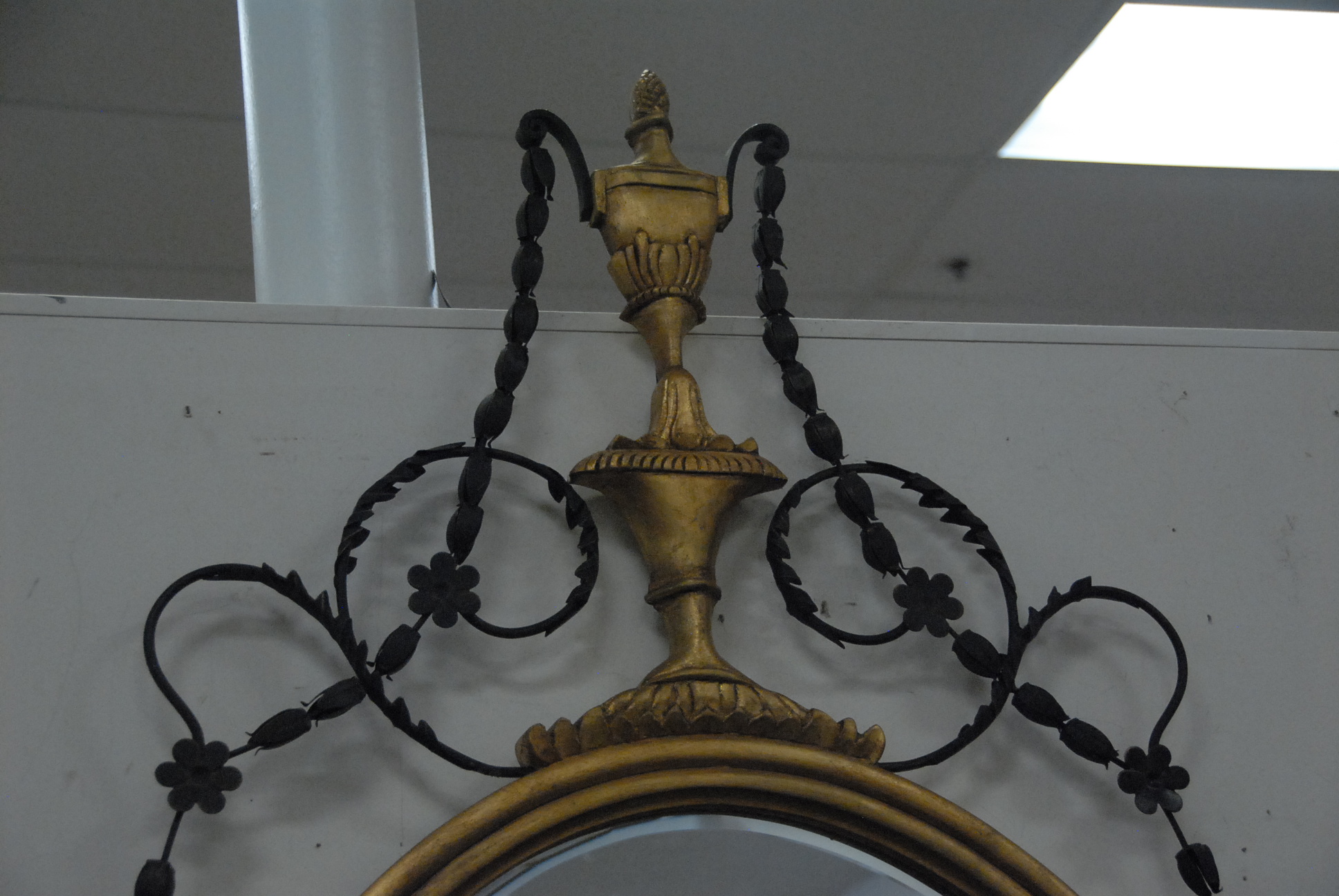 Lot 275A: Large contemporary Hepplewhite style gold mirror with scrolling black metal flower and leaves, 61 x 31.