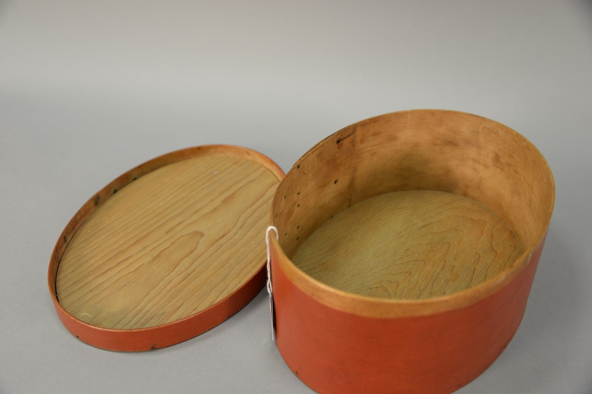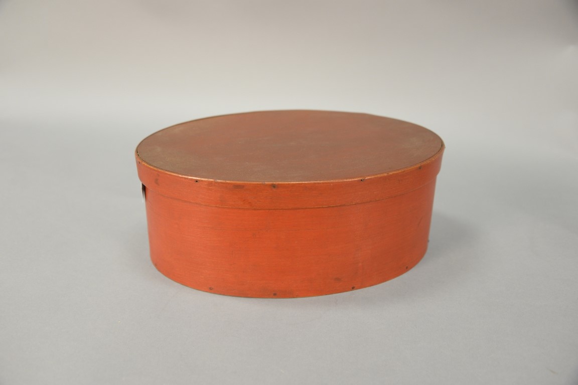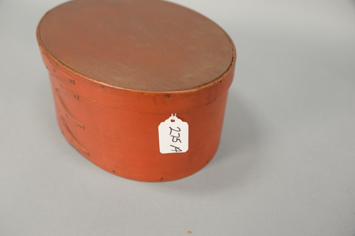Shaker oval four finger box in old red paint. ht. 4in., top: 8 3/8 x 2
