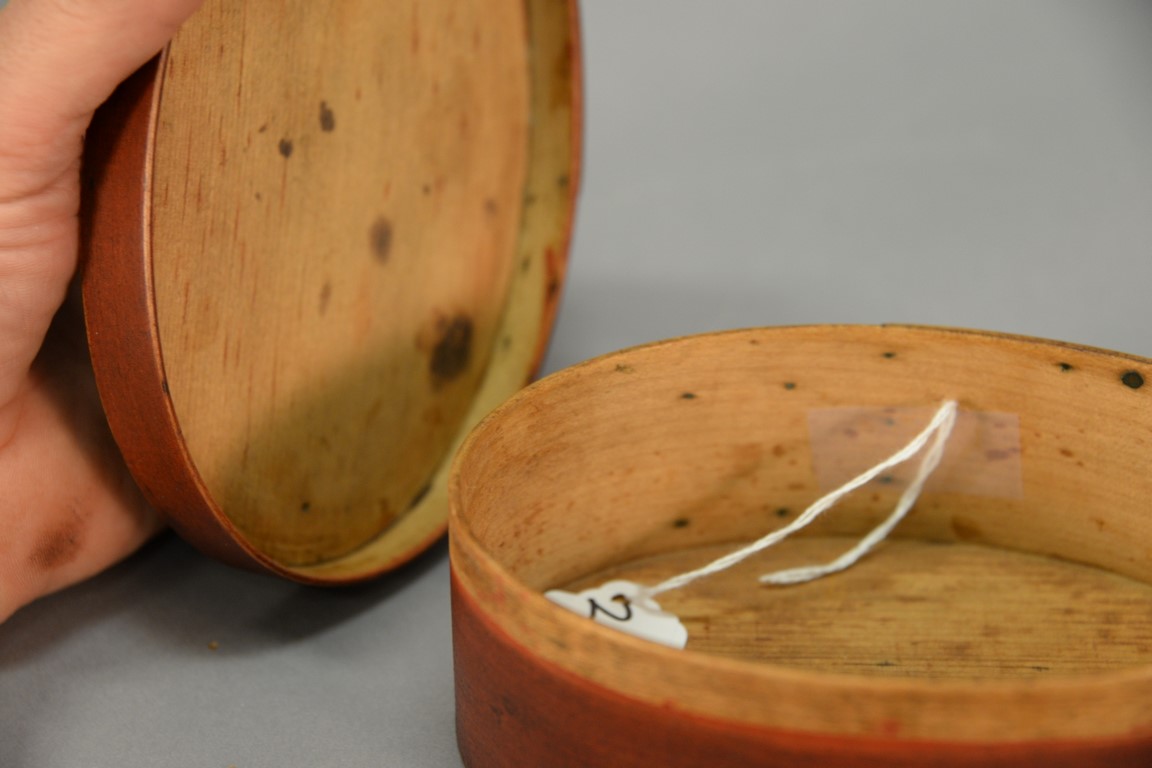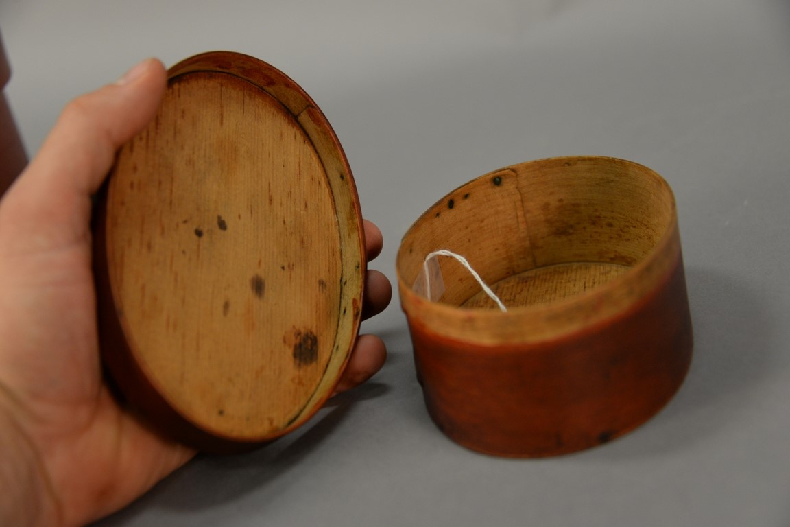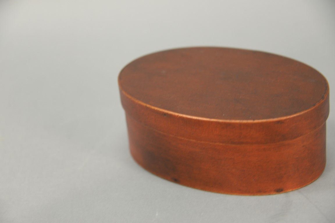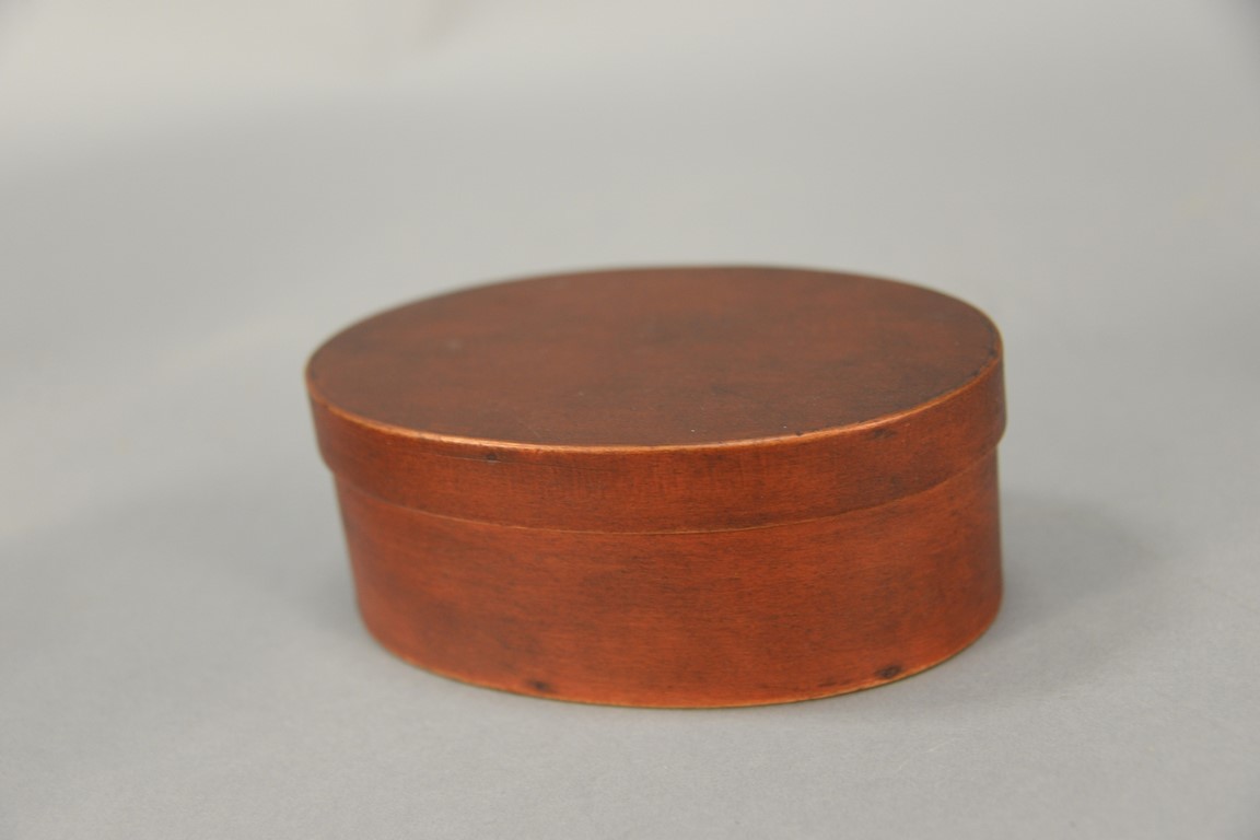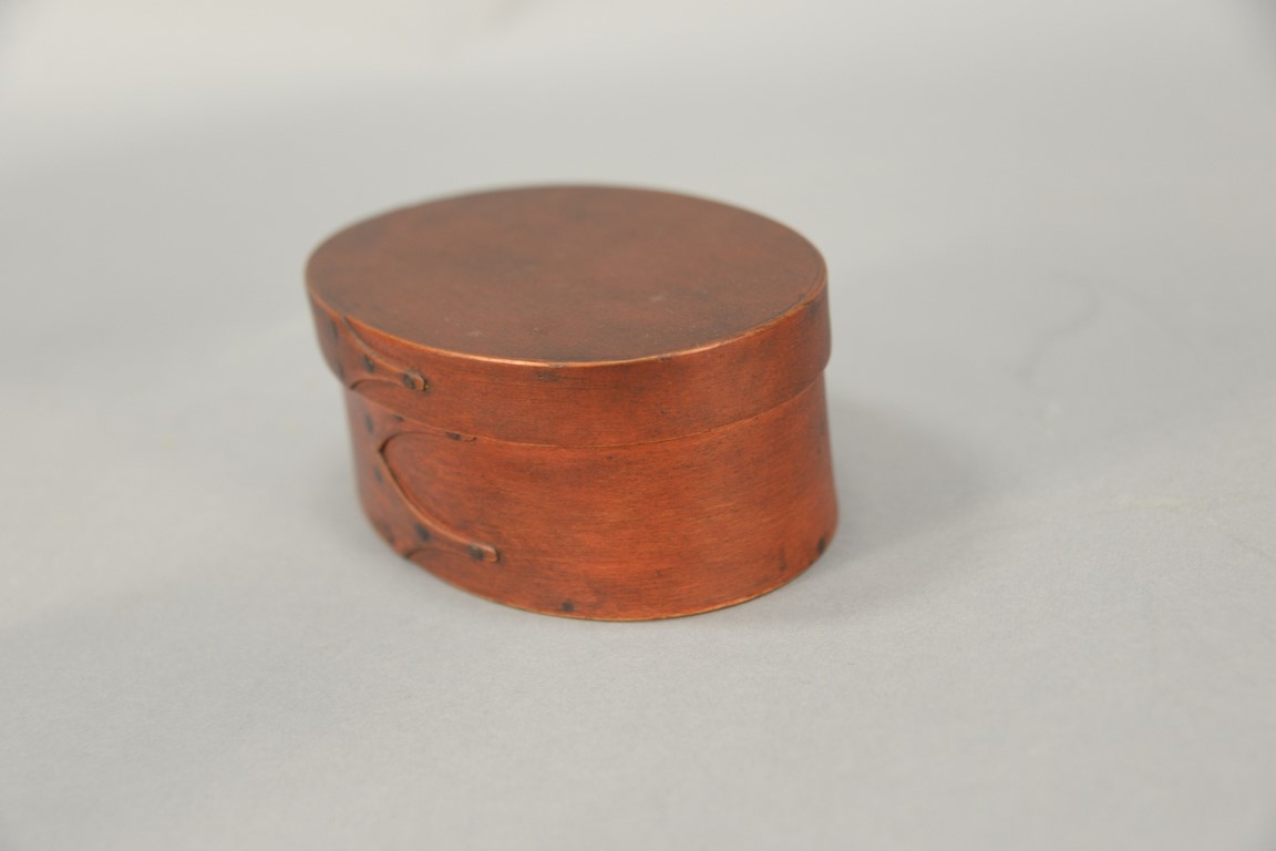 Shaker oval covered three finger box in old red paint. ht. 2 3/8in., top: 4 x 6