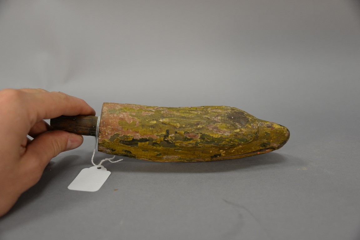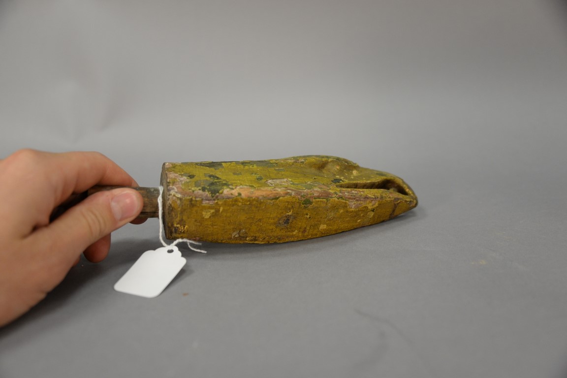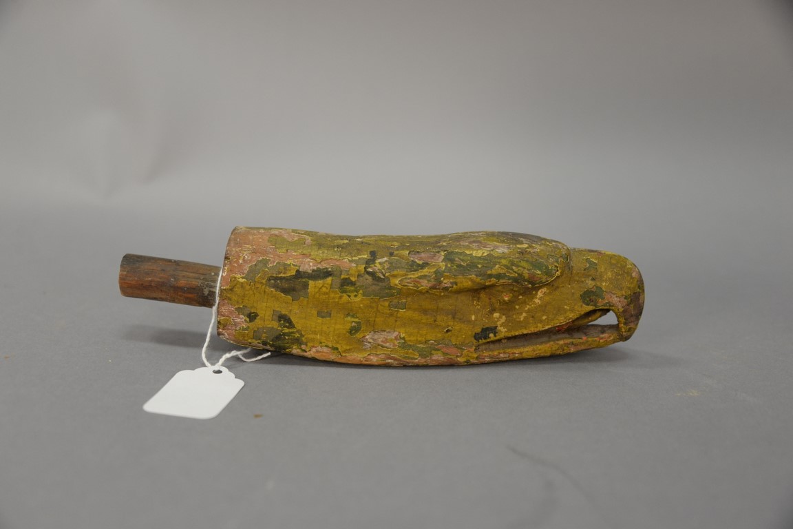 Carved Eagle Head Tiller end, yellow painted folk art. lg. 9in.