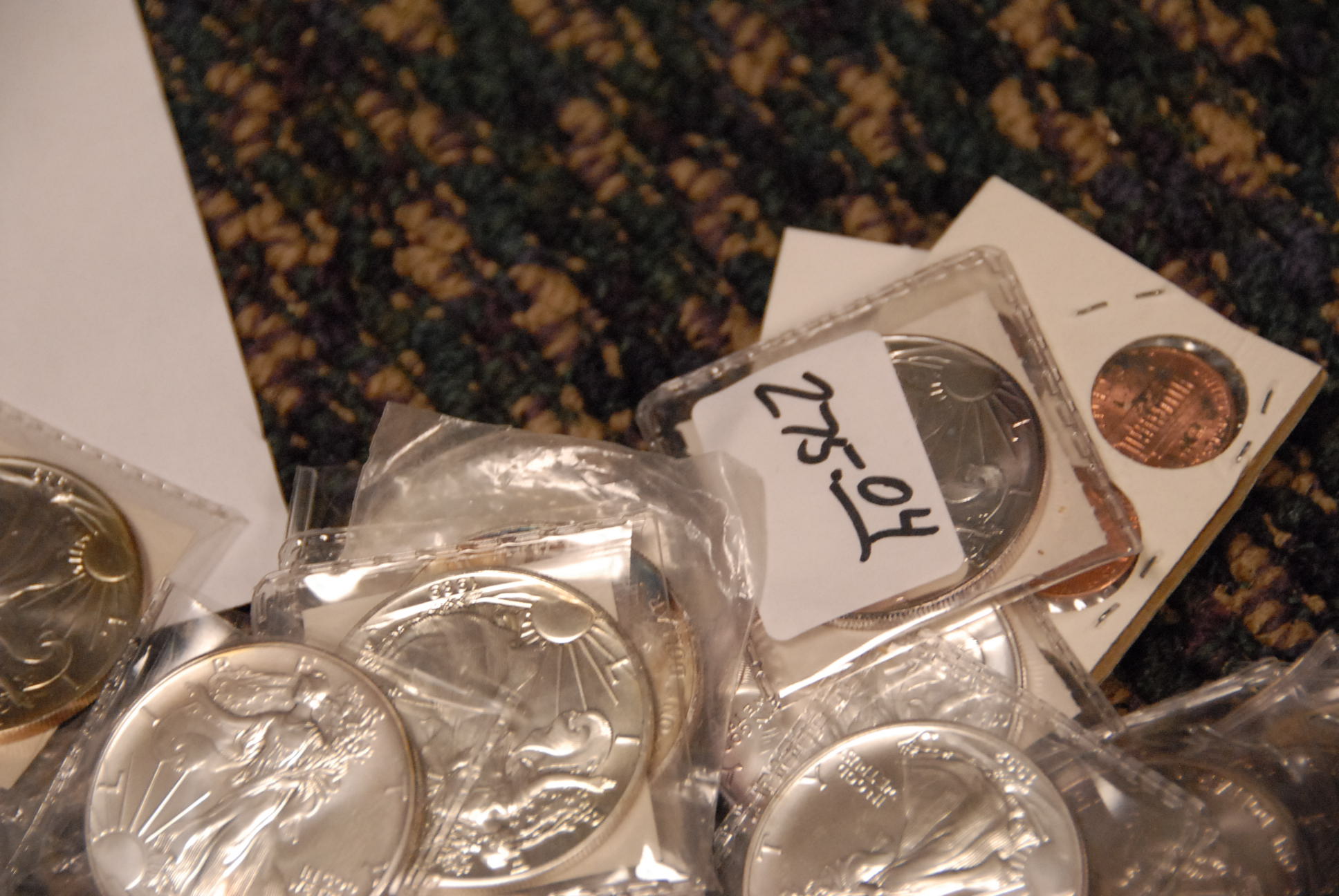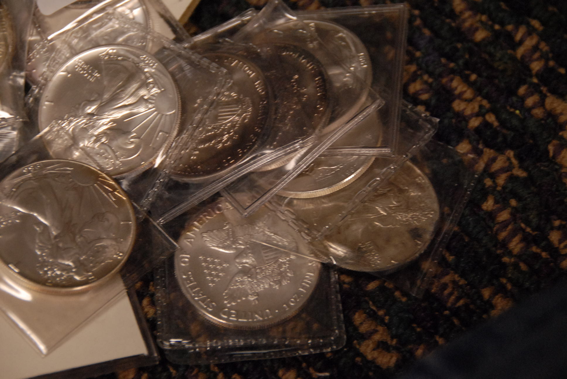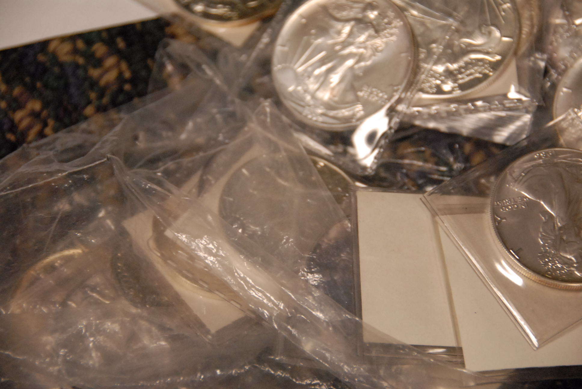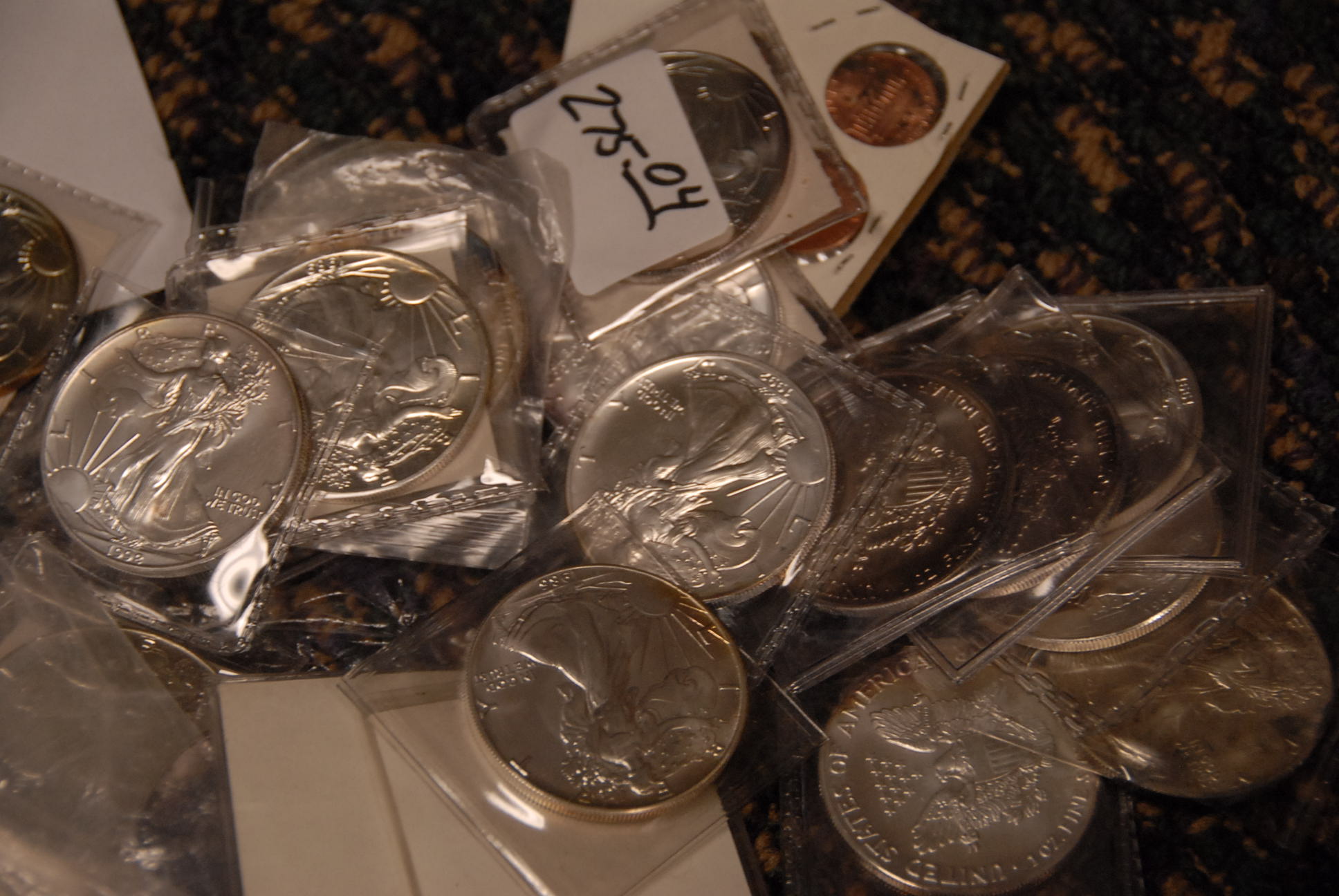 20 Silver eagle 1 coins, 1 oz. fine silver each along with 7 pennies.