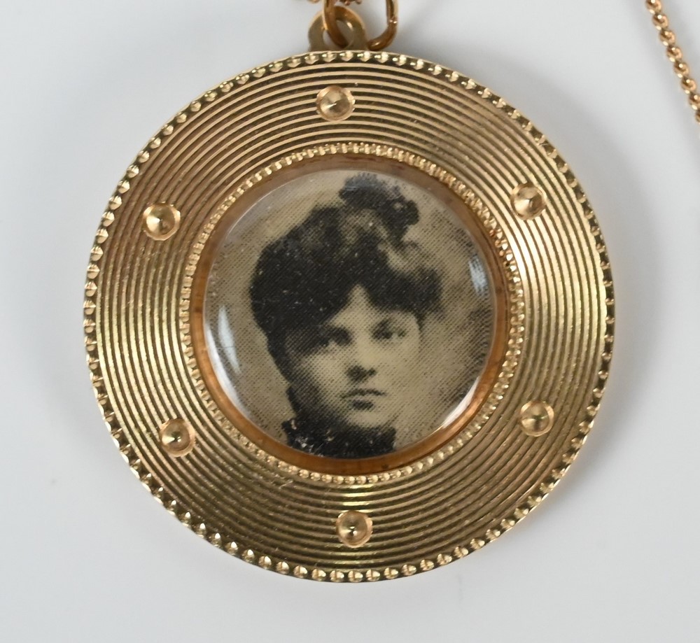 Lot 276: 14 Karat Gold Pendant Locket and Chain, total weight 12 grams, chain length 18 inches, locket diameter 1 1/2 inches.