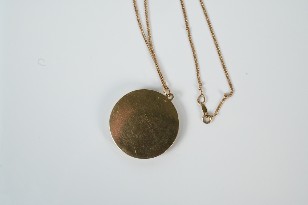 14 Karat Gold Pendant Locket and Chain, total weight 12 grams, chain length 18 inches, locket diameter 1 1/2 inches.