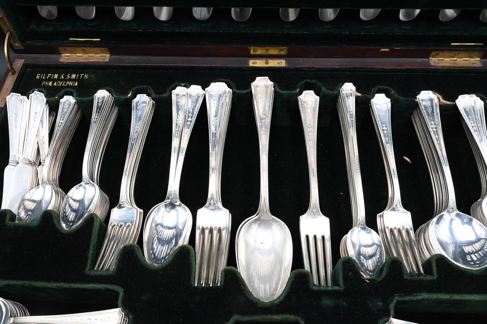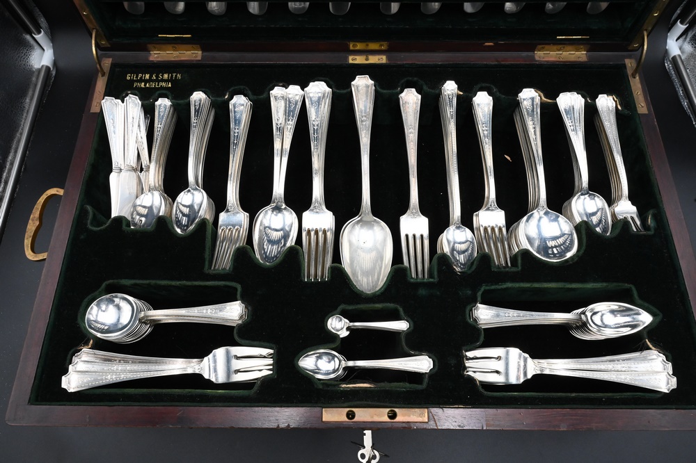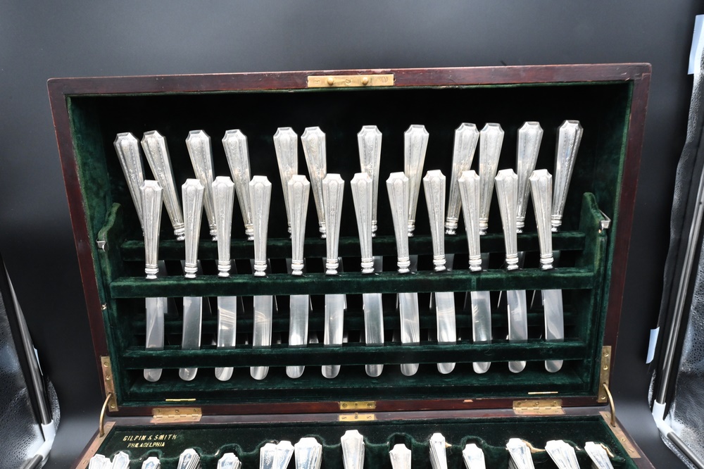 227 Piece Sterling Silver Flatware Set, to include: 12 dinner forks, 12 salad forks, 24 fish forks, 12 cocktail forks, 12 tablespoons, 24 teaspoons, 12 soup spoons, 11 dessert spoons, 12 iced tea spoons, 6 place spoons, 12 bouillon spoons, 12 three-pronged spoons, 11 demitasse spoons, 12 salt spoons, 12 dinner knives, 12 lunch knives, 14 butter knives, 2 pie servers, 3 sets of serving forks and knives; in original fitted box, 181 t.oz. plus 33 weighted handles.