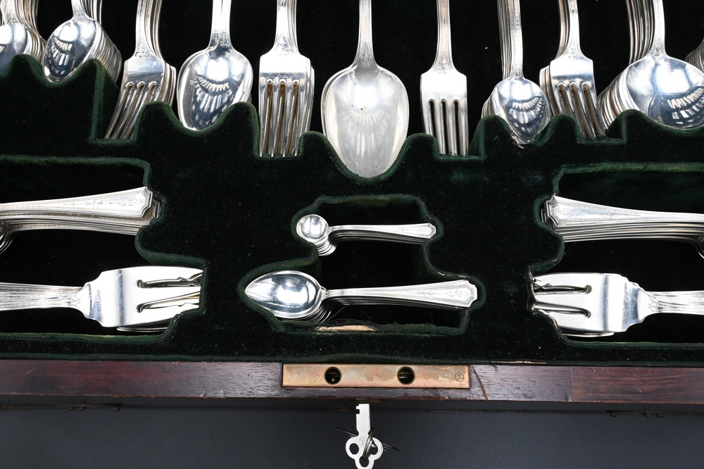 Lot 276: 227 Piece Sterling Silver Flatware Set, to include: 12 dinner forks, 12 salad forks, 24 fish forks, 12 cocktail forks, 12 tablespoon…