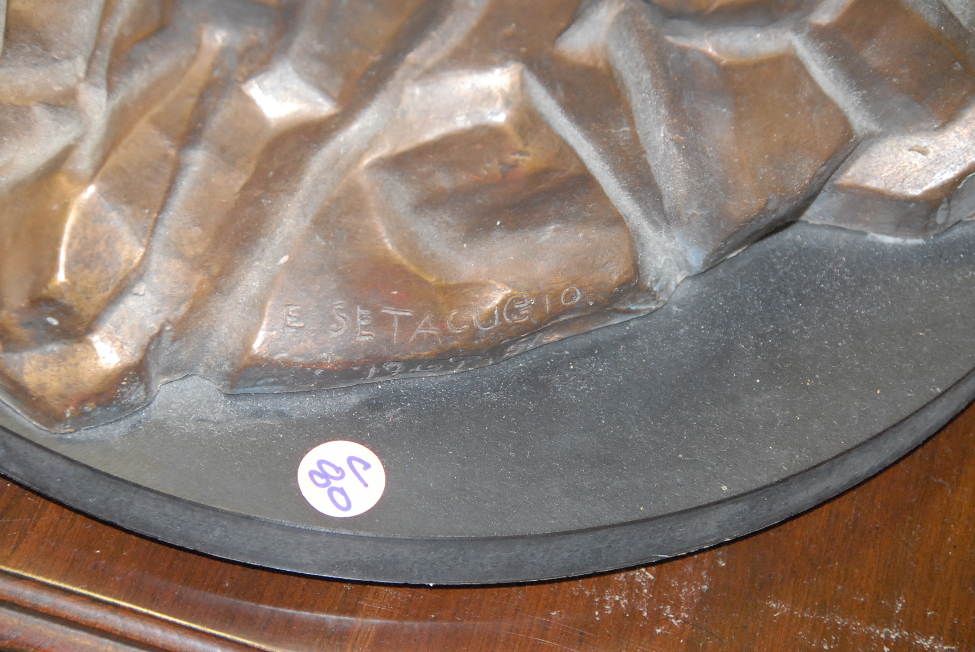 Bronze on revolving stand signed E. Setacueto 1969 of family on mountain top.
