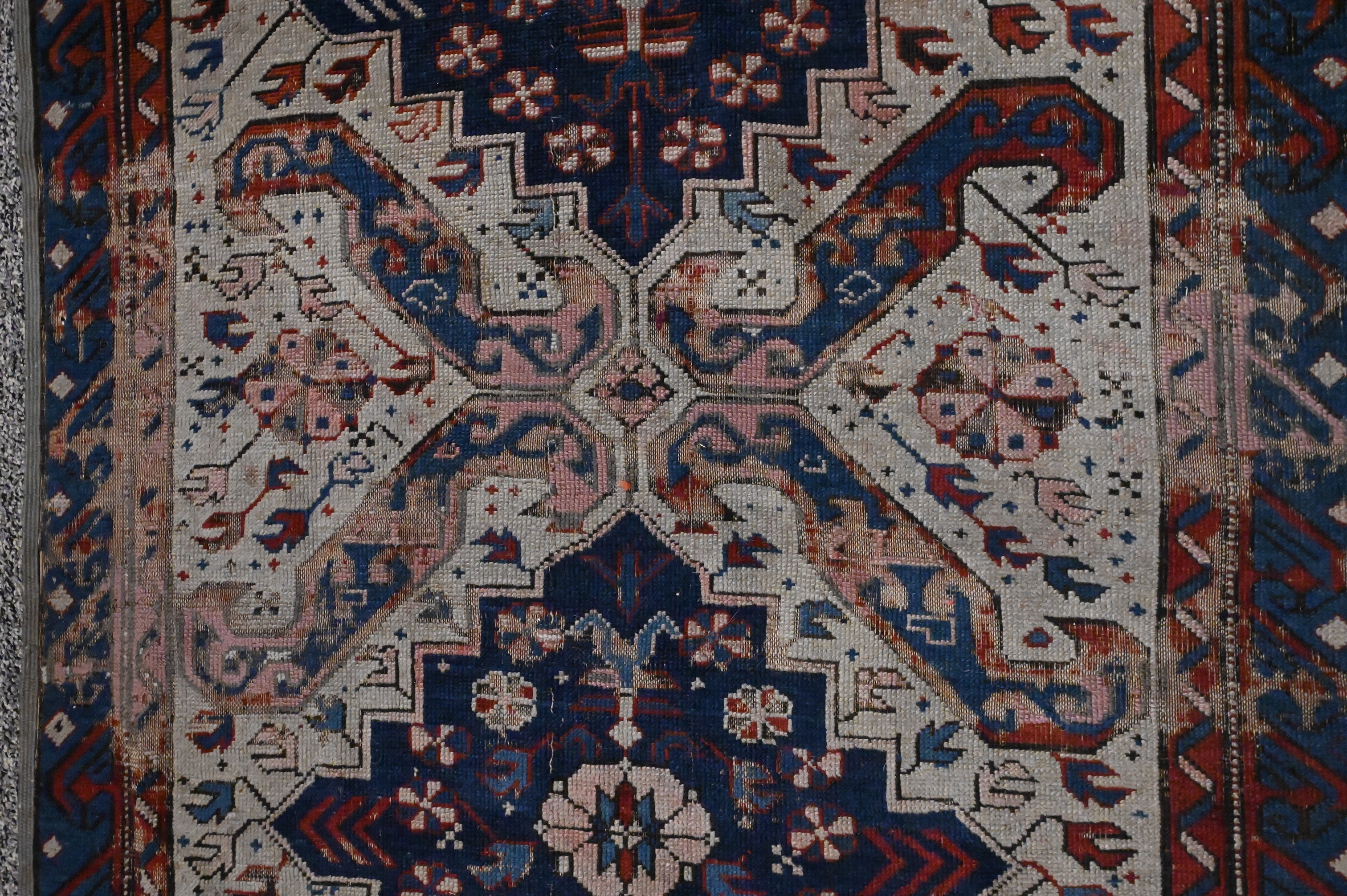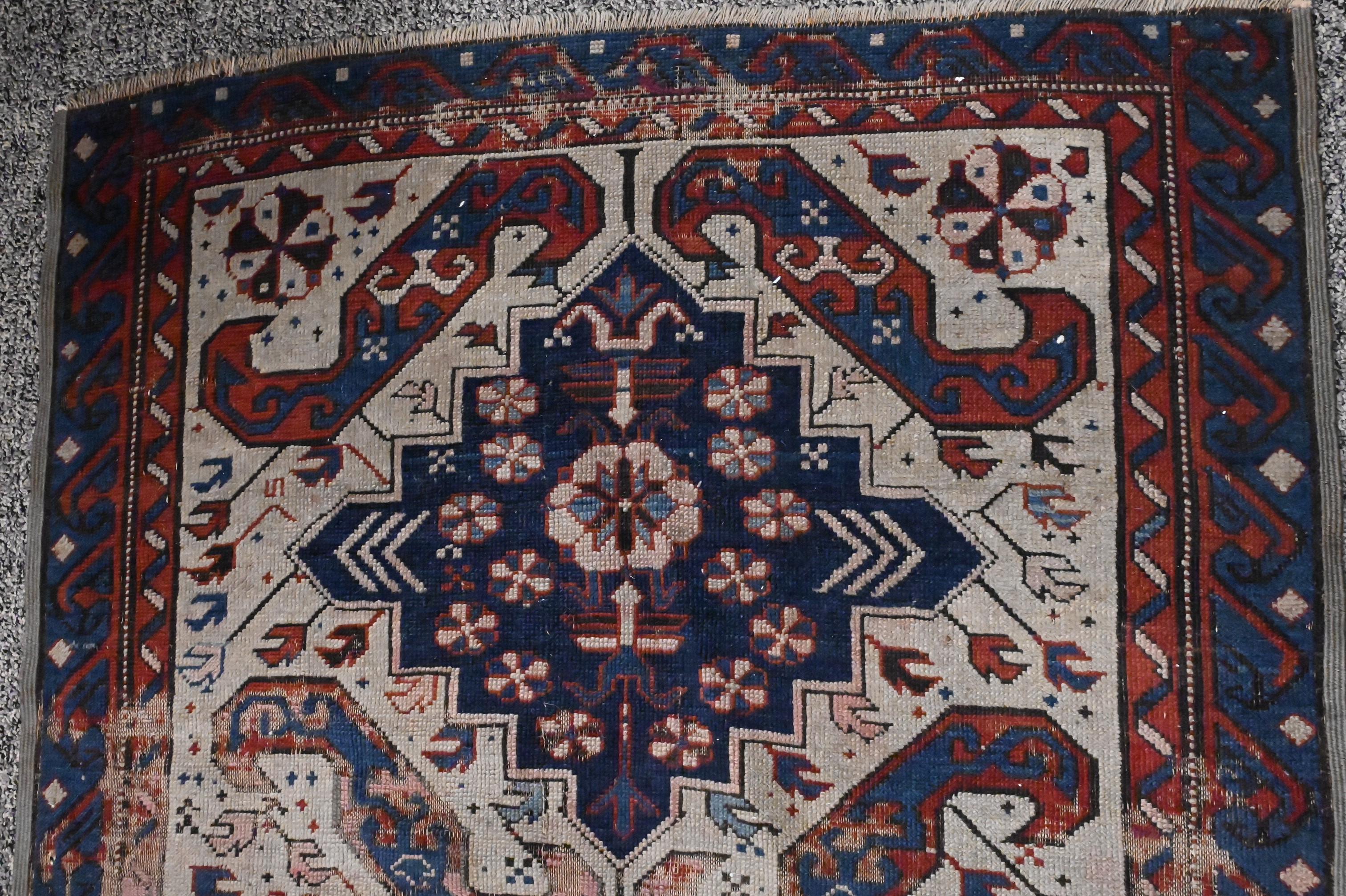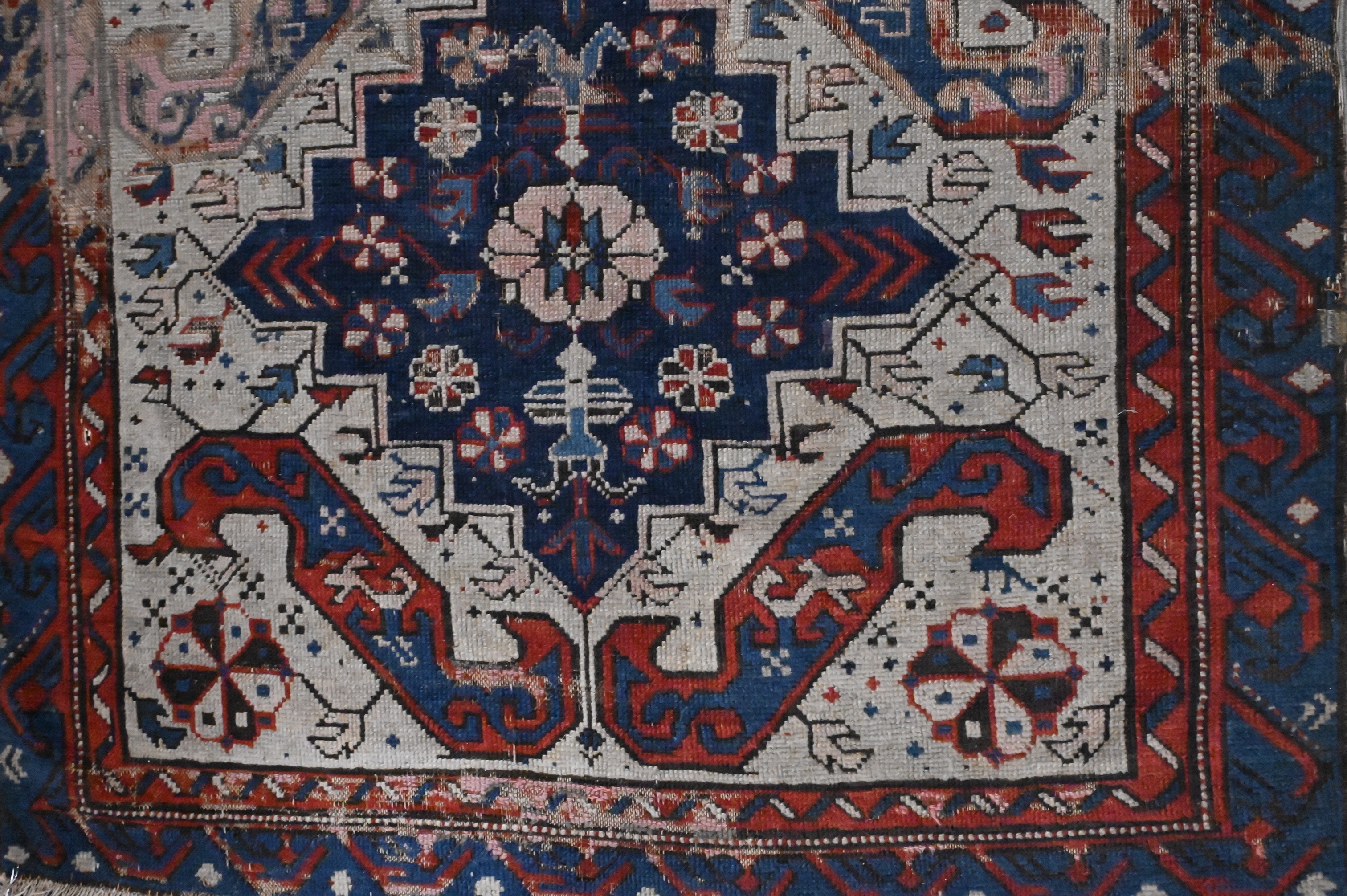 A Caucasian rug with geometric medallions and stylized floral motifs in shades of indigo, madder red, ivory, and pale blue. Multiple borders with latch-hook and diamond designs.