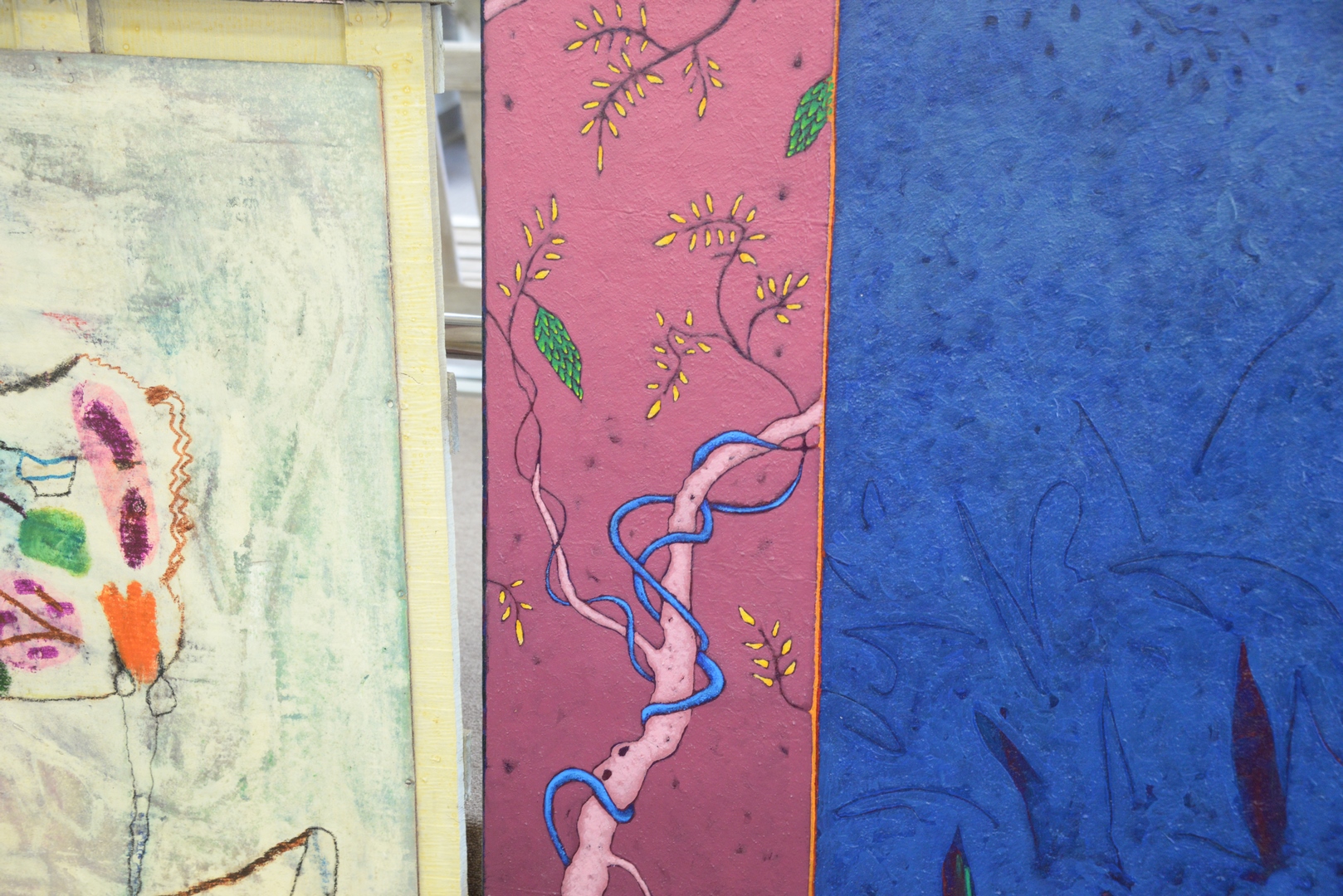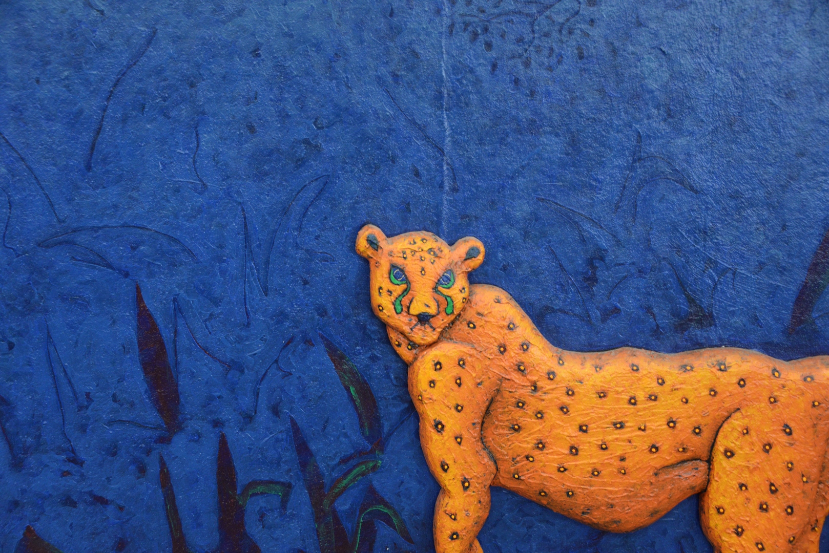 D. Jack Solomon (American, 20th century), The Trickster, 1983, acrylic, collage and Masonite, signed, titled, and dated on the reverse, 49″ x 75″, along with a Pam Adler Gallery label on the reverse.
