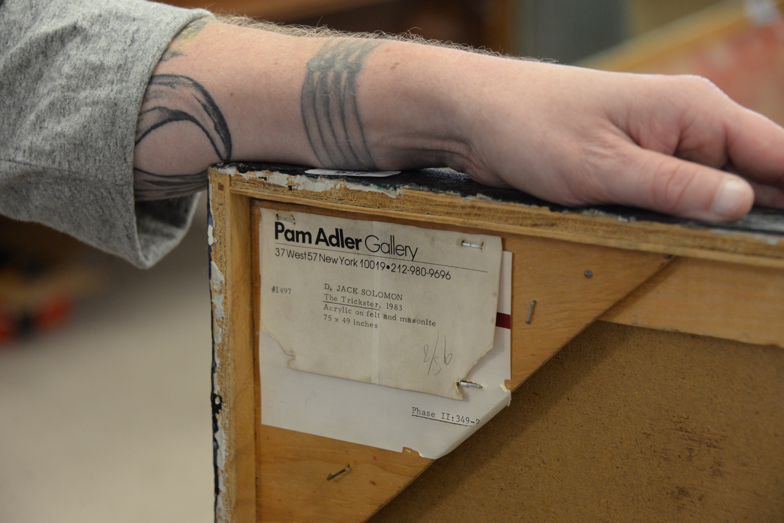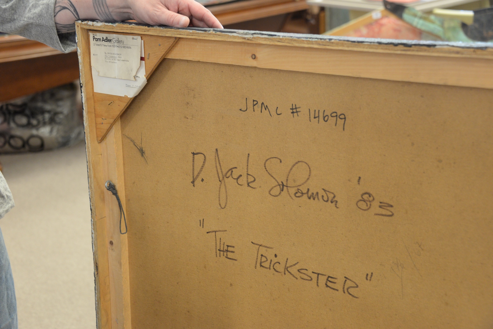 Lot 276: D. Jack Solomon (American, 20th century), The Trickster, 1983, acrylic, collage and Masonite, signed, titled, and dated on the reverse, 49″ x 75″, along with a Pam Adler Gallery label on the reverse.