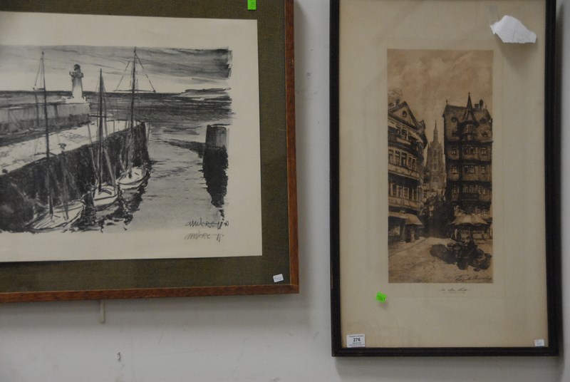 Four framed pieces to include black and white pencil charcoal drawing of men signed lower right, lithograph signed lower right indistinctly #64/95 53′, black and white of boats pencil signed lower right indistinctly, and print of etching by Franziska Redelsheimer.
