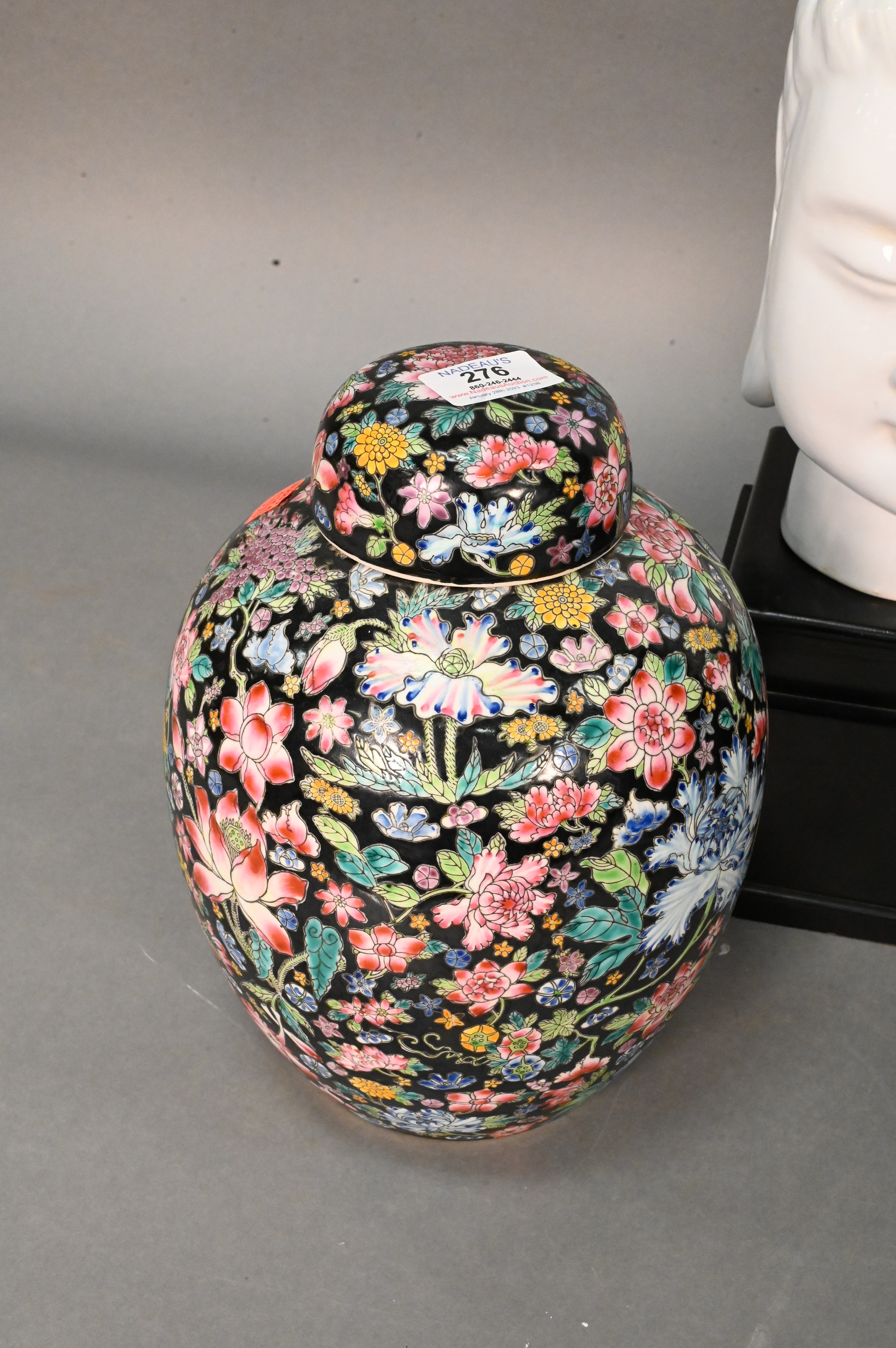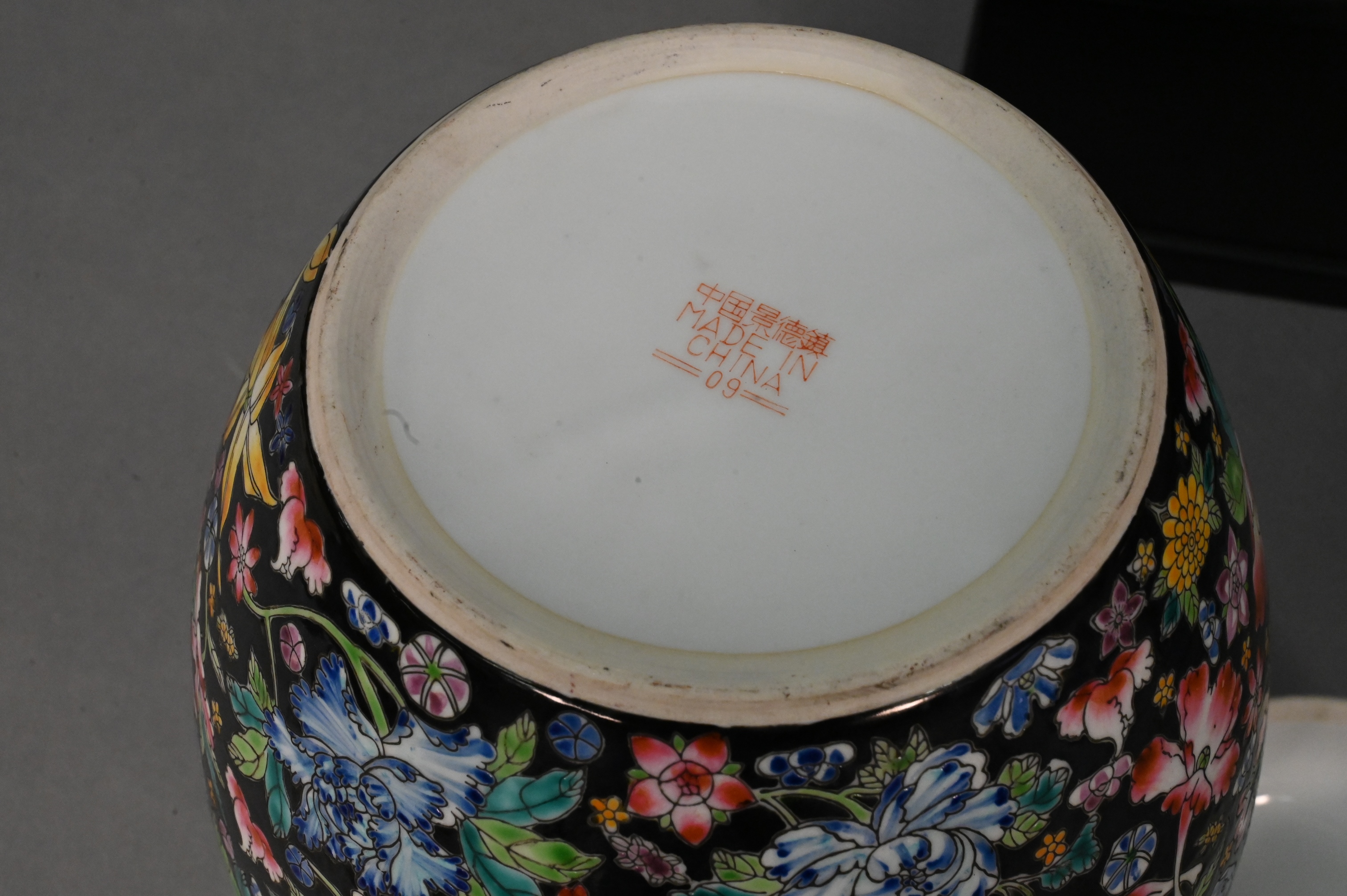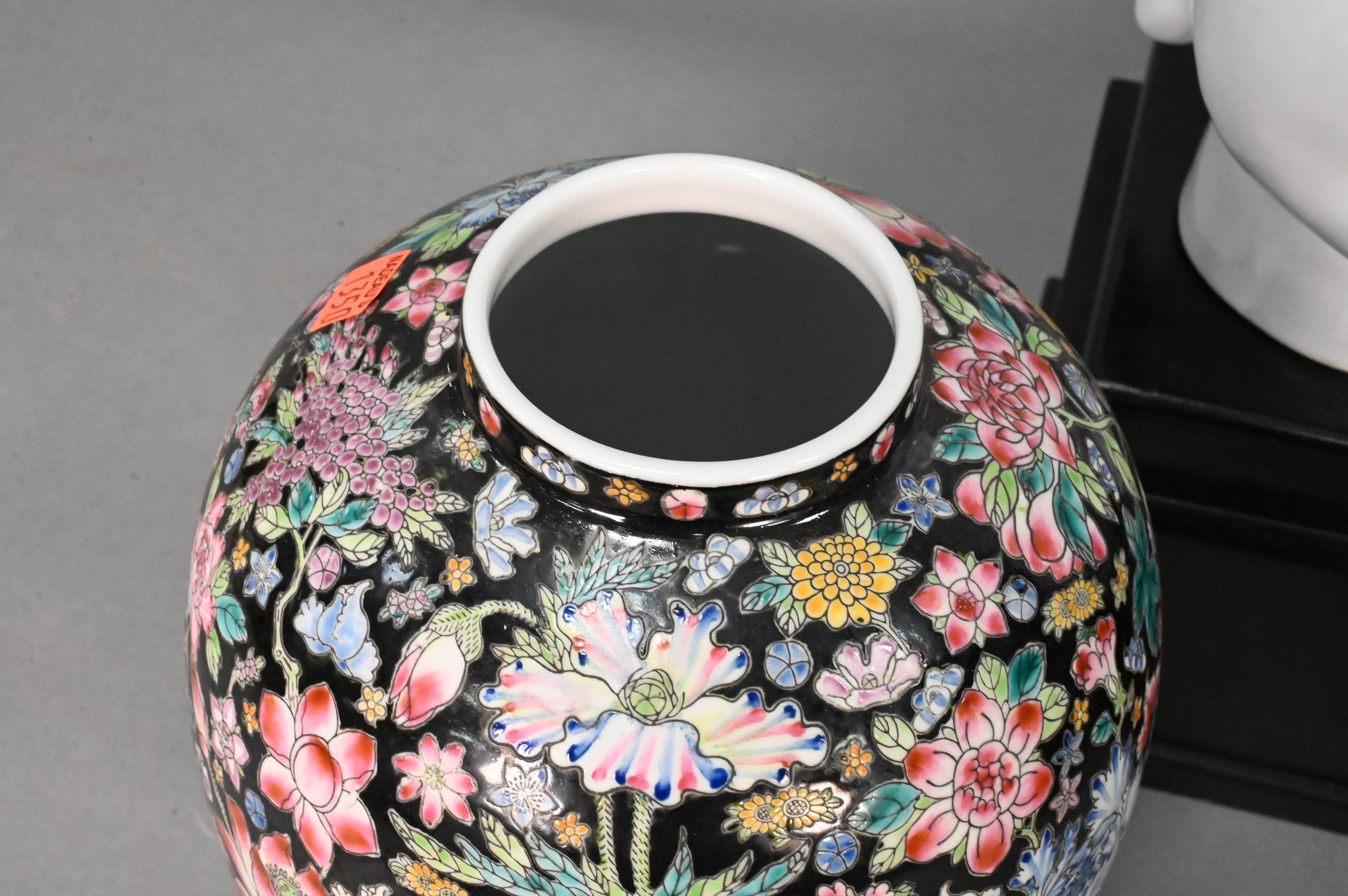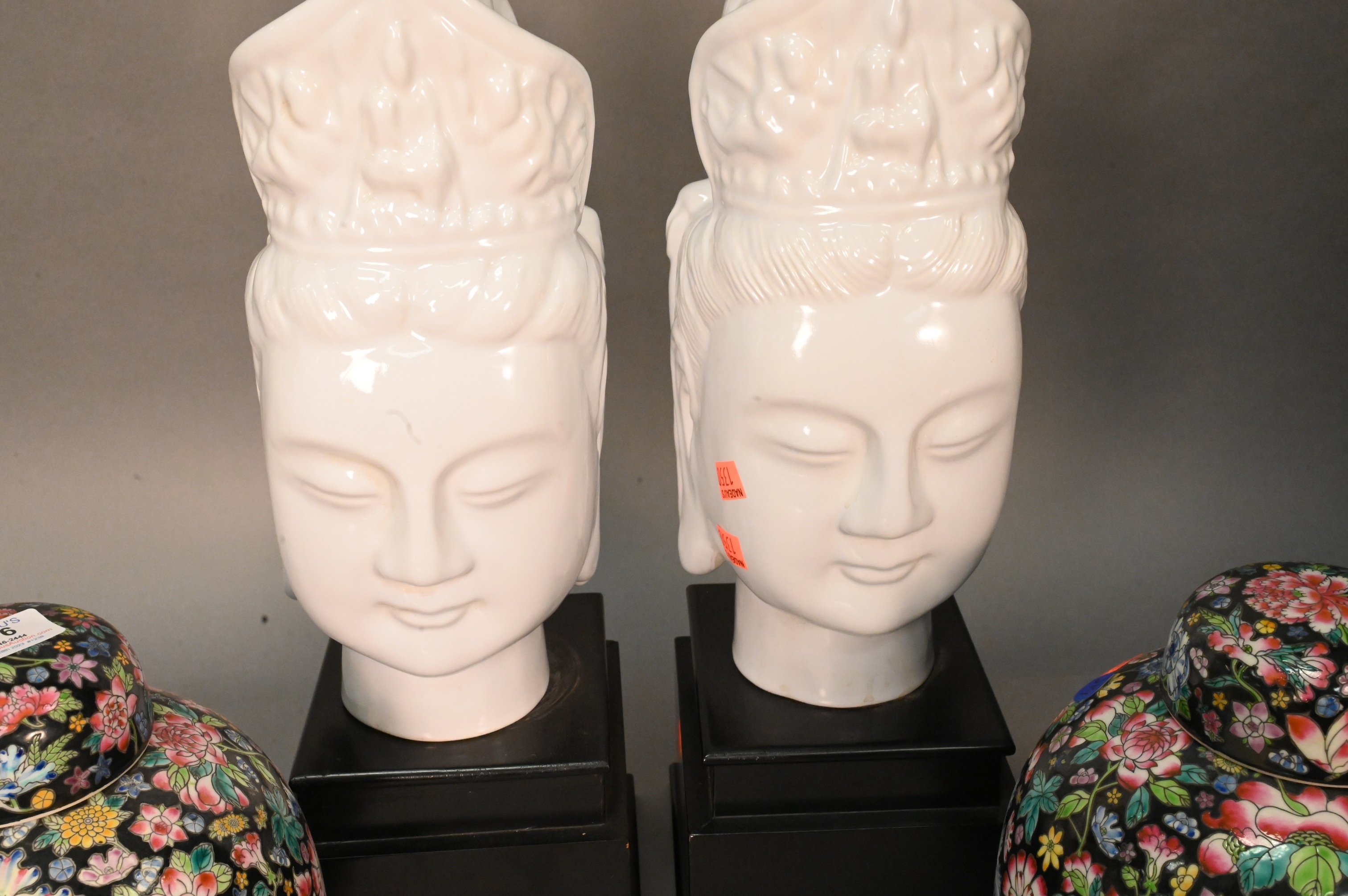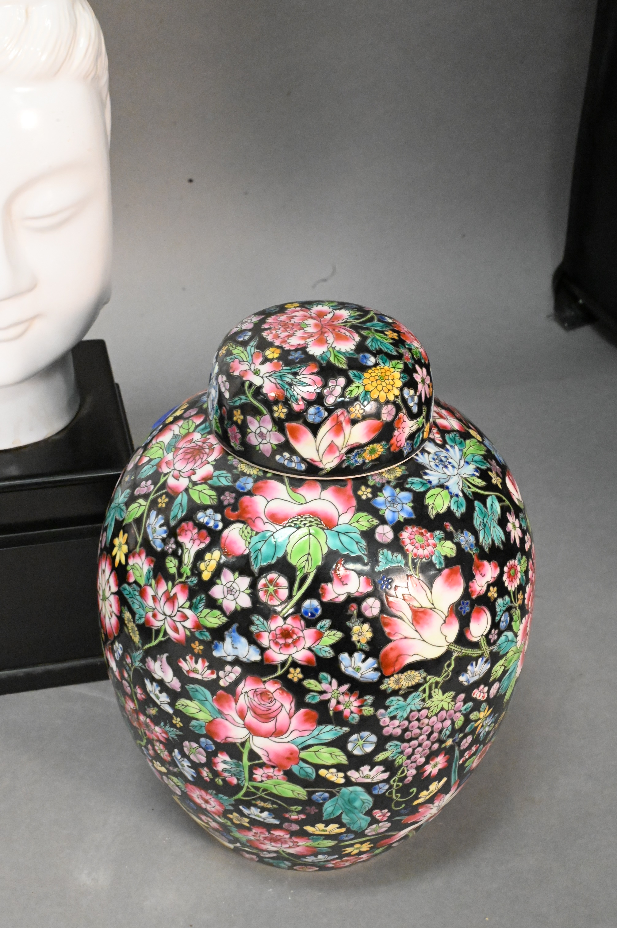 Four Piece Lot, to include a pair of porcelain heads, along with a pair of Famille Rose black ground covered jars, height 20 inches. Provenance: Property from a private New York collection sold to benefit charitable foundations.