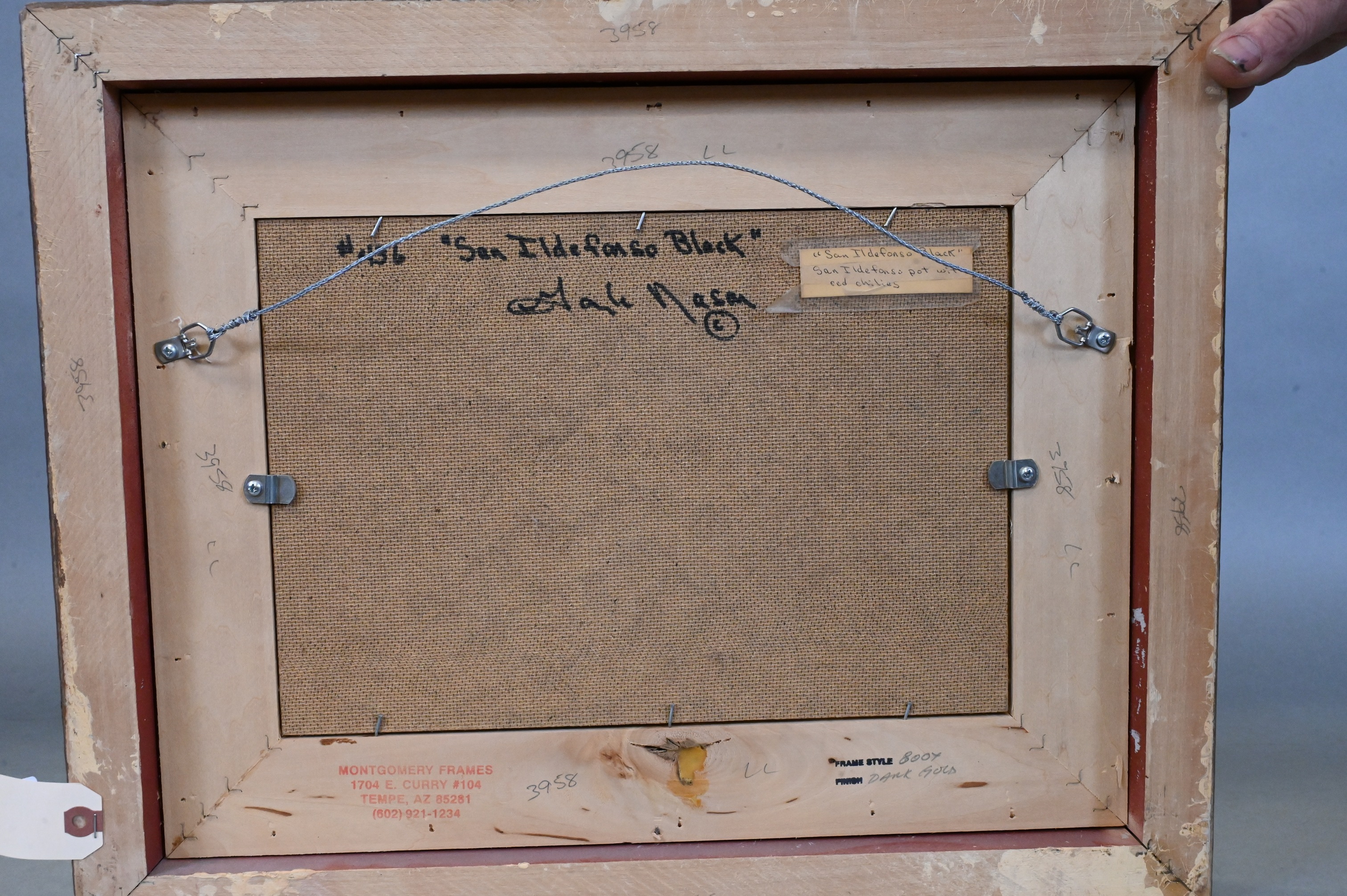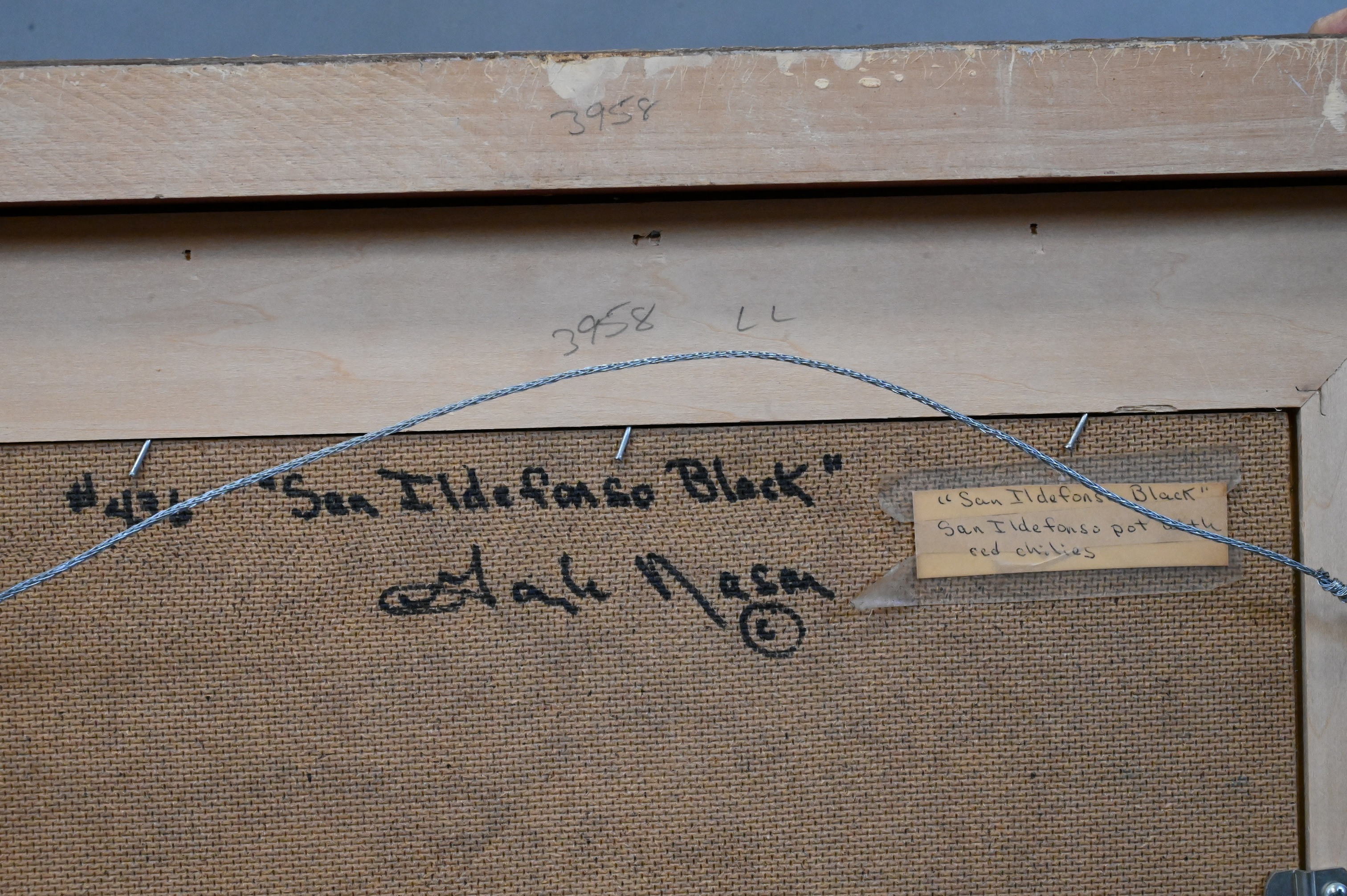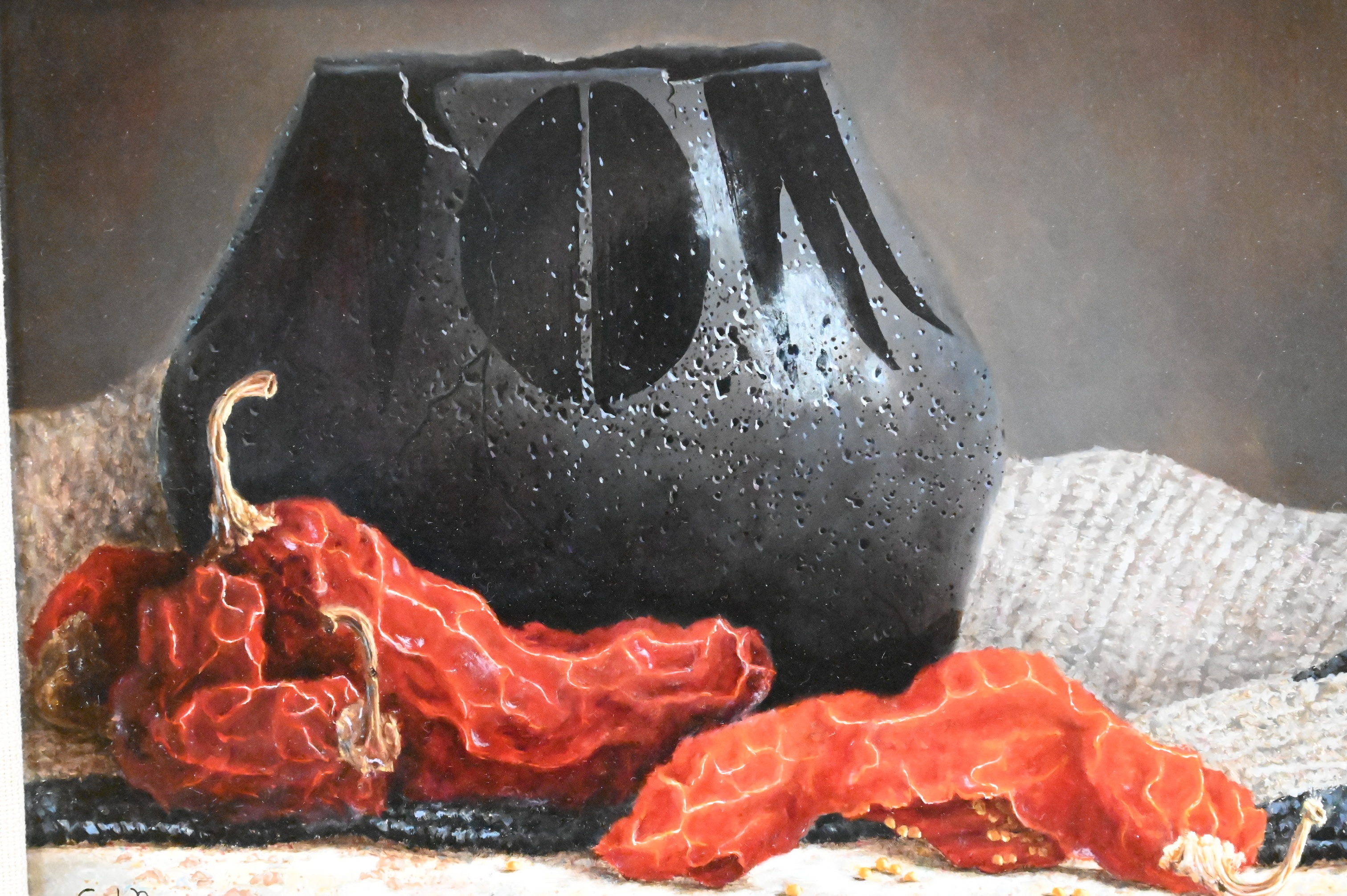 Finely rendered photorealist still life depicting a San Ildefonso–style blackware pot with bead-like condensation on its surface, set beside vividly textured dried red chiles resting on a woven textile; painted with exceptional precision and rich surface detail characteristic of Nason’s work