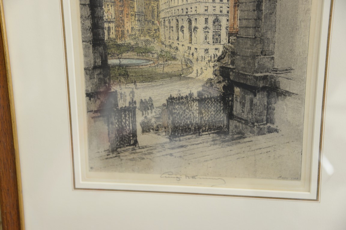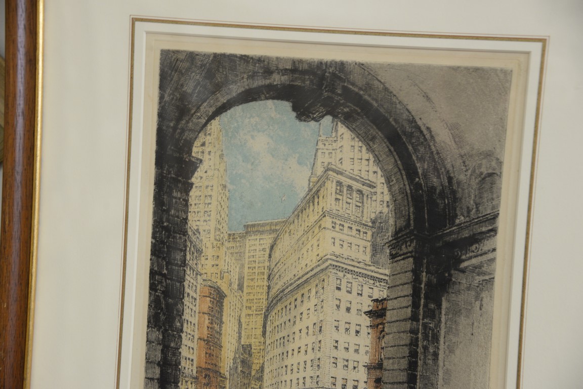 Lot 276: Luigi Kasimir 1881-1962 colored etching, New York Bowling Green Station, pencil signed lower right: Luigi Kasimir Nov. 7th 1927, s…