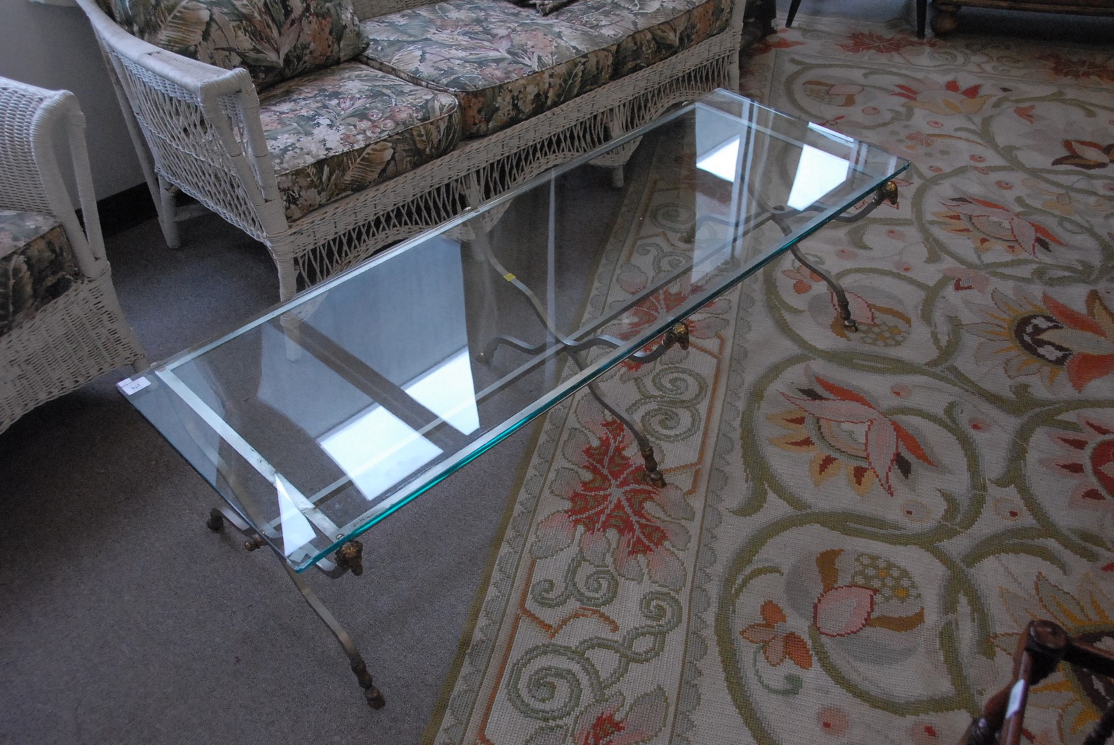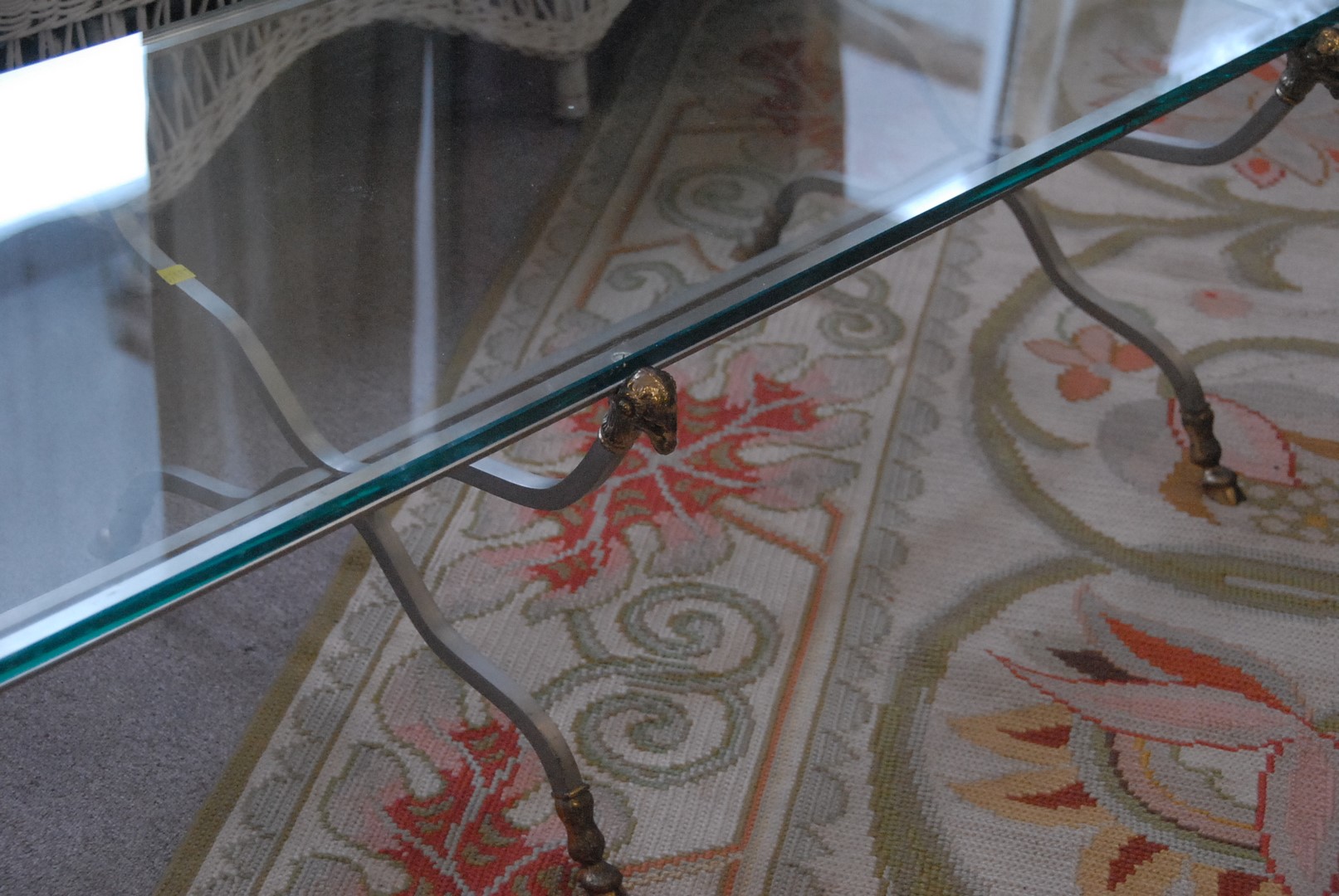 Lot 276: Polish metal and brass rectangle glass top coffee table having hoof feet and six ram’s head ends. ht. 15 1/2 in. wd. 20 in. lg. 60…