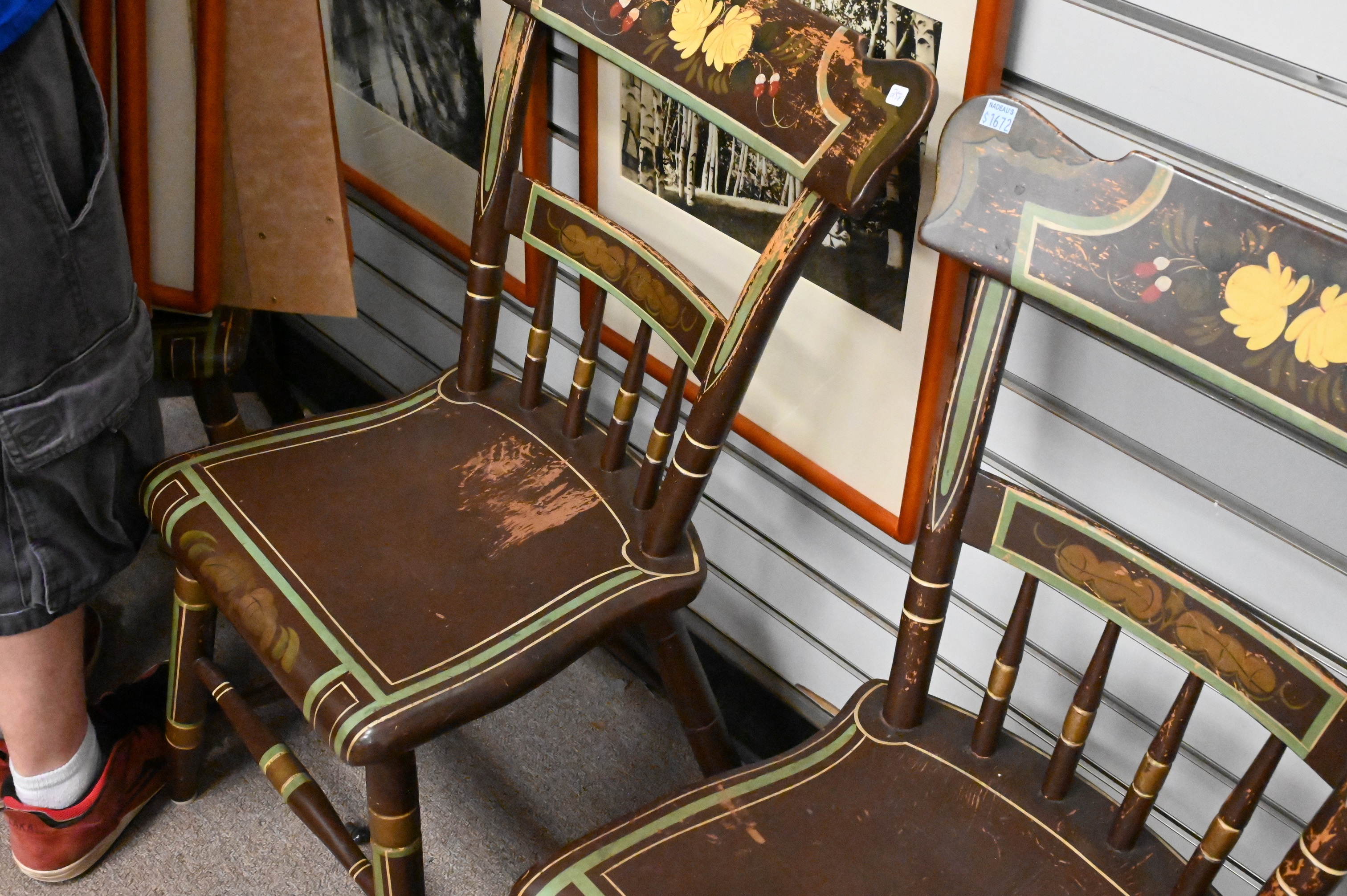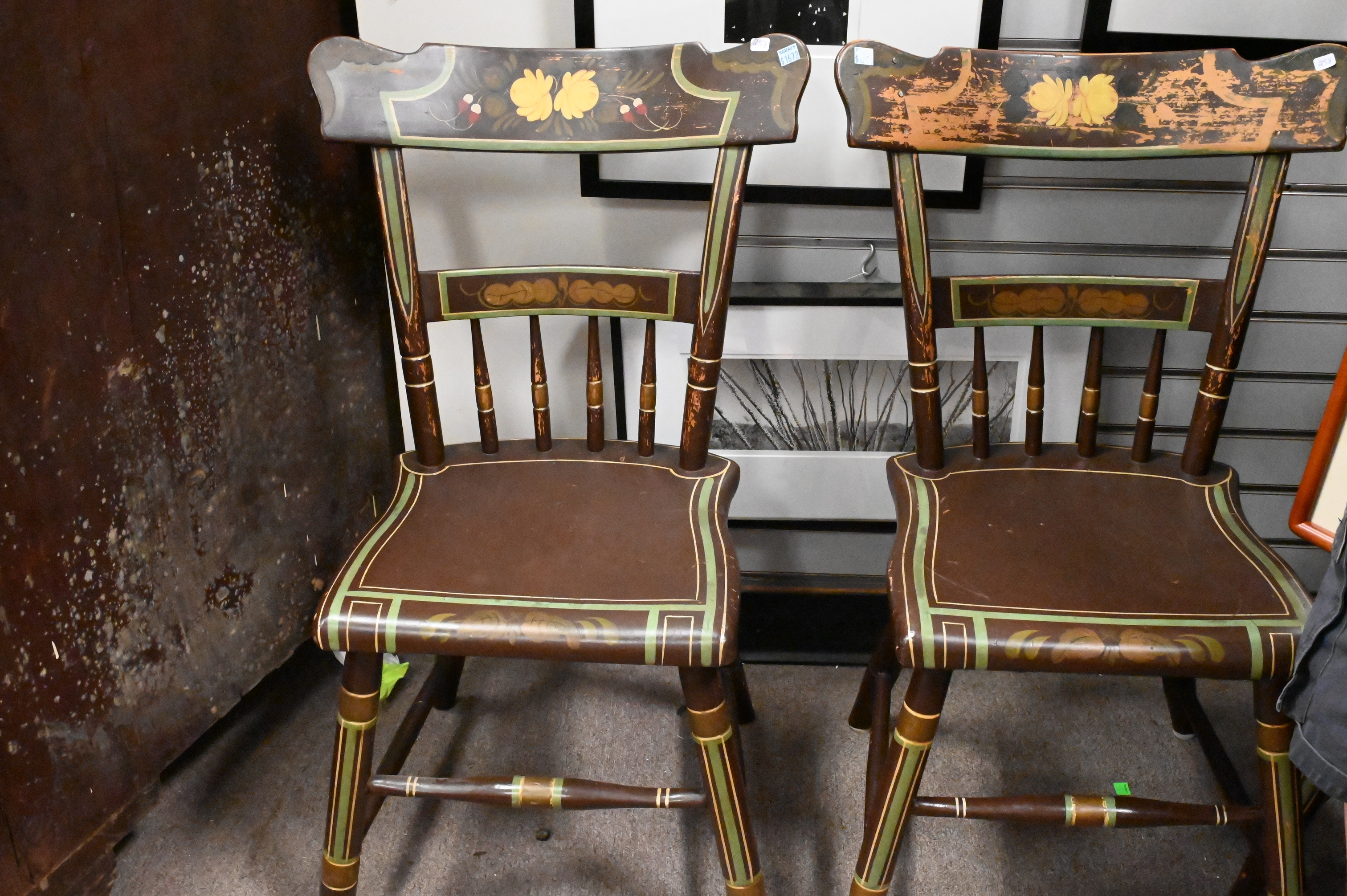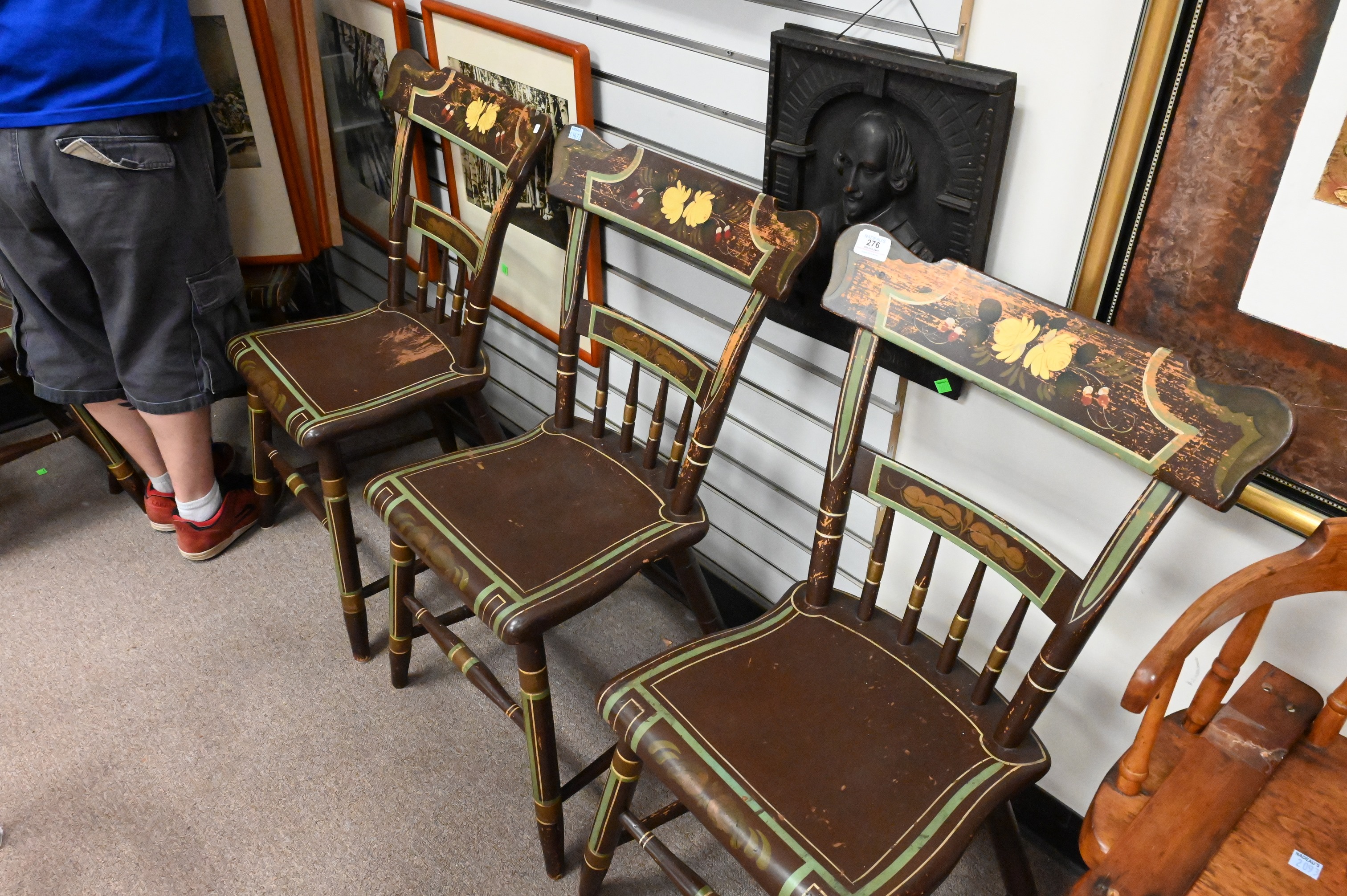 Set of Six Sheraton Plank Seat Chairs, with original paint decor, c. 1840, seat 17 inches, height 32 1/2 inches