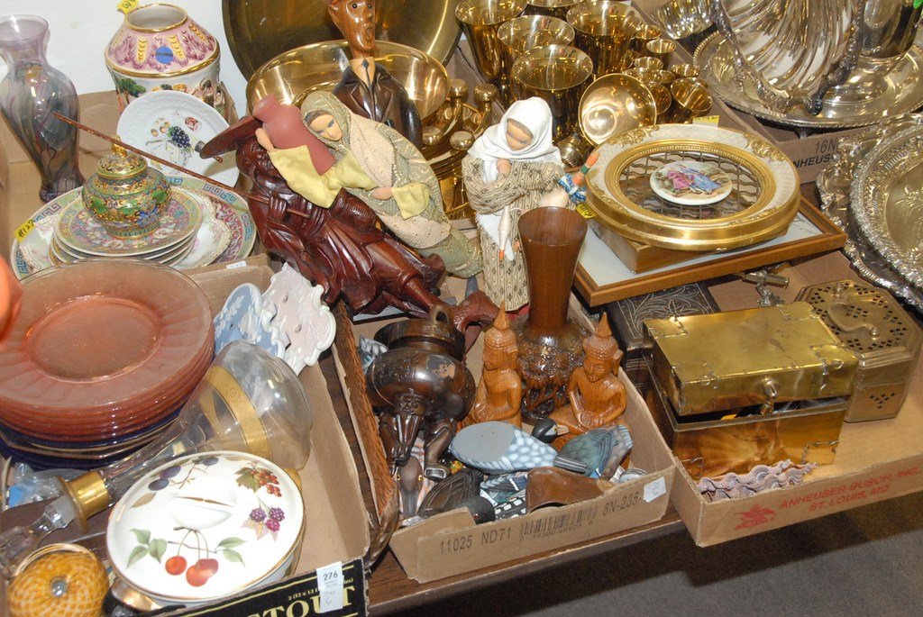 Six box lots brassware, stems, bowls, Chinese style porcelain, depression glass plates, wooden carved figures, brass boxes, etc.