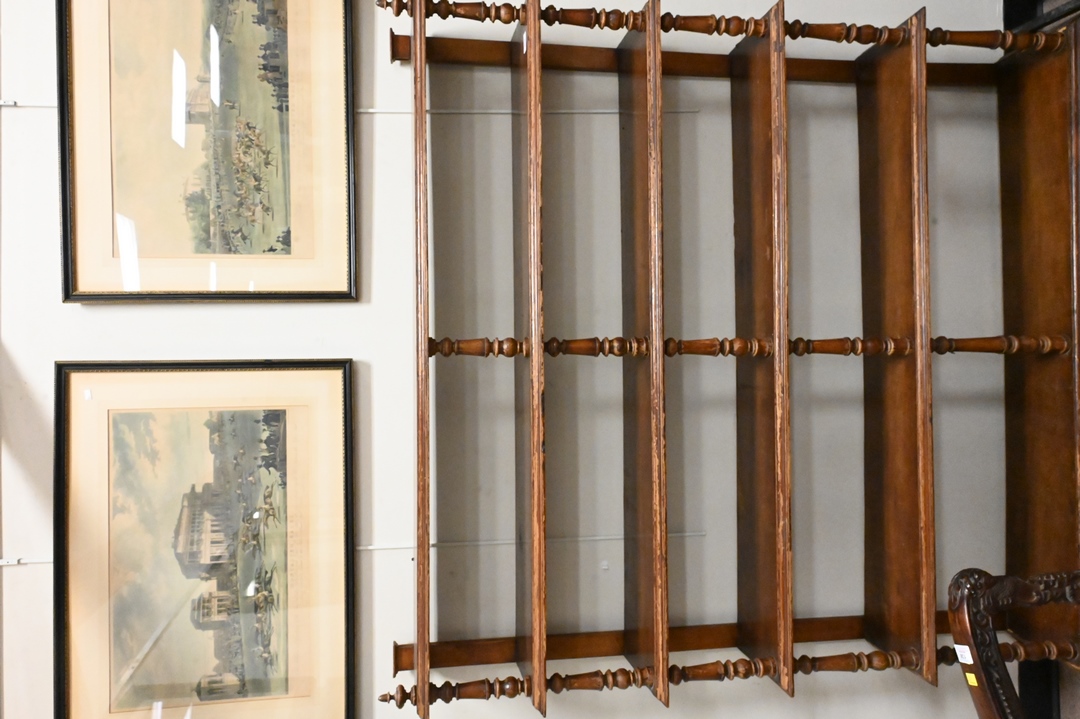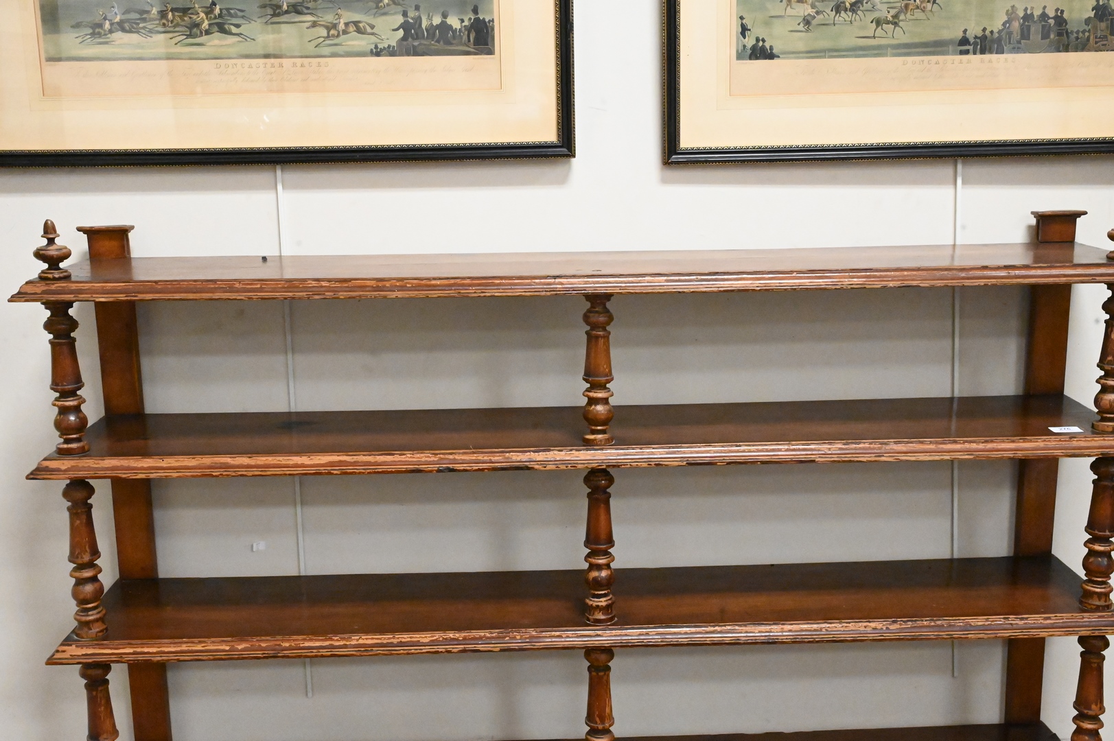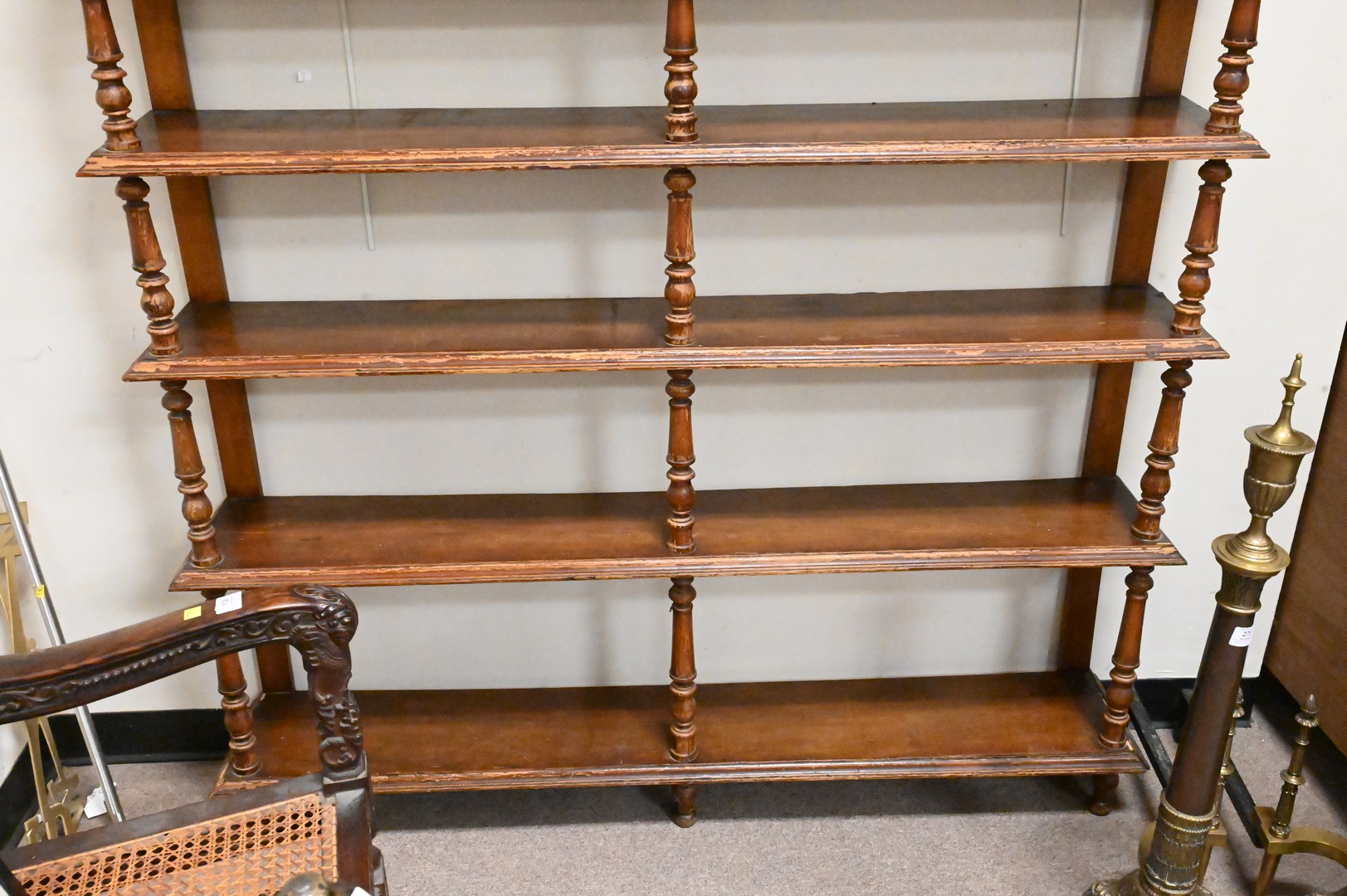 Six Tier Folk Painted Bookcase Etagere, having turned supports, height 64 inches, width 57 inches, depth 9 1/2 inches. Provenance: Estate of Peter Tillou, Litchfield, Connecticut.